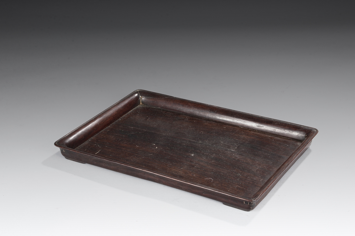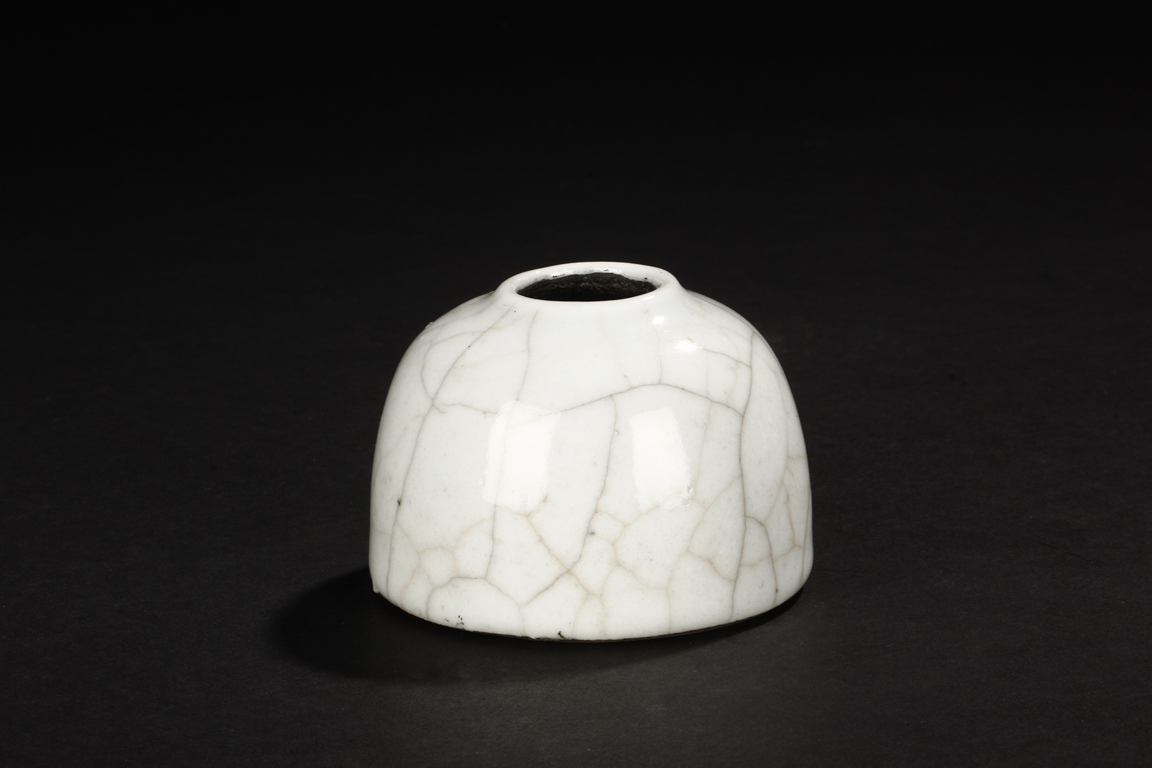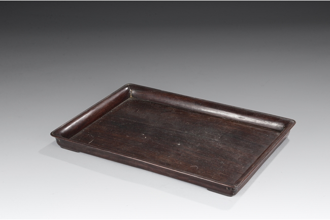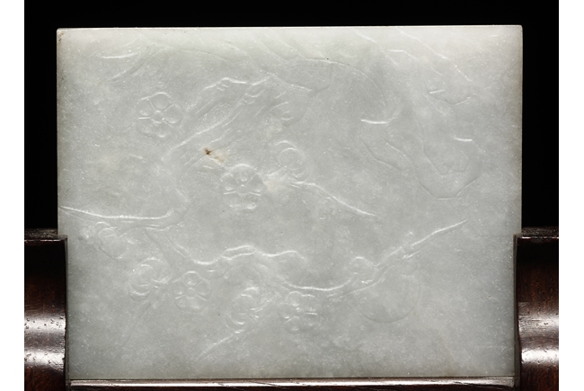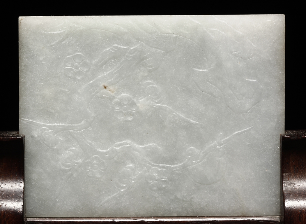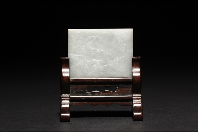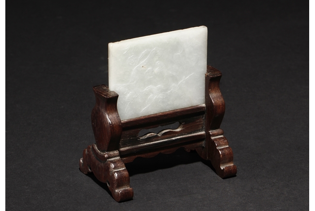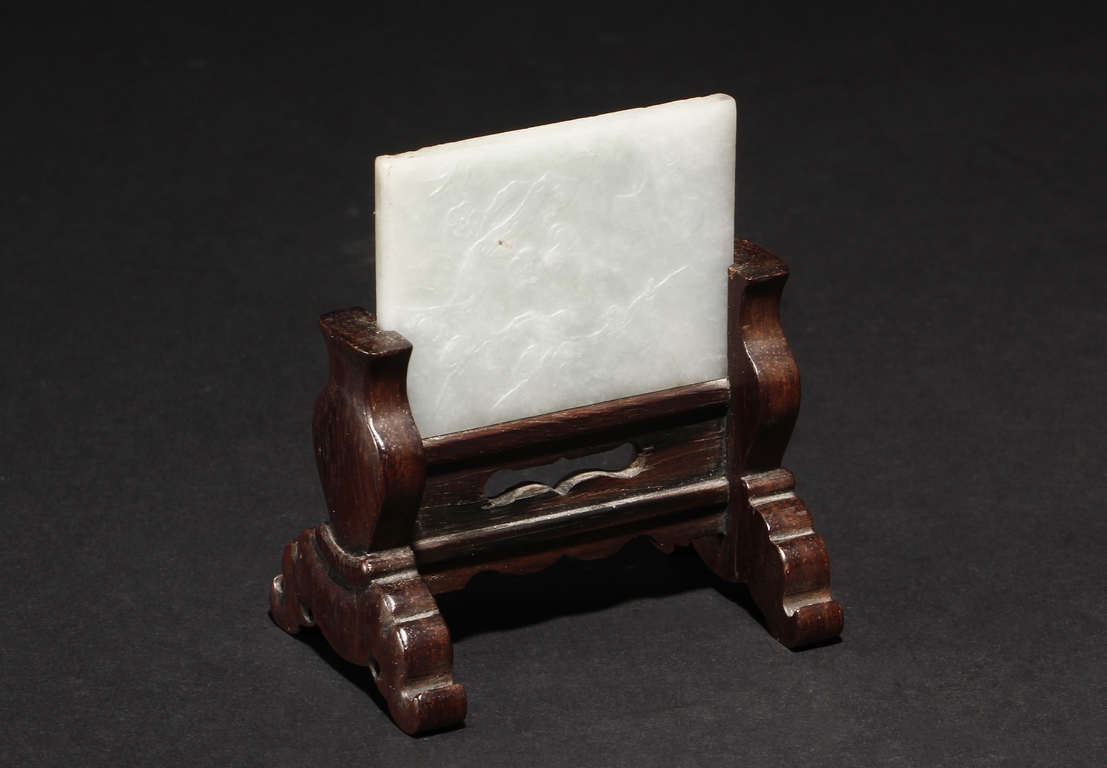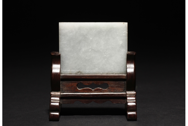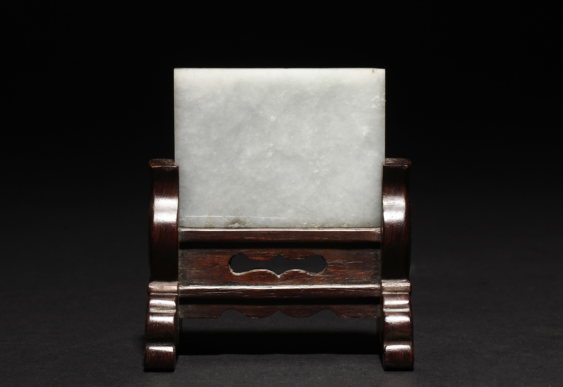 This set includes eight pieces of miniature scholar’s treasures in a huanghuali tray, including a finely carved white jade table screen with low relief plum blossom mounted on a wood stand; a ceramic five-point brush rest modeled in the form of mountain range, covered with grayish-white glaze and suffused with crackles; a flattened cylindrical ivory paper weights delicately incised with flower spray patterns; a domed water pot covered with pale grayish and white-glaze while suffused with crackles; a shoushan soapstone carving of scholar’s rock in irregular shape and outlines; an ink stone of rectangular form with rounded corners, below a stylized ‘shou’ medallion amidst intricate low-relief key-fret and scrolling patterns in the model of a vessel’s flaring neck, flanked by two delicately carved elephant head, along with a wood box. Qing Dynasty period.