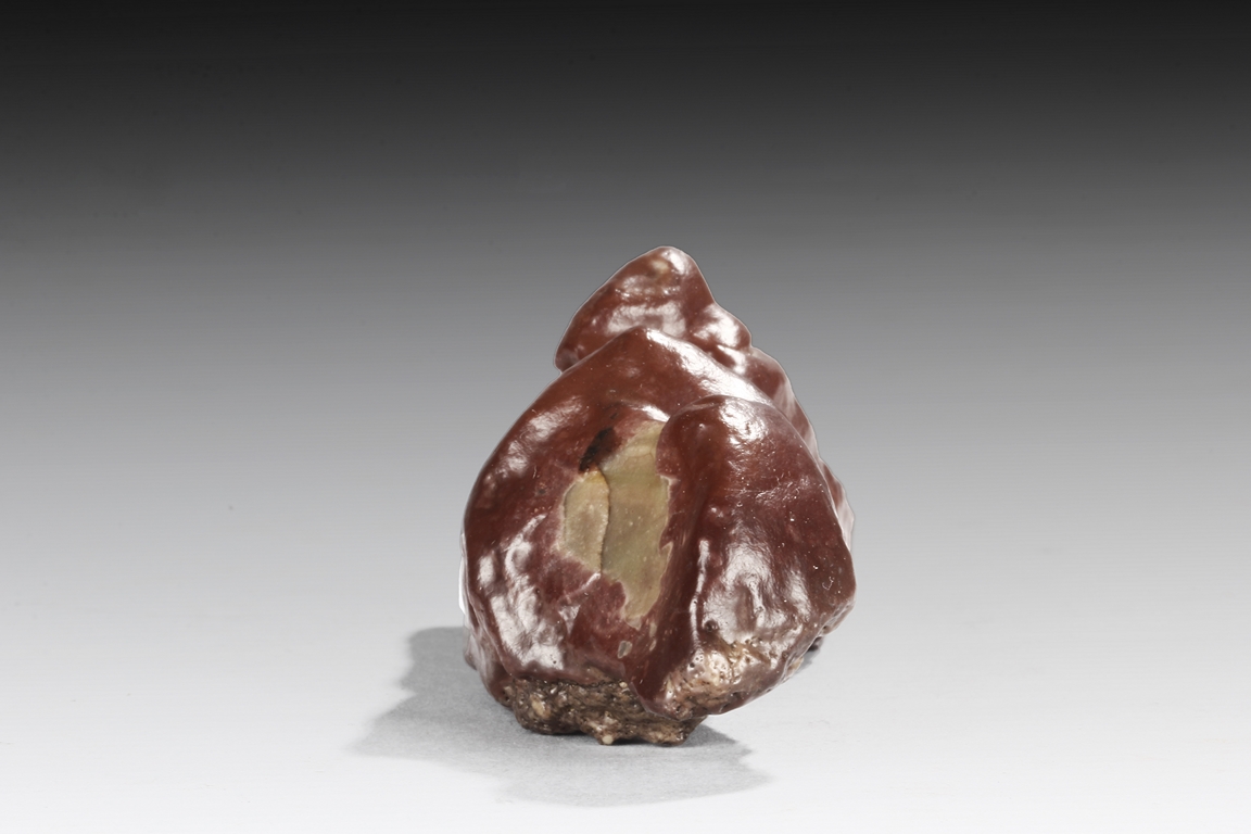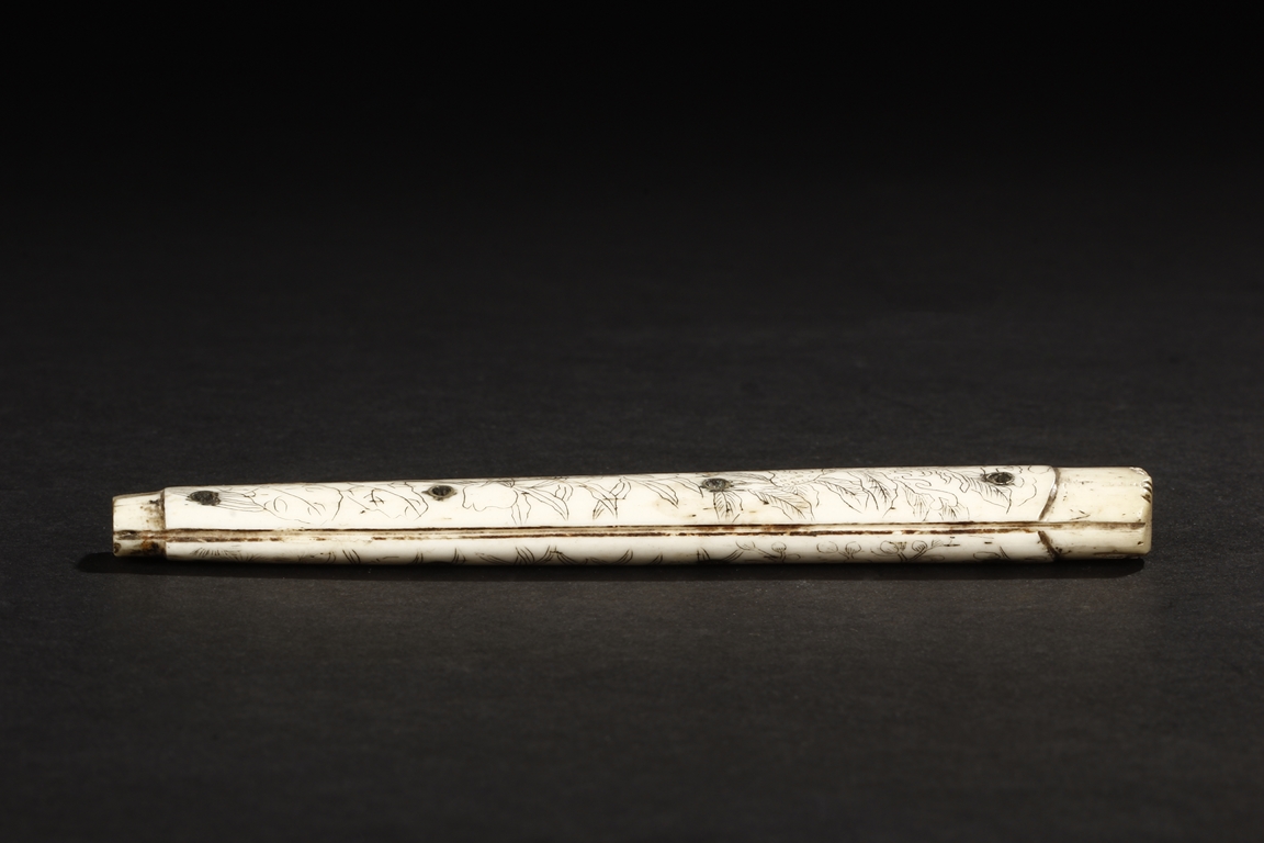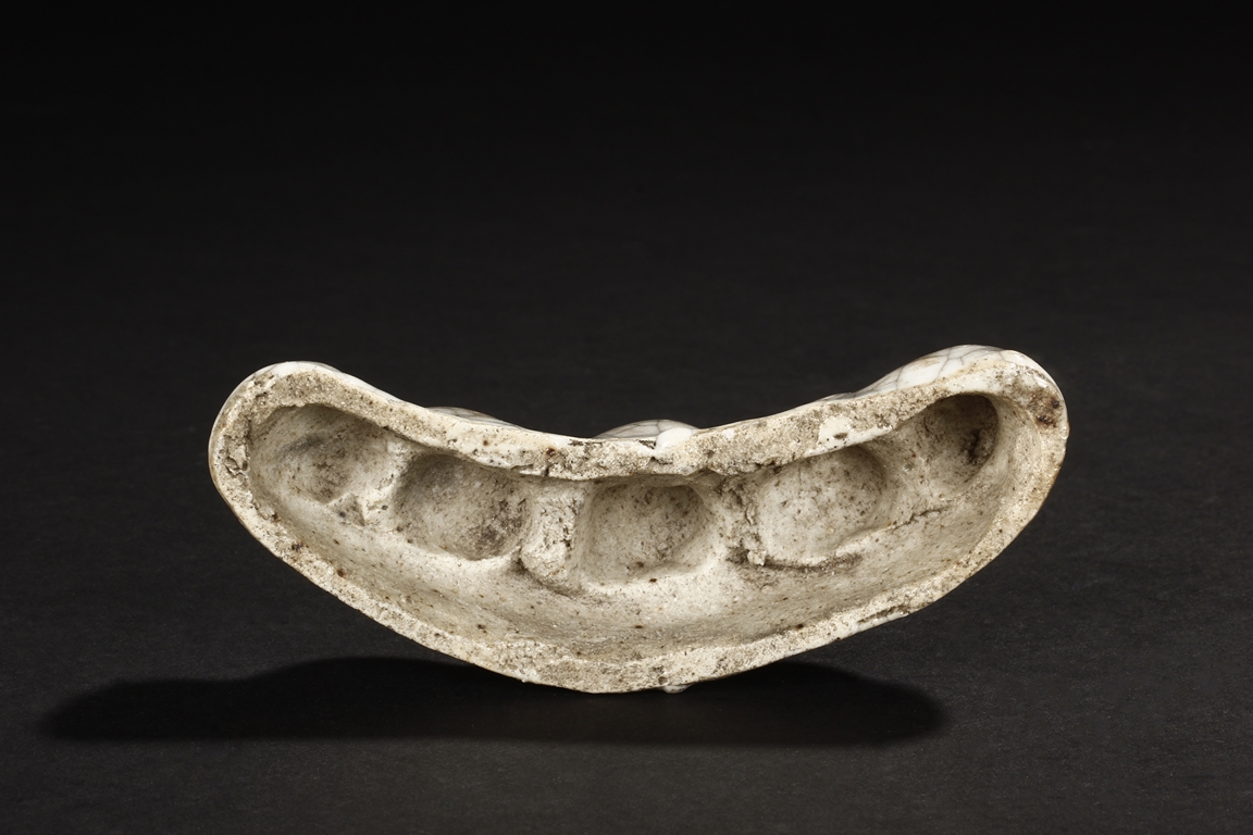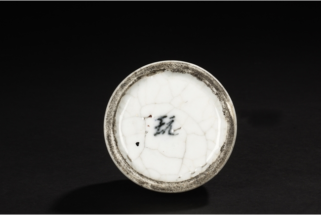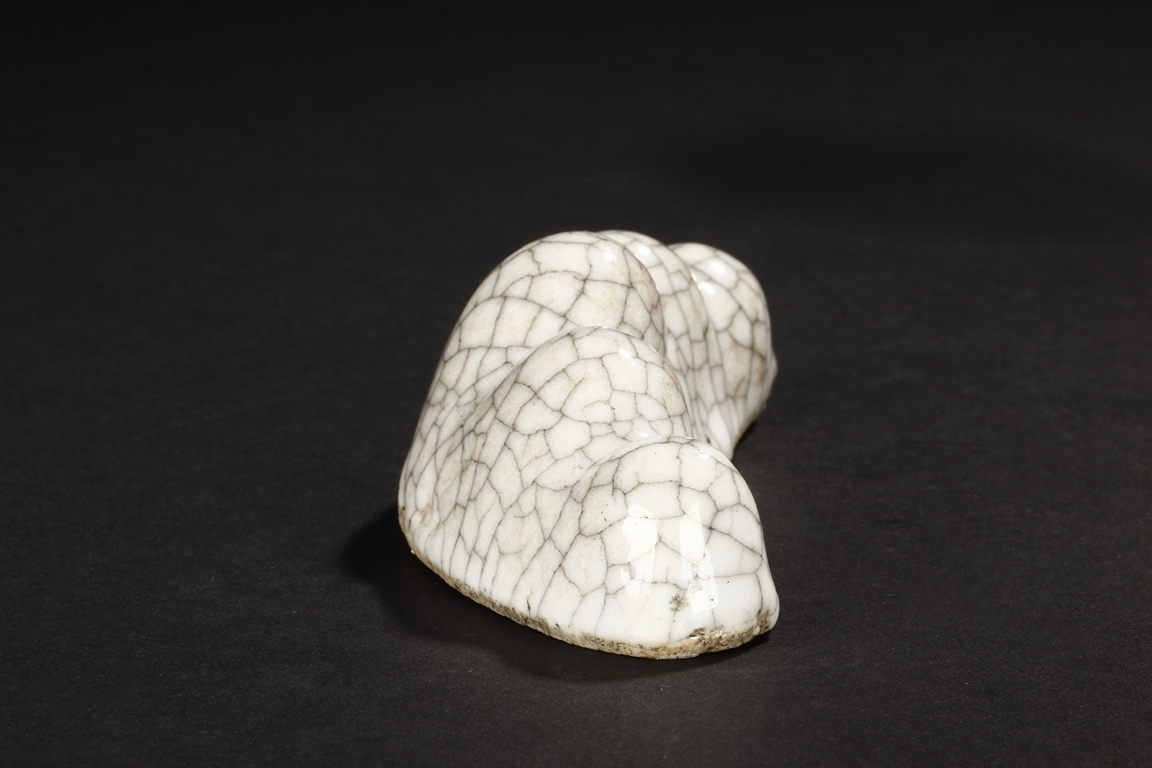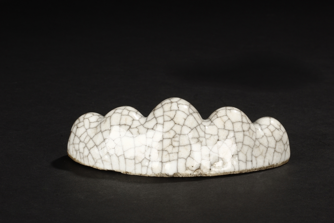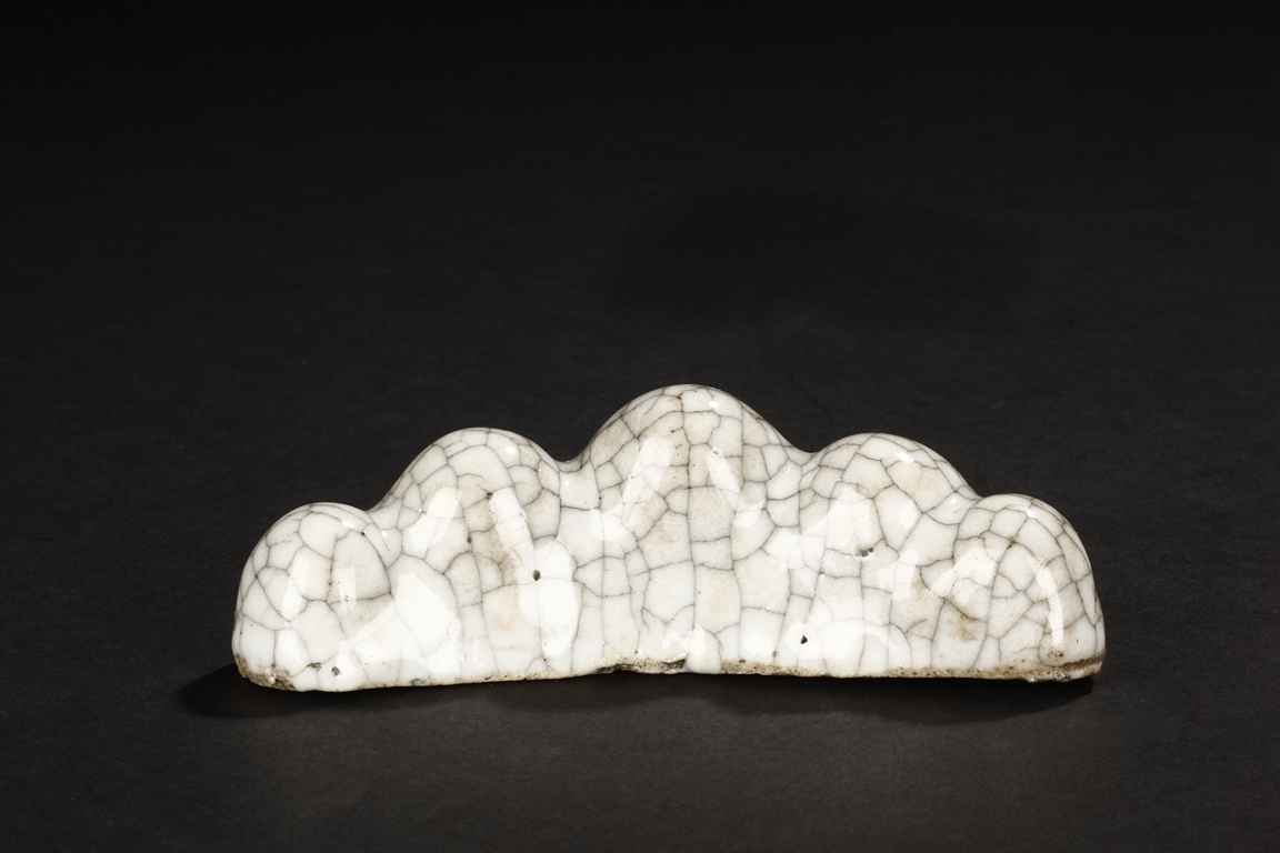 This set includes eight pieces of miniature scholar’s treasures in a huanghuali tray, including a finely carved white jade table screen with low relief plum blossom mounted on a wood stand; a ceramic five-point brush rest modeled in the form of mountain range, covered with grayish-white glaze and suffused with crackles; a flattened cylindrical ivory paper weights delicately incised with flower spray patterns; a domed water pot covered with pale grayish and white-glaze while suffused with crackles; a shoushan soapstone carving of scholar’s rock in irregular shape and outlines; an ink stone of rectangular form with rounded corners, below a stylized ‘shou’ medallion amidst intricate low-relief key-fret and scrolling patterns in the model of a vessel’s flaring neck, flanked by two delicately carved elephant head, along with a wood box. Qing Dynasty period.