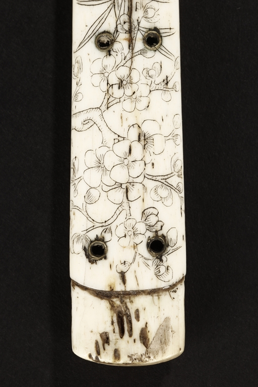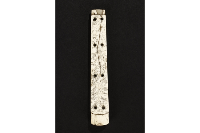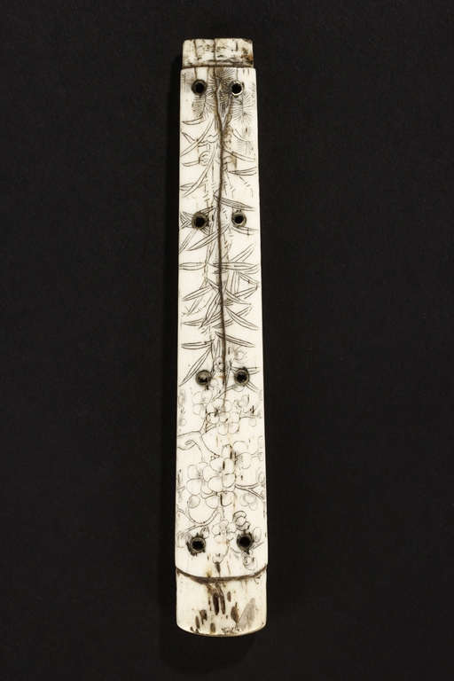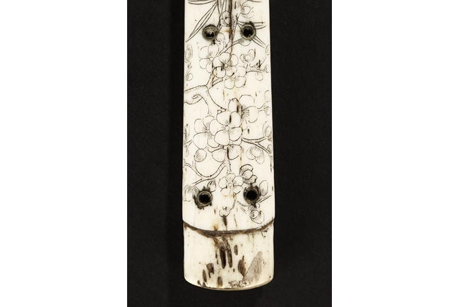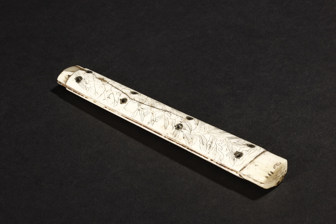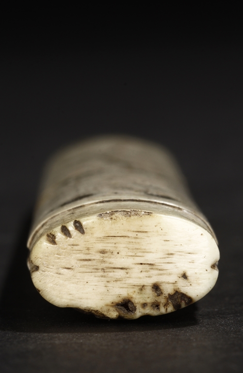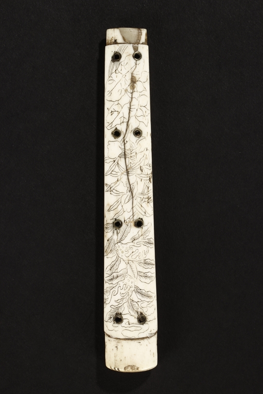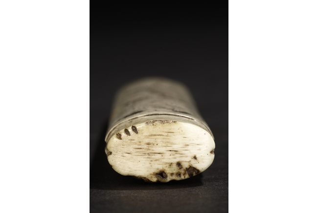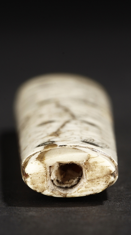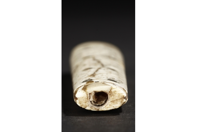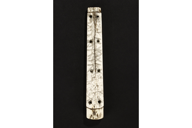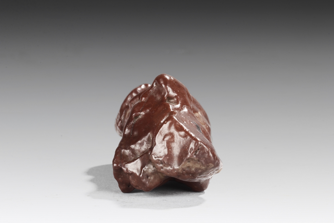 This set includes eight pieces of miniature scholar’s treasures in a huanghuali tray, including a finely carved white jade table screen with low relief plum blossom mounted on a wood stand; a ceramic five-point brush rest modeled in the form of mountain range, covered with grayish-white glaze and suffused with crackles; a flattened cylindrical ivory paper weights delicately incised with flower spray patterns; a domed water pot covered with pale grayish and white-glaze while suffused with crackles; a shoushan soapstone carving of scholar’s rock in irregular shape and outlines; an ink stone of rectangular form with rounded corners, below a stylized ‘shou’ medallion amidst intricate low-relief key-fret and scrolling patterns in the model of a vessel’s flaring neck, flanked by two delicately carved elephant head, along with a wood box. Qing Dynasty period.