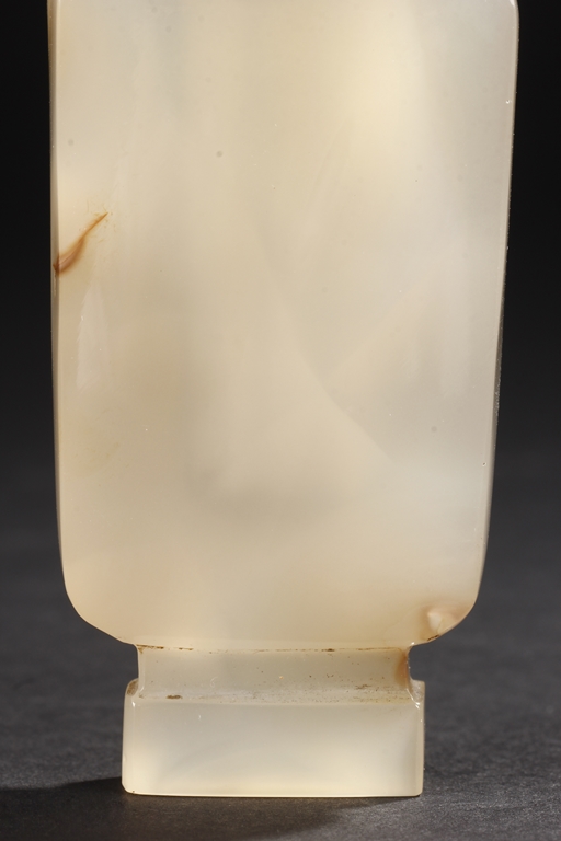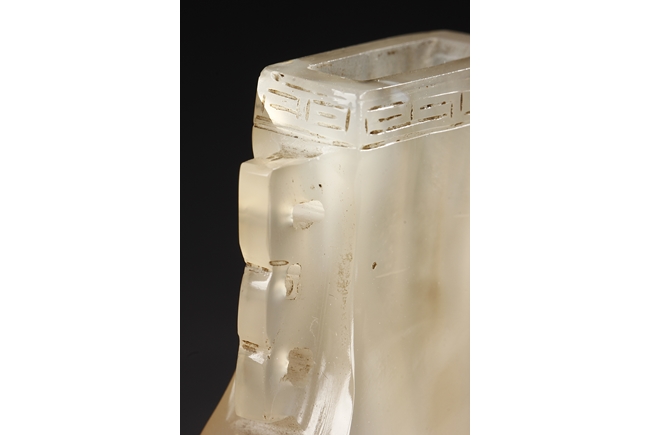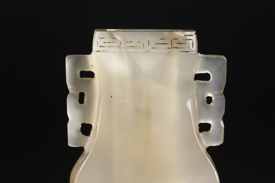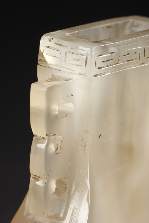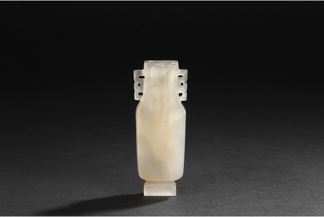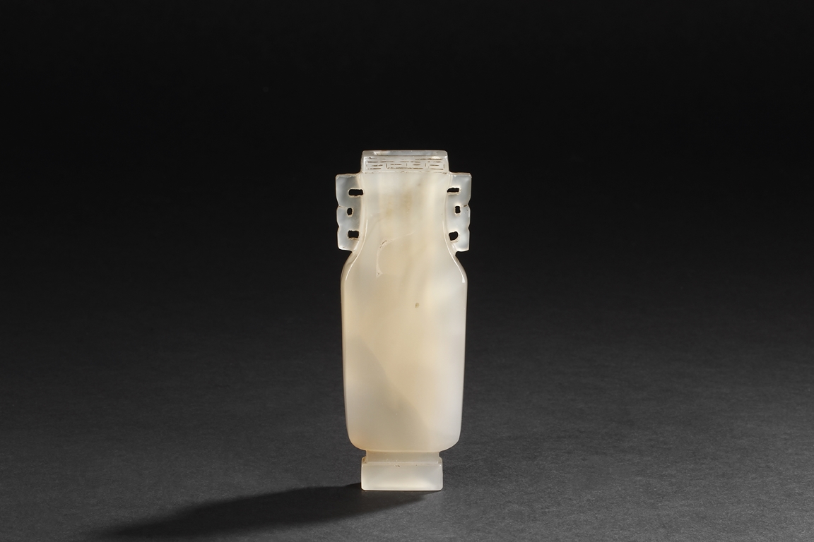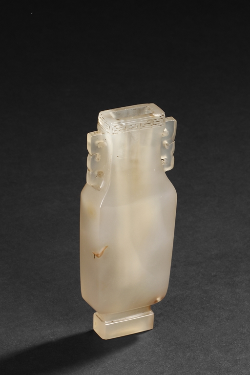 Of slender rectangular section, this white agate vase is supported by a rectangular base and the body rises to an angled shoulder and waisted neck flanked by two openwork handles. The mouth rim is finely incised with key-fret patterns. The stone is of translucent pale grayish tone with slight russet inclusion. Qing Dynasty Period.