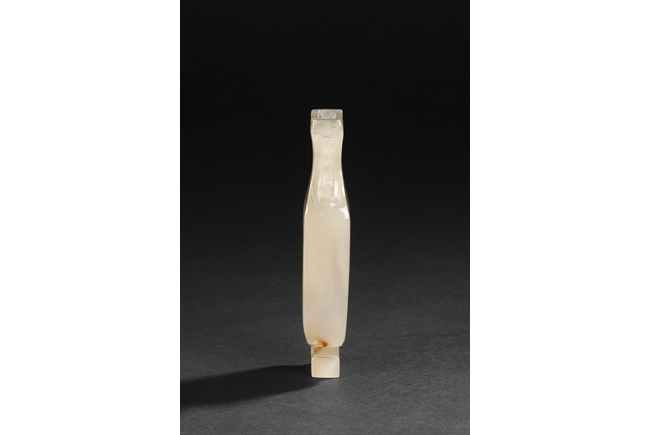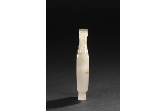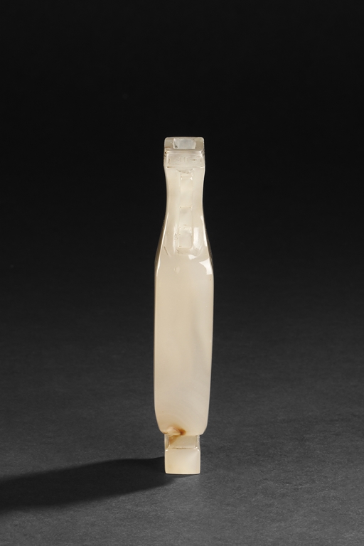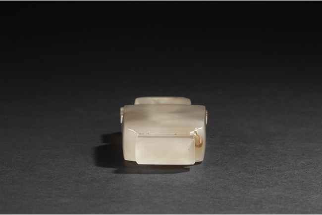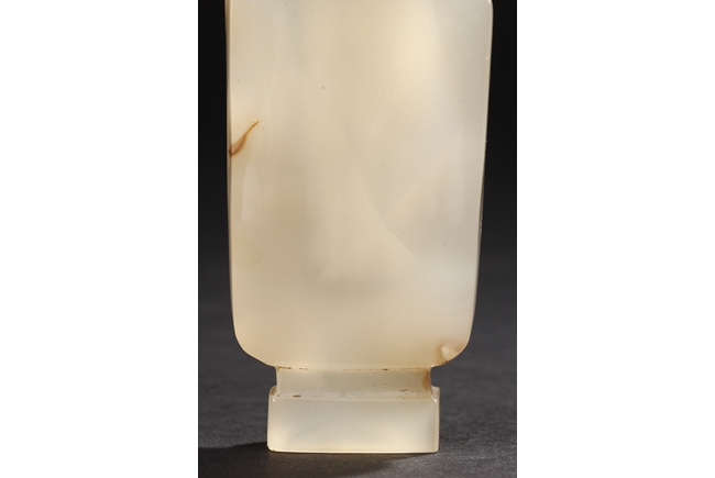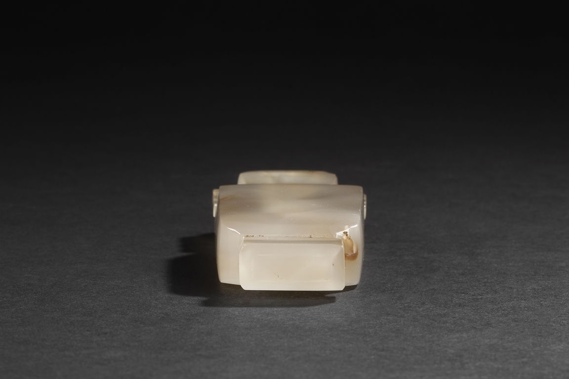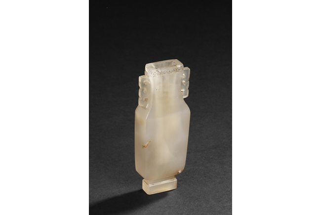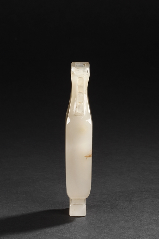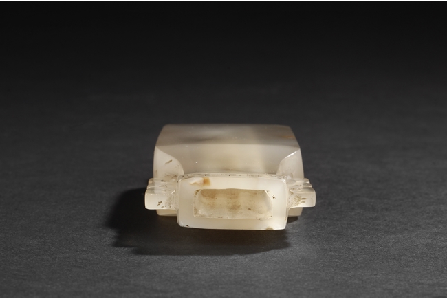 Of slender rectangular section, this white agate vase is supported by a rectangular base and the body rises to an angled shoulder and waisted neck flanked by two openwork handles. The mouth rim is finely incised with key-fret patterns. The stone is of translucent pale grayish tone with slight russet inclusion. Qing Dynasty Period.