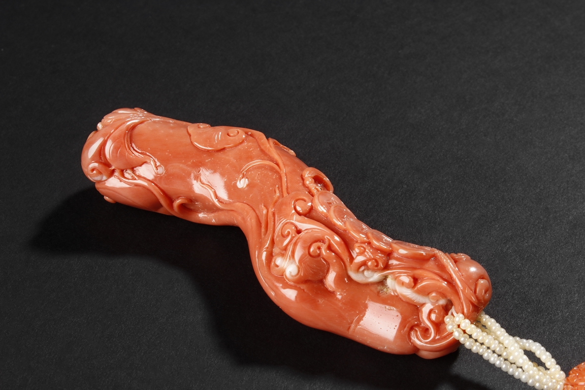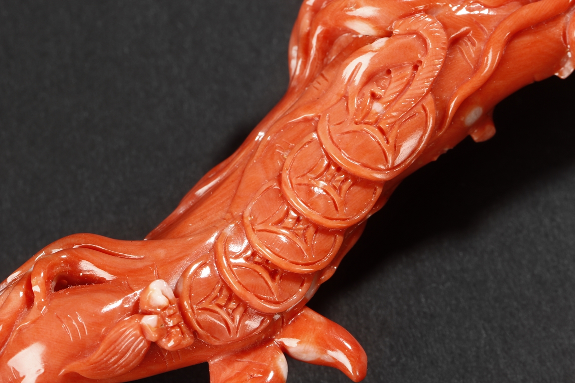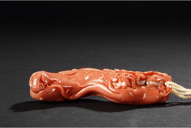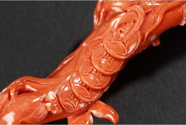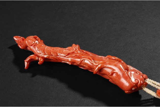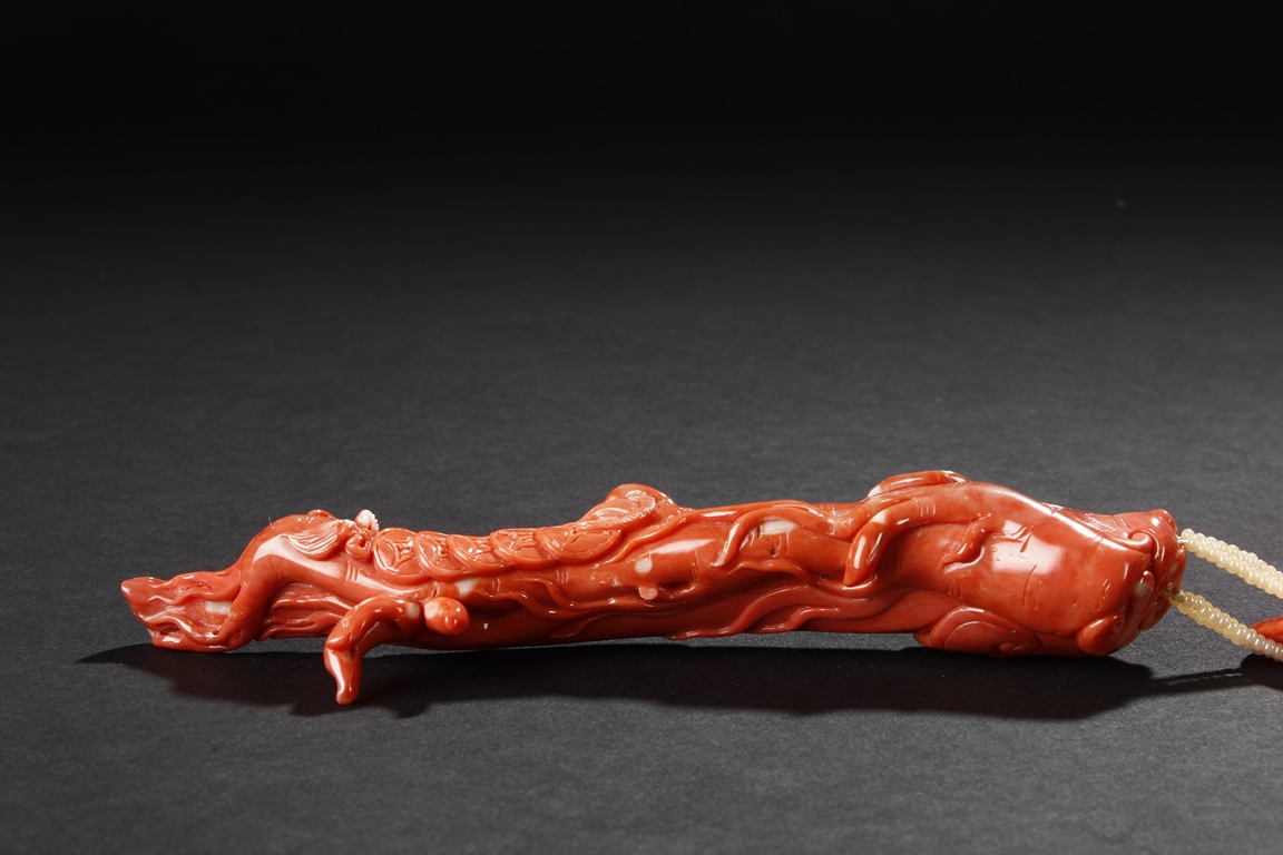 此珊瑚如意人生,色澤鮮豔,雕工精細,為珊瑚雕中上乘品