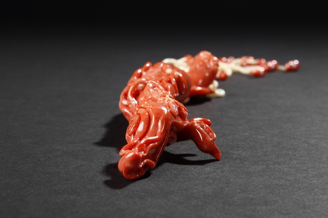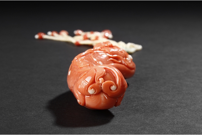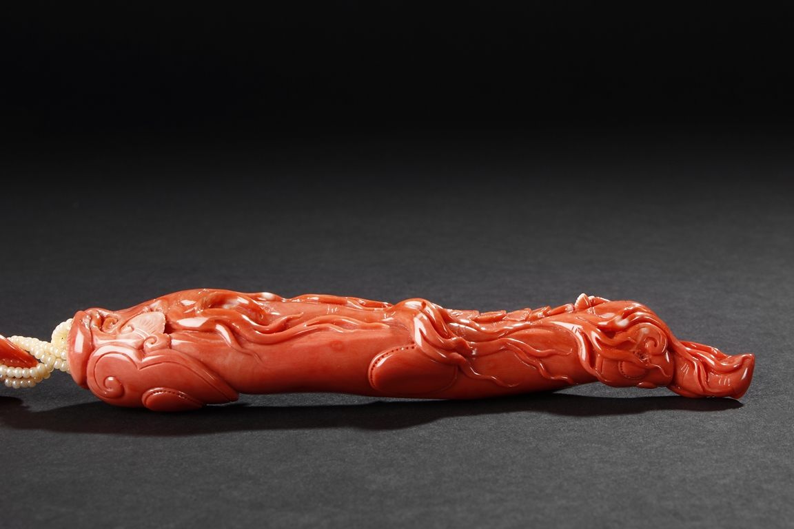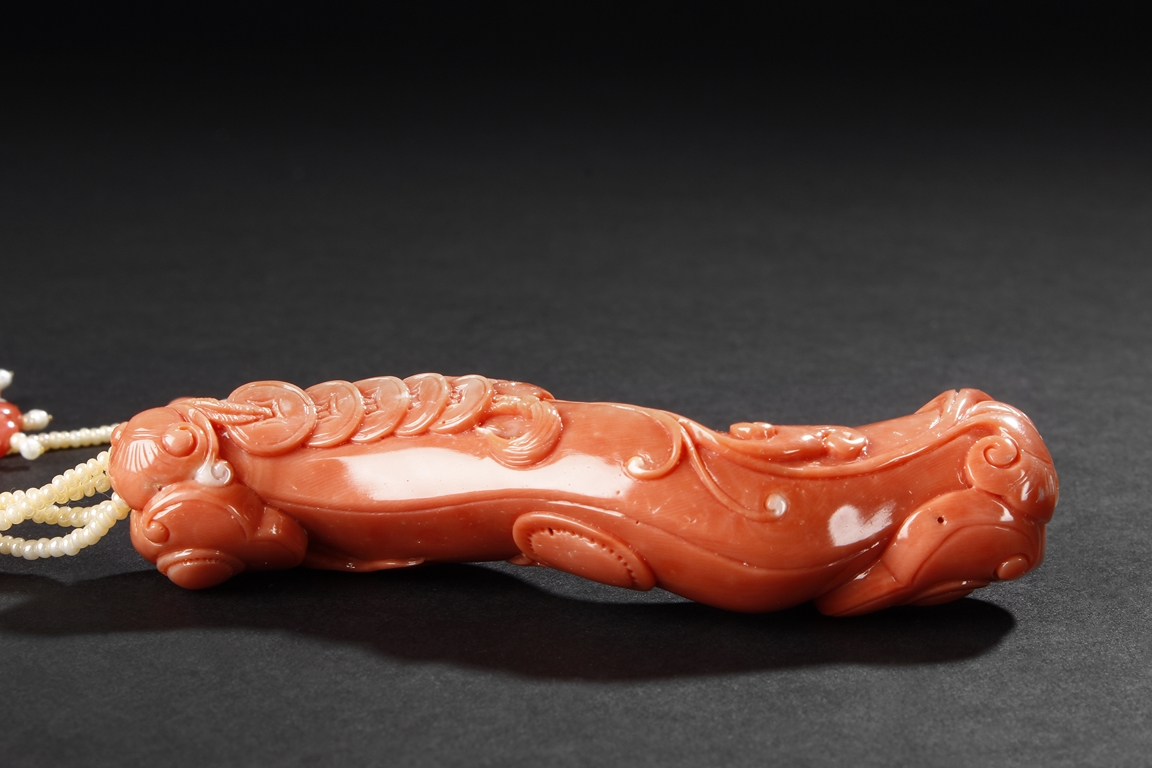 此珊瑚如意人生,色澤鮮豔,雕工精細,為珊瑚雕中上乘品