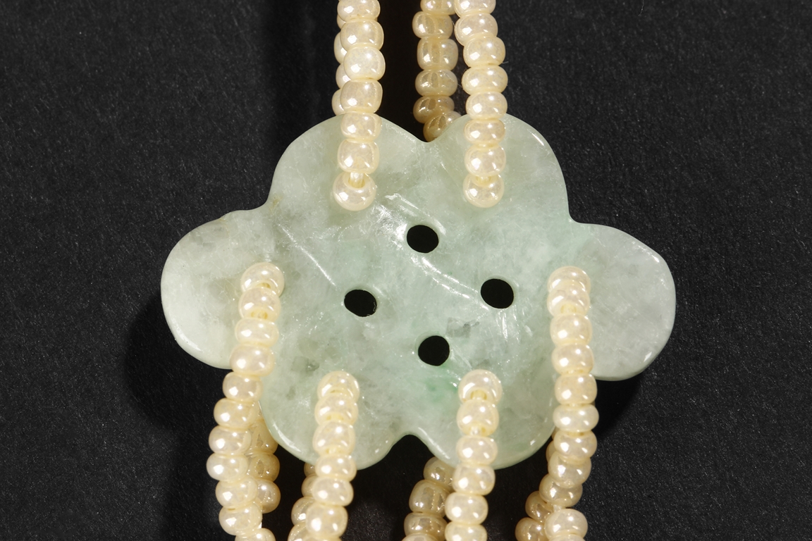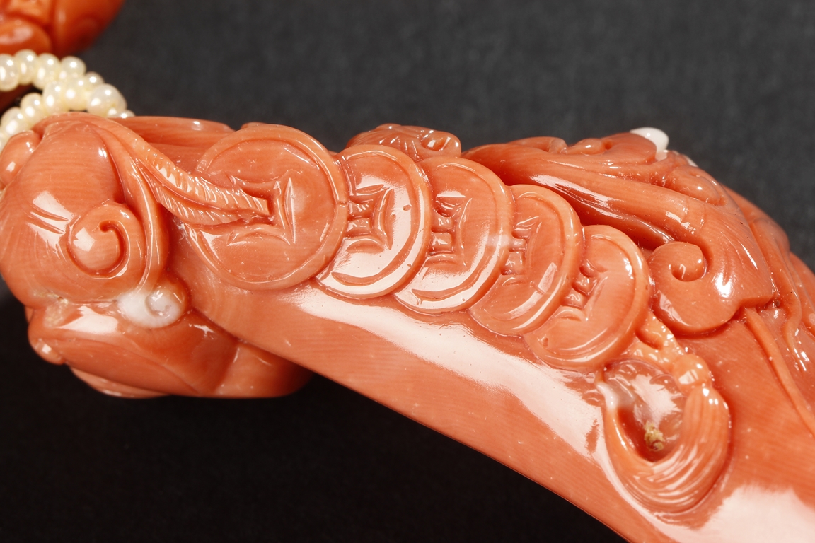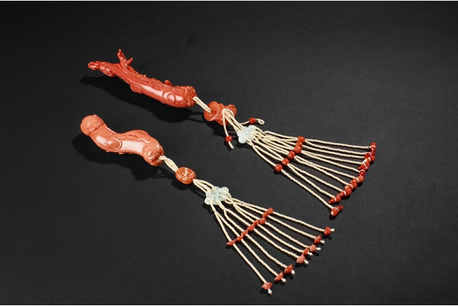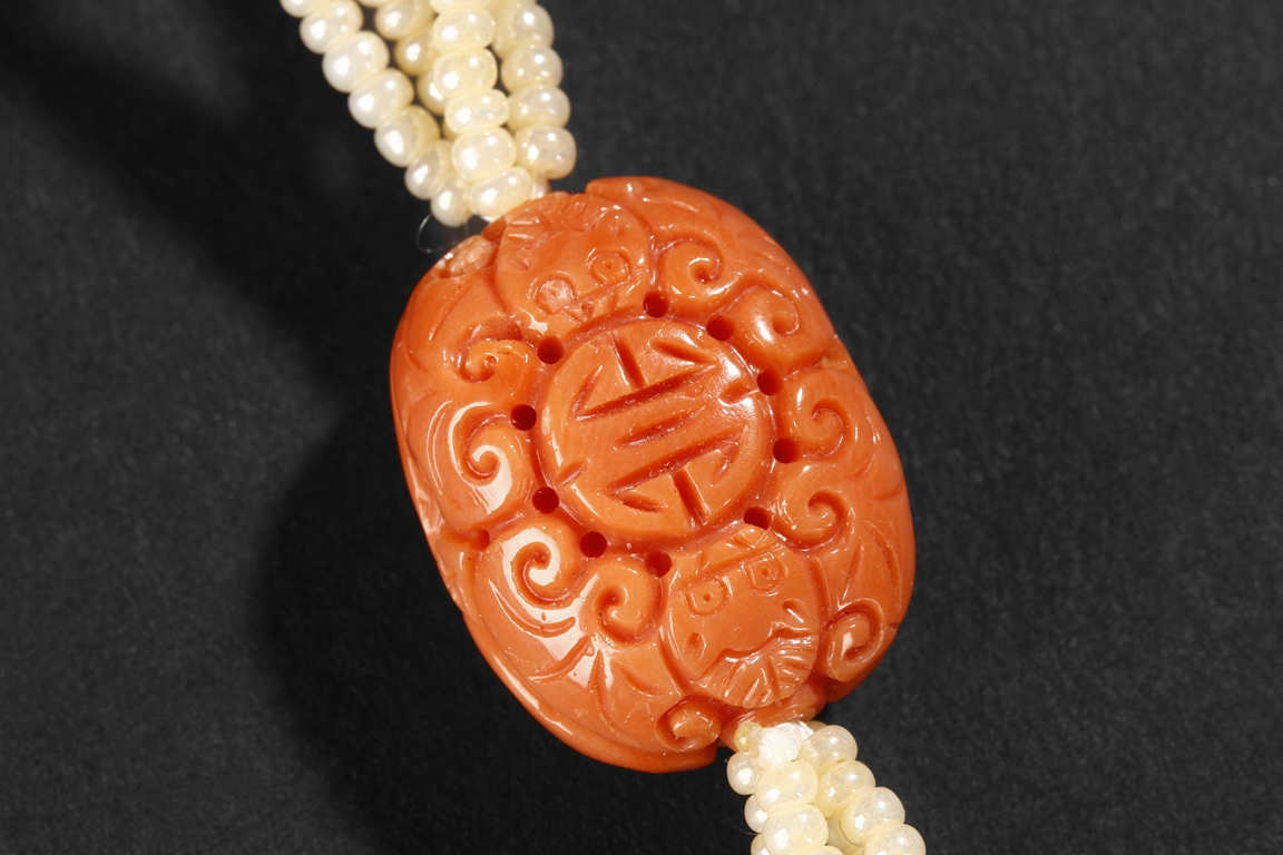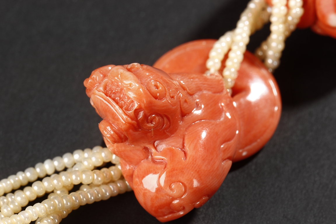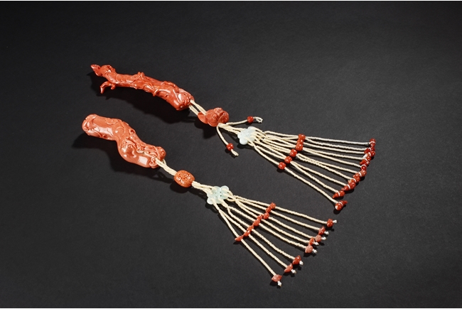 The two coral carving each depicts a well-tendriled ginseng, decorated with auspicious items such as coins and ruyi, stranded with small coral beads, leading to a smaller intricately carved coral decoration, a floriform jade carving, and multiple pearl strands and smaller coral carvings in form of gourd, gold ingots, and beads. The carvings signify a prosperous life, as in Chinese "Ru Yi Ren Sheng". Qing Dynasty Period.