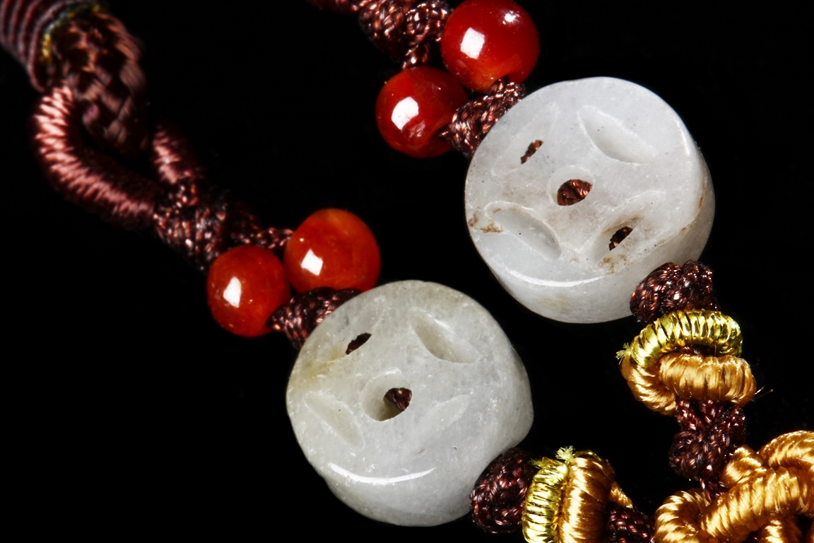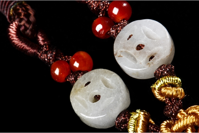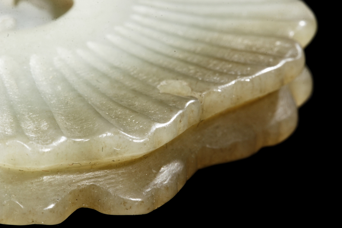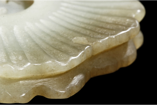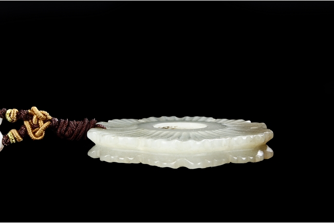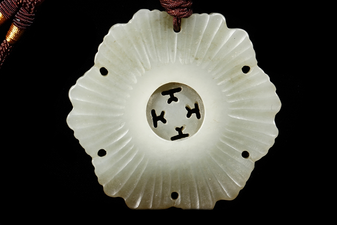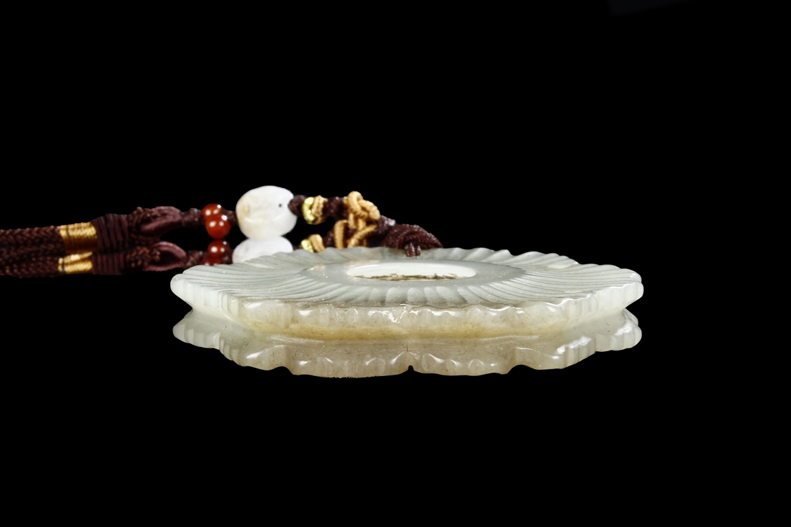 Of double Wutong flower form, pendant pierce carved in the center and lightly carved on the surface, the stone of white with slight russet, attached to a double string with small coin shaped jade pieces. Qing Dynasty Period.