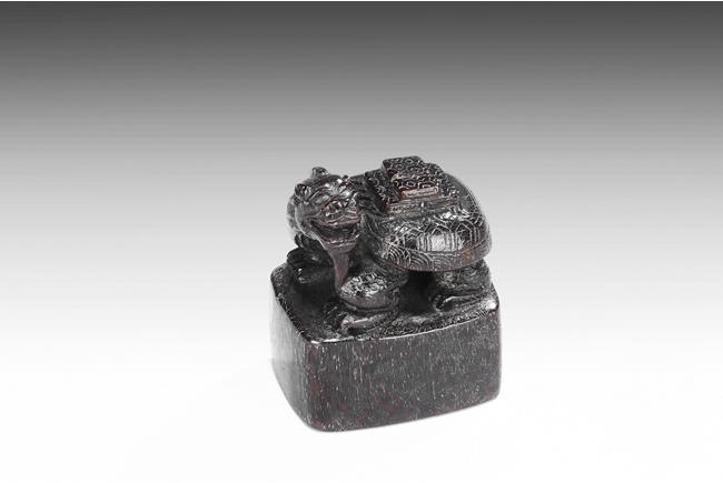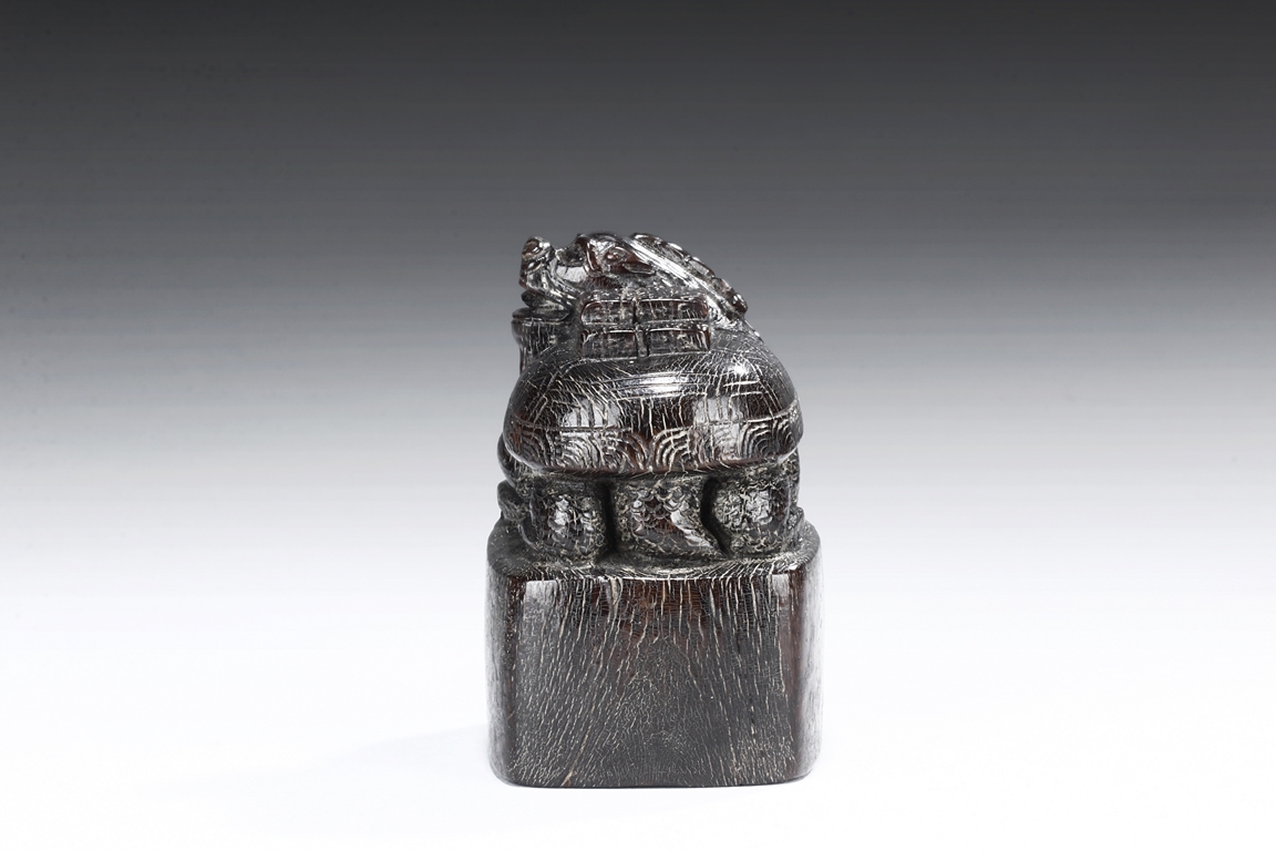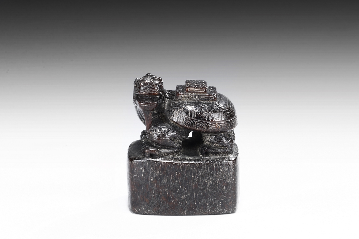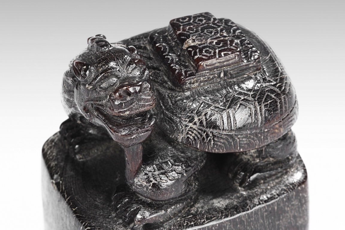 Of rectangular form, the stamp seal carved from horn, depicting a mythical turtle with dragon's head mounted on top, the head turned to the left, and carrying a stack of items on its back, the scaly claws rooted firmly on the ground, the bottom carved with four Chinese characters "Fu Ru Dong Hai", signifying longevity. Qing Dynasty period.