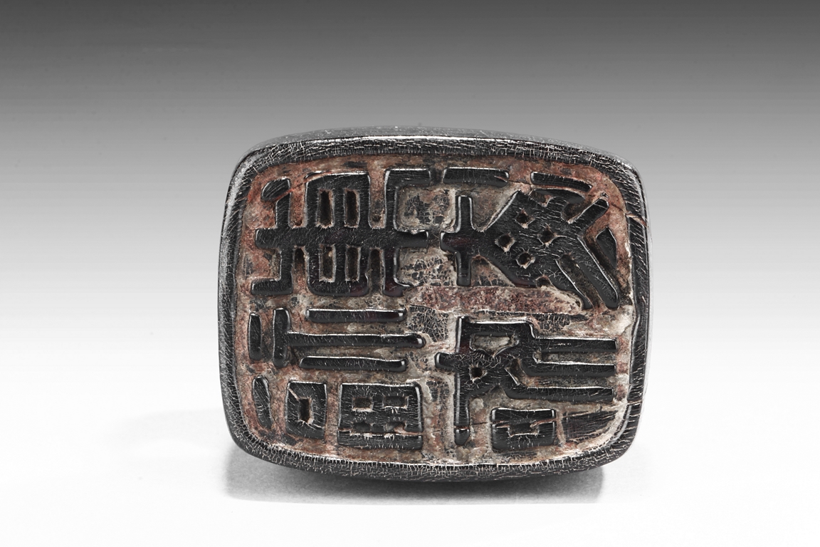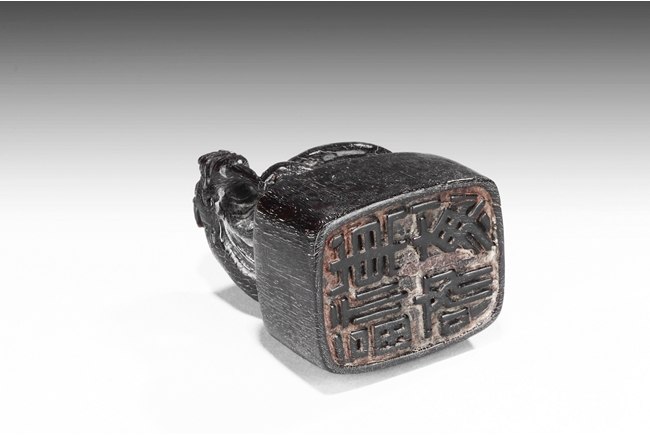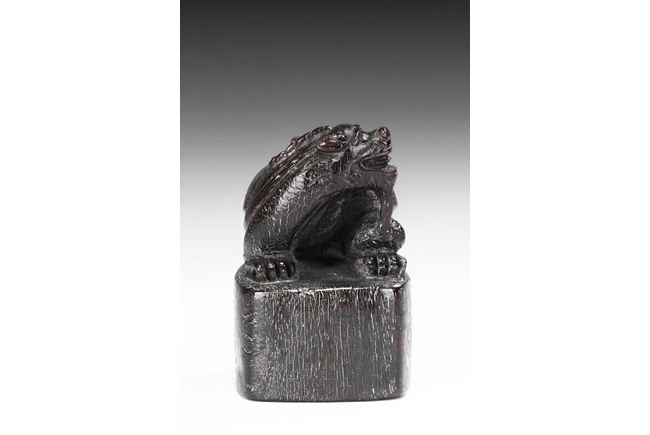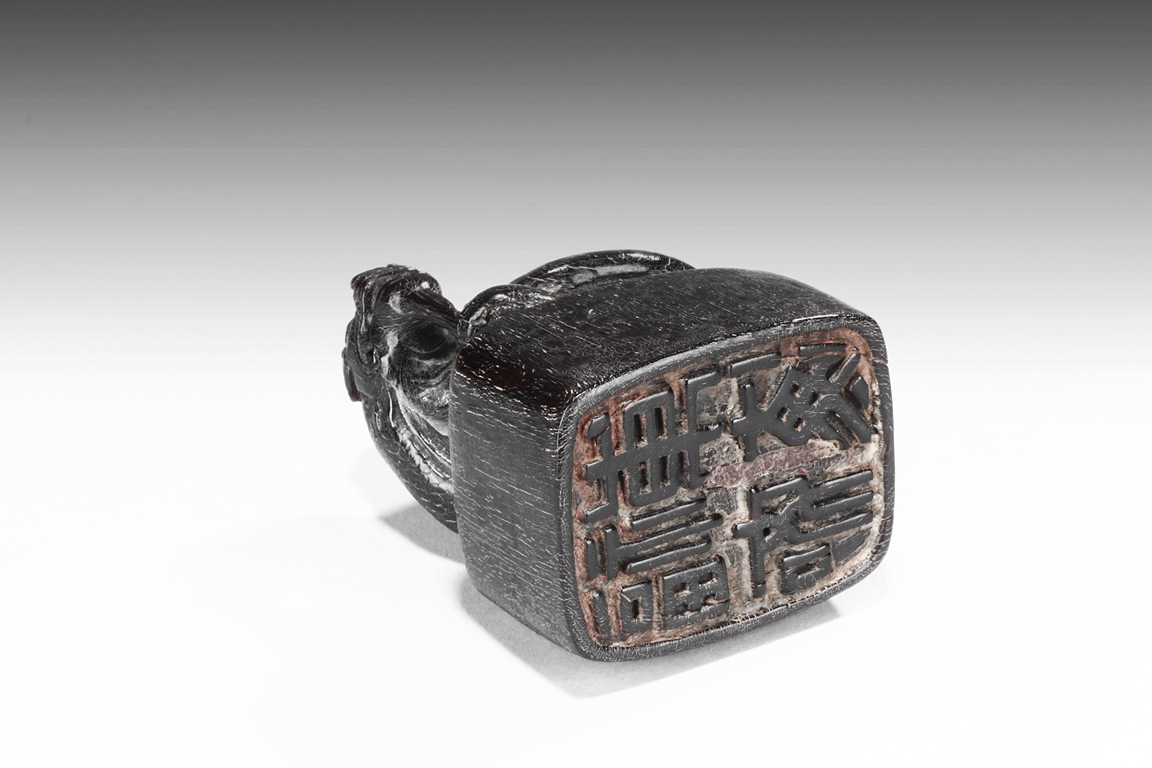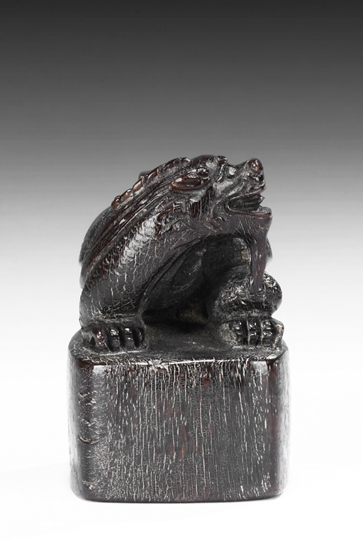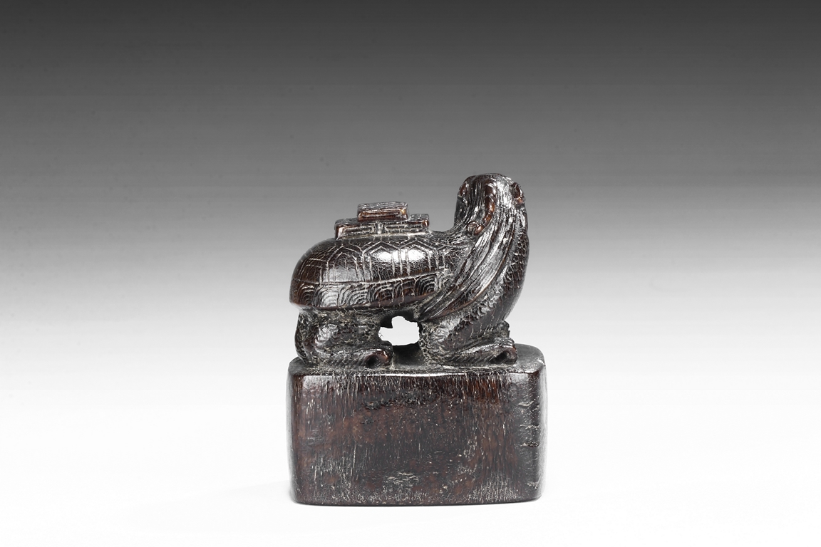 Of rectangular form, the stamp seal carved from horn, depicting a mythical turtle with dragon's head mounted on top, the head turned to the left, and carrying a stack of items on its back, the scaly claws rooted firmly on the ground, the bottom carved with four Chinese characters "Fu Ru Dong Hai", signifying longevity. Qing Dynasty period.
