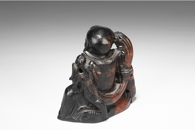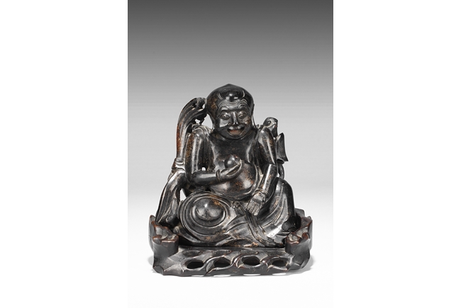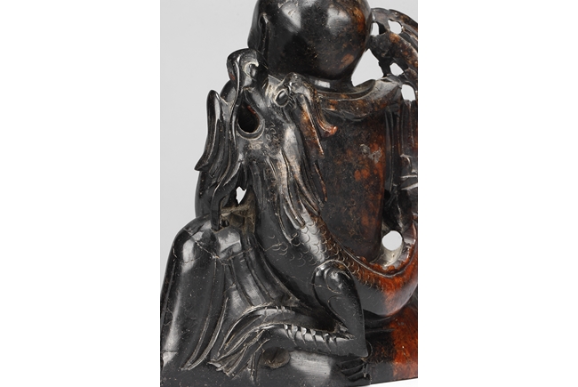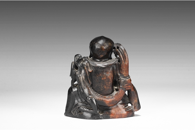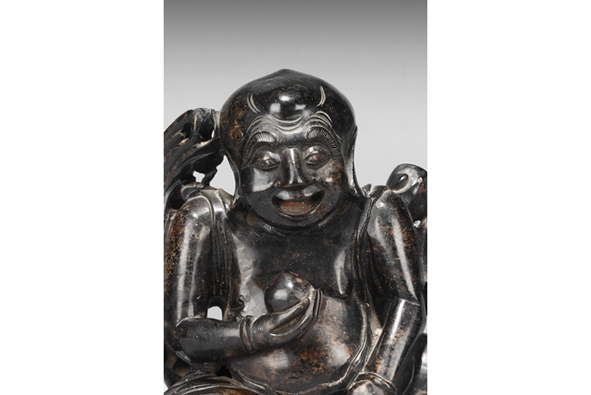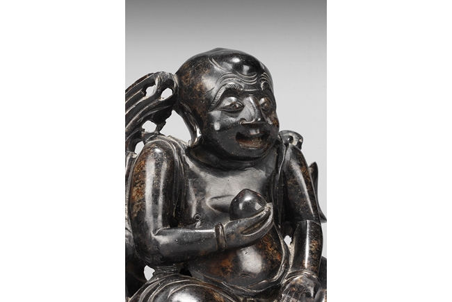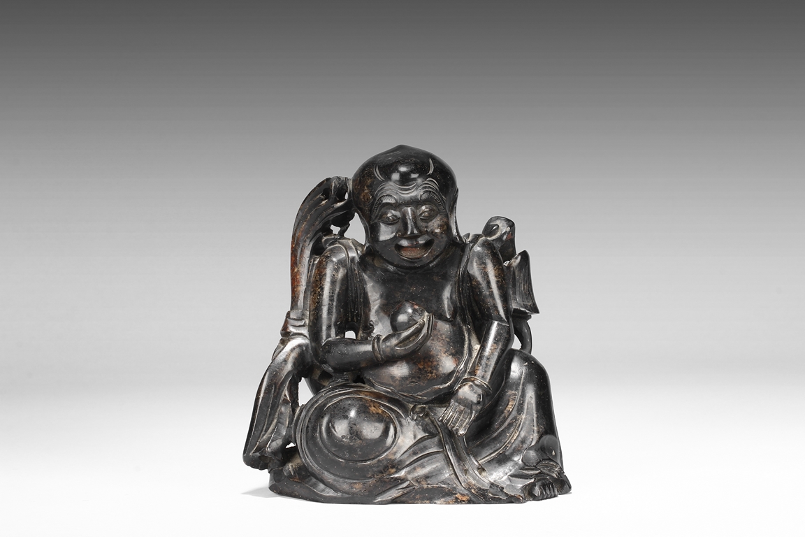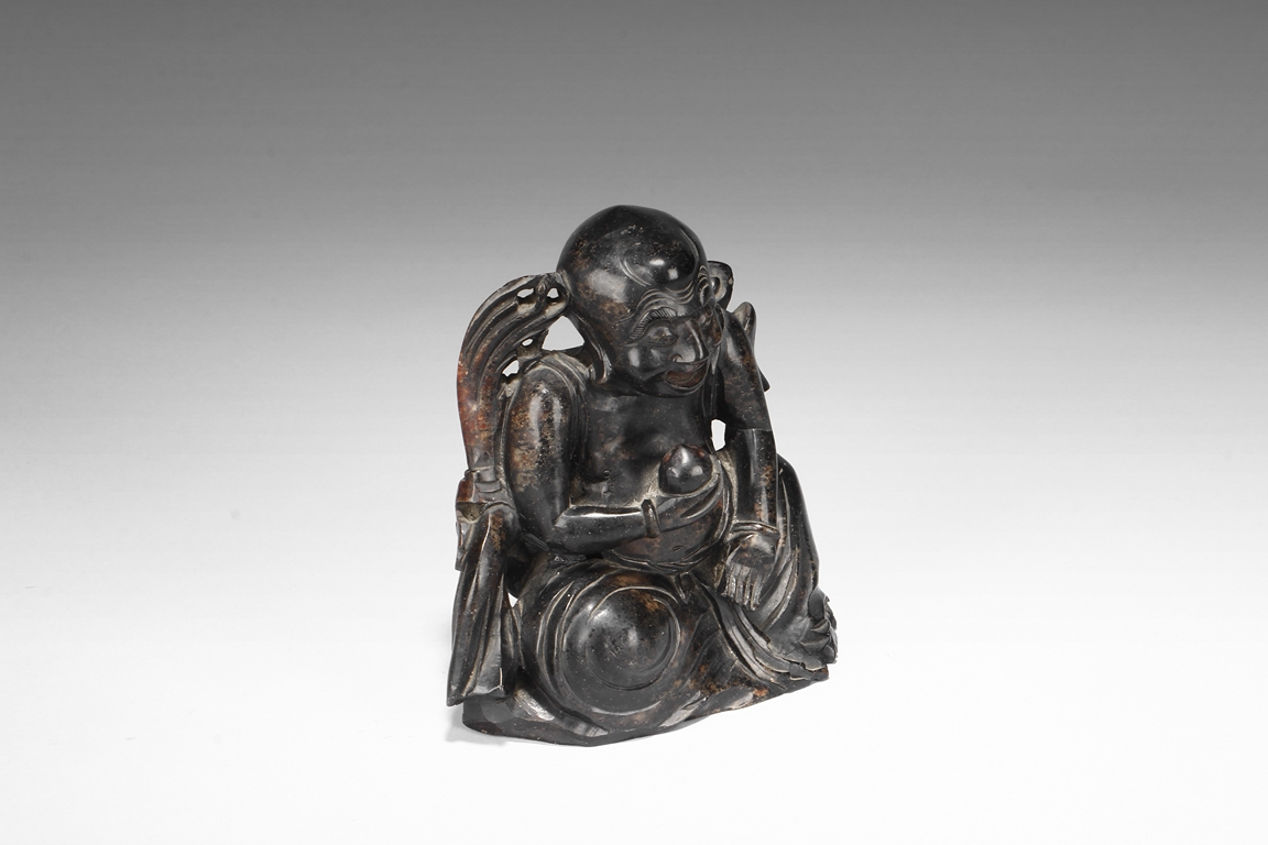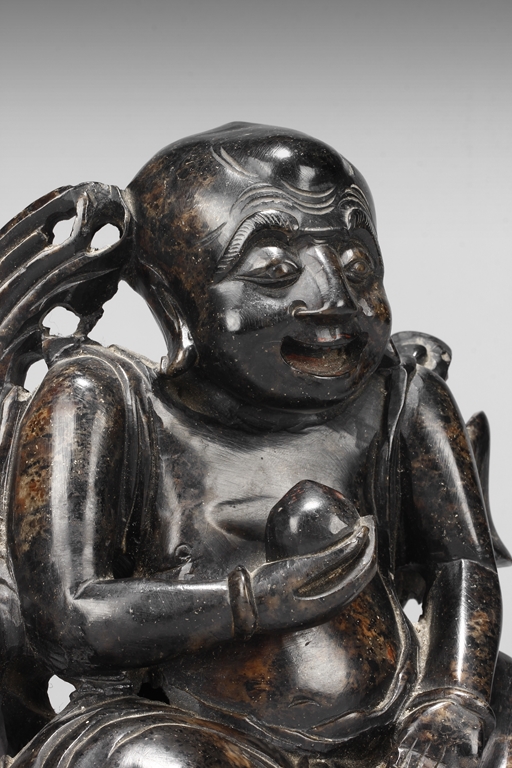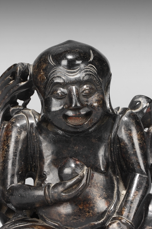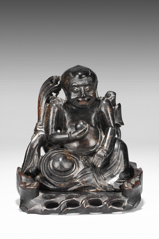 This Arhat is shown seated in ease on a openwork stand, while holding an object on the right hand. His face is depicted with a joyous expression, with a wide-open mouth and long eyebrow. Wearing a loose robe exposing belly and chest, his back is reclining against a finely carved mythical beast. The stone is of black and reddish tone. Ming Dynasty Period.