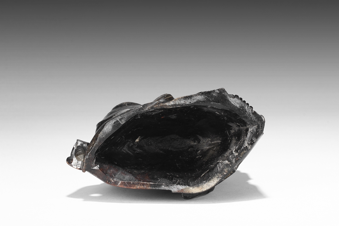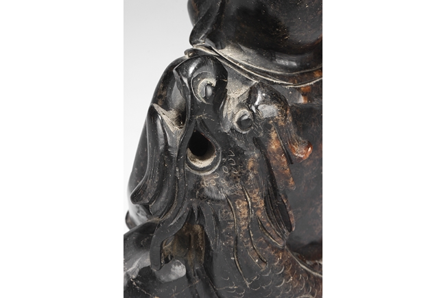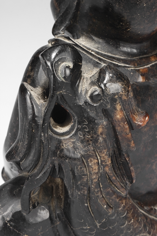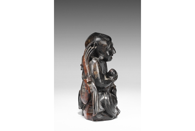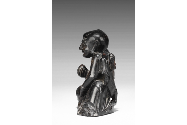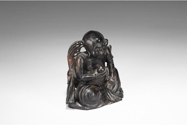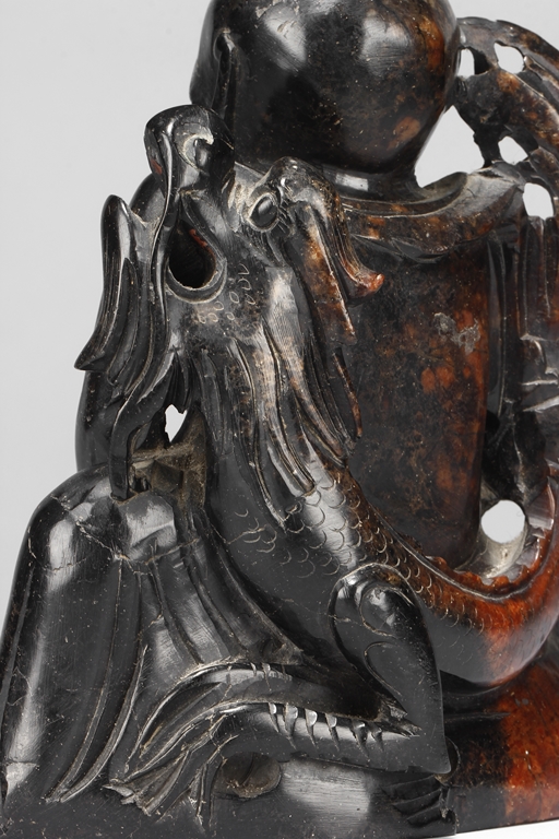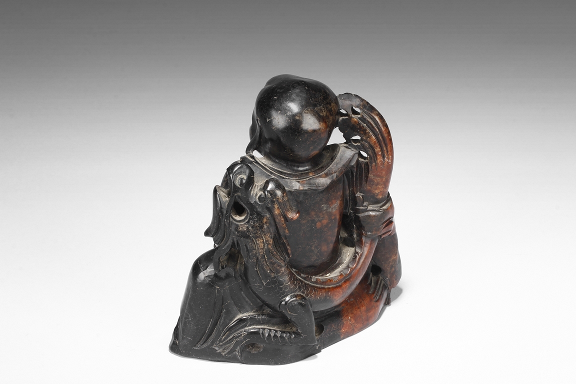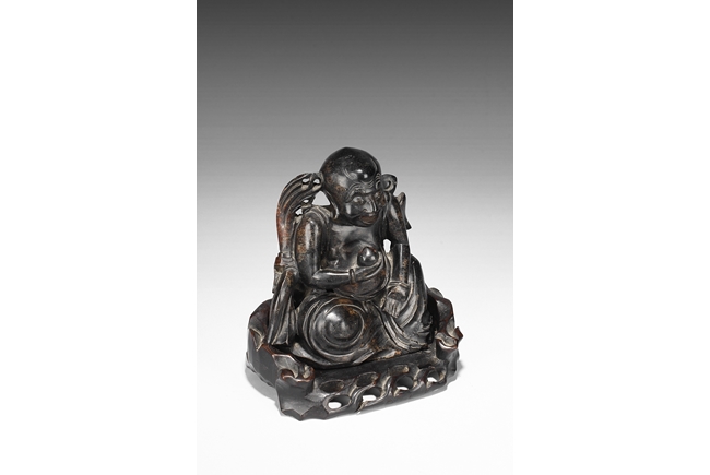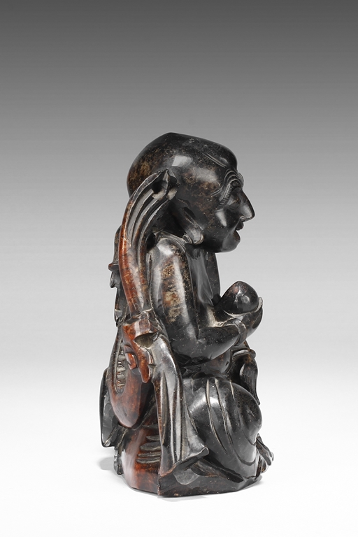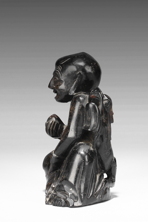 This Arhat is shown seated in ease on a openwork stand, while holding an object on the right hand. His face is depicted with a joyous expression, with a wide-open mouth and long eyebrow. Wearing a loose robe exposing belly and chest, his back is reclining against a finely carved mythical beast. The stone is of black and reddish tone. Ming Dynasty Period.