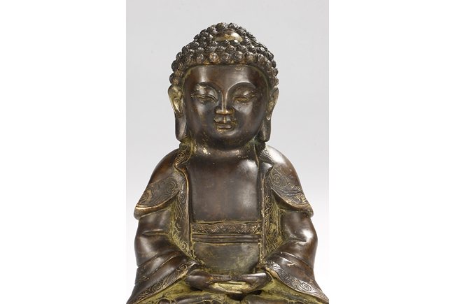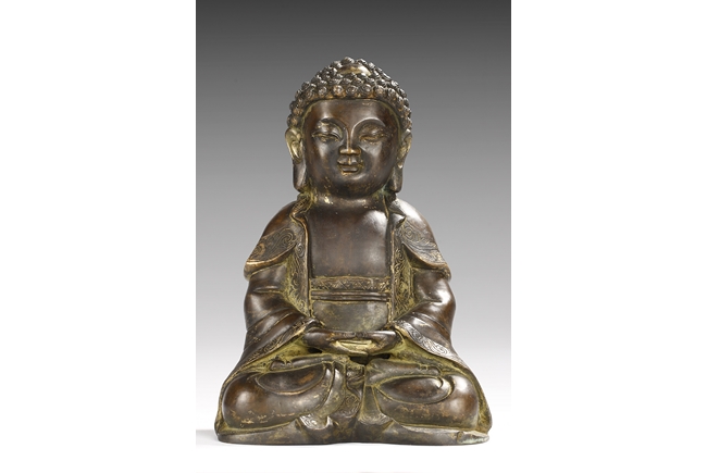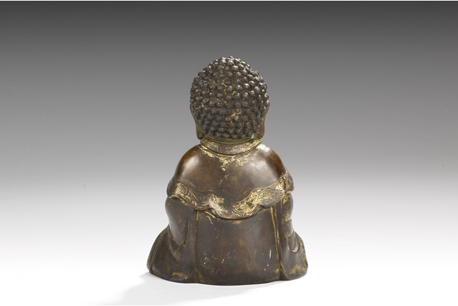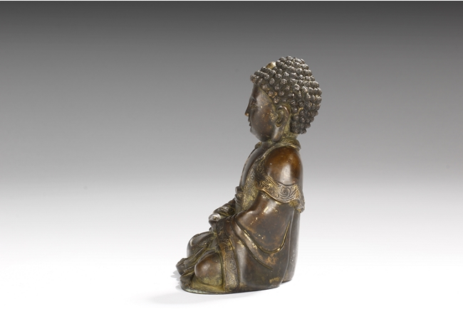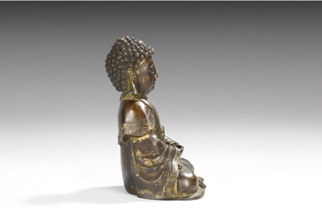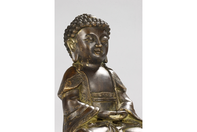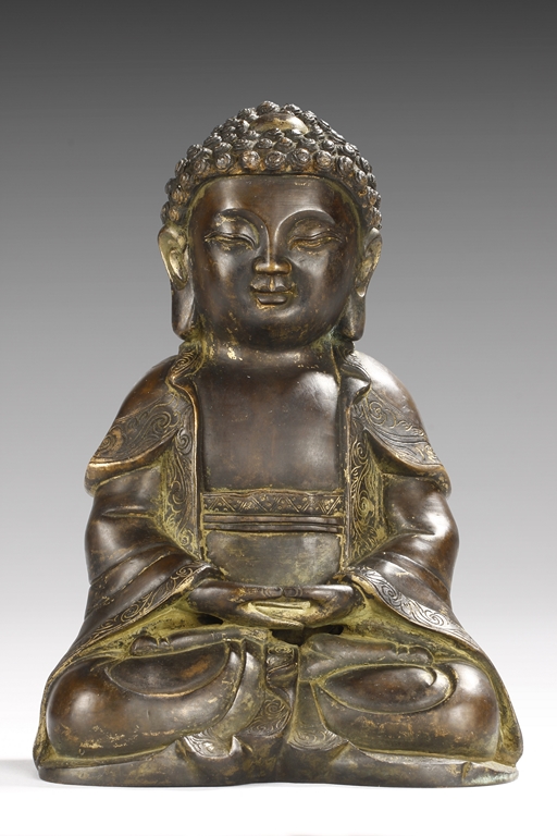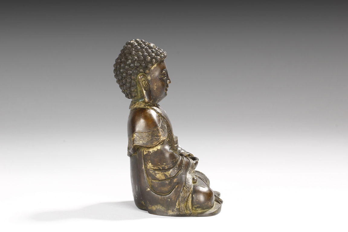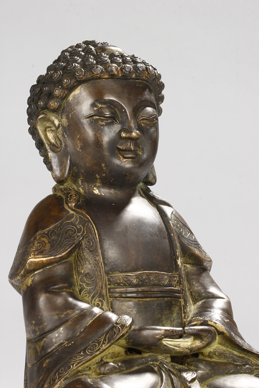 The Bodhisattva is shown seated in padmasana with hands in dhyana mudra. His face is depicted with a benevolent and serene expression and two pendulous earlobes, hair tied in ushnisha, an undergarment tied around the waist and a long loose robe incised with delicate patterns. Ming Dynasty Period.
