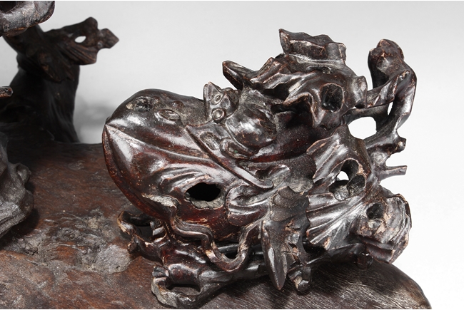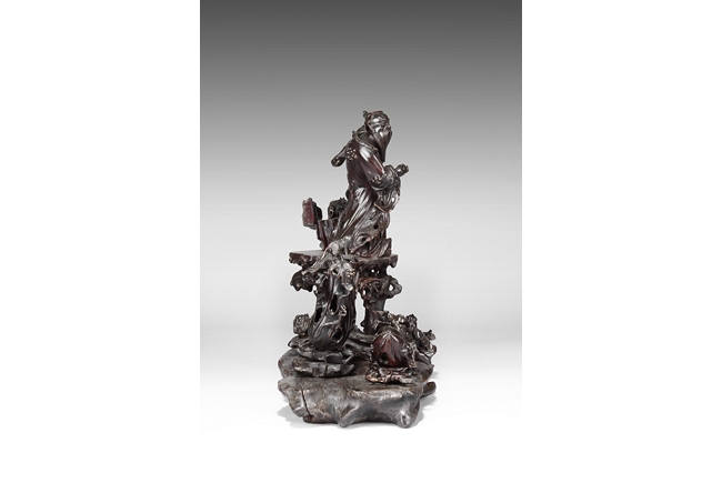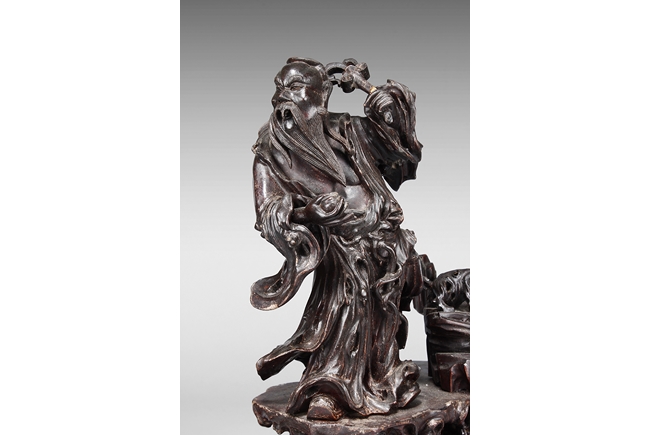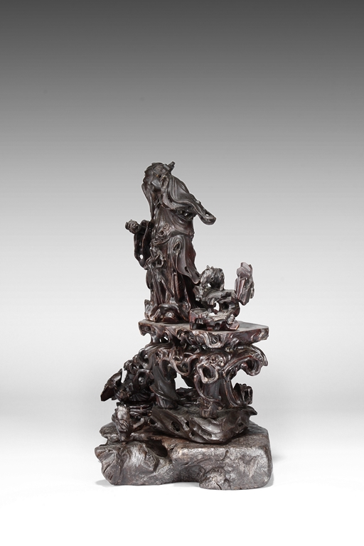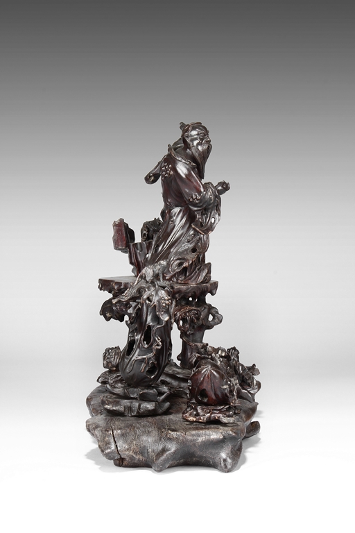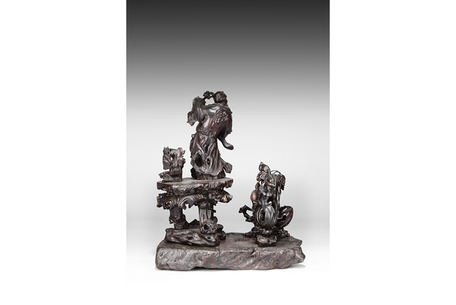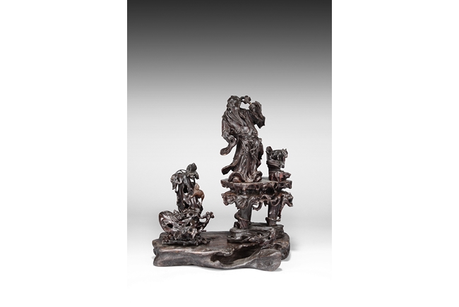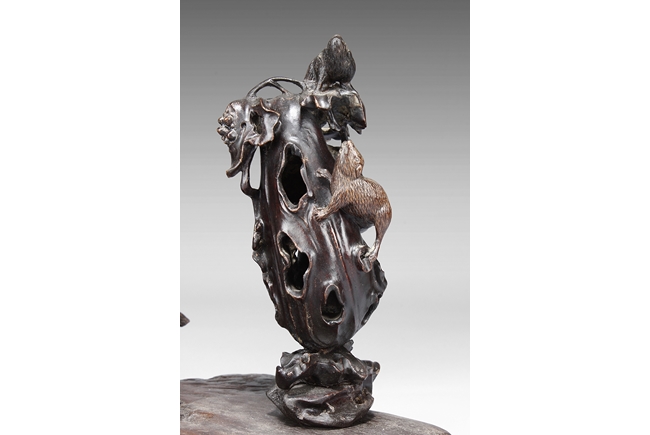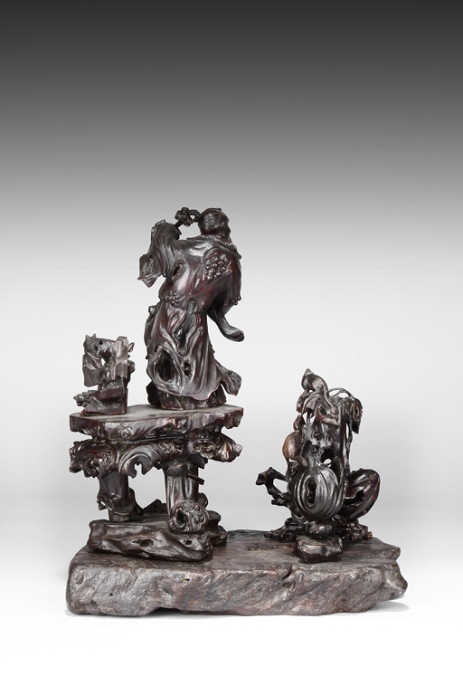 On the upper level, this piece is Intricately carved with a standing legendary figure Zhongli Quan holding a ruyi on one hand and a dog sitting upon rock, all rising from a carved wood stand. On the lower level, it includes an exquisitely carved tree trunk with a squirrel climbing upwards. Qing Dynasty Period.