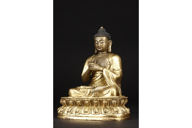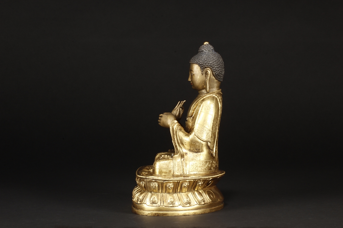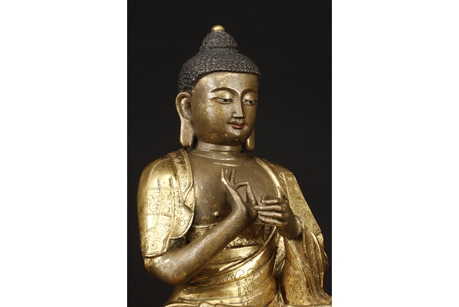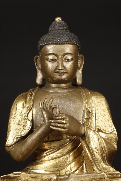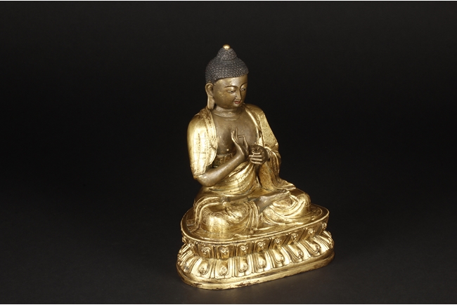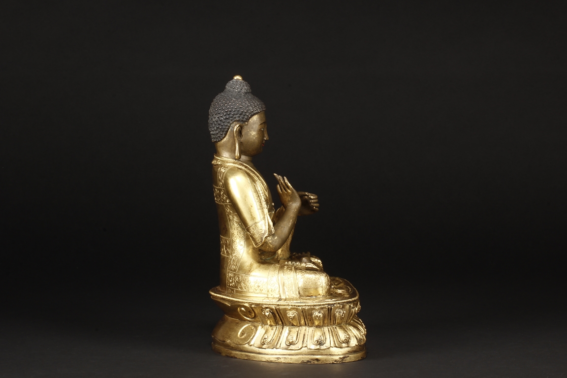 Seated on a double lotus throne, this Bodhisattva is delicately depicted with a benevolent expression, downcast eyes, red colored lip, and pendulous earlobes. His hair is tied in ushinisha and topped with a knop, wearing a loose robe finely incised with foliate patterns and exposing his chest, and his hands are in elegant dharmachakra mudra.