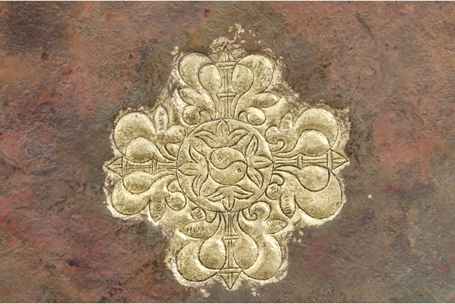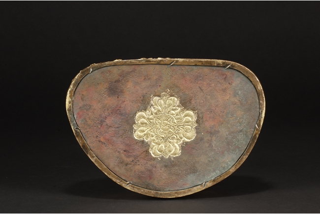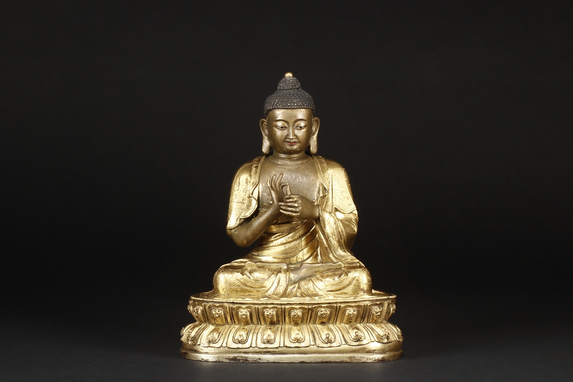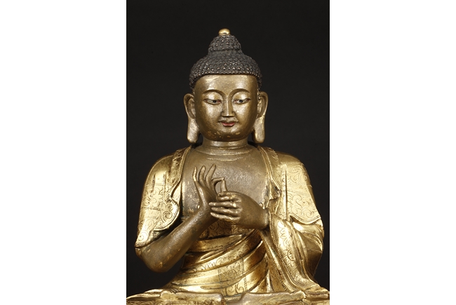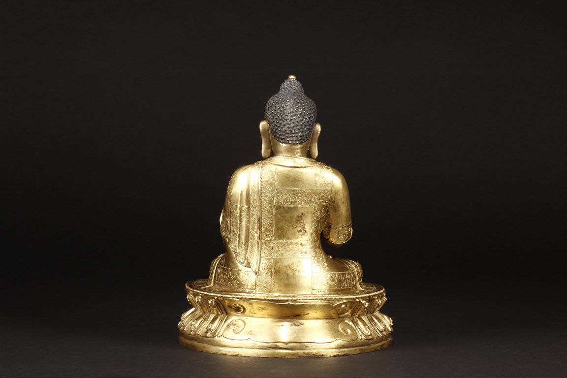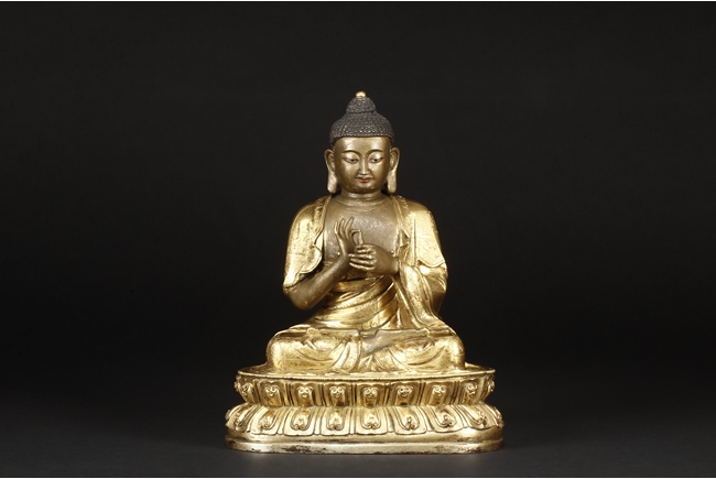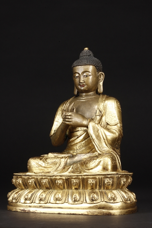 Seated on a double lotus throne, this Bodhisattva is delicately depicted with a benevolent expression, downcast eyes, red colored lip, and pendulous earlobes. His hair is tied in ushinisha and topped with a knop, wearing a loose robe finely incised with foliate patterns and exposing his chest, and his hands are in elegant dharmachakra mudra.