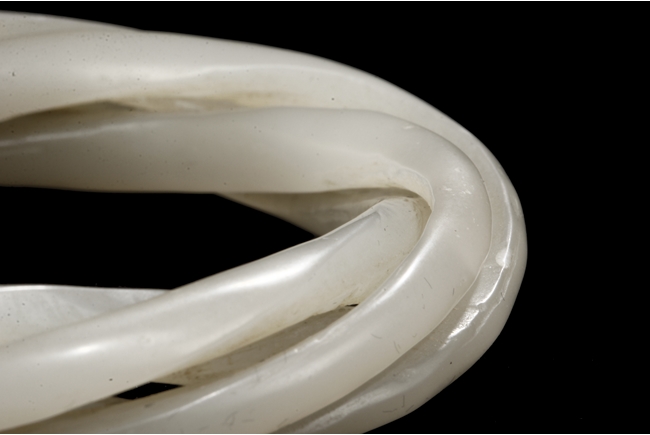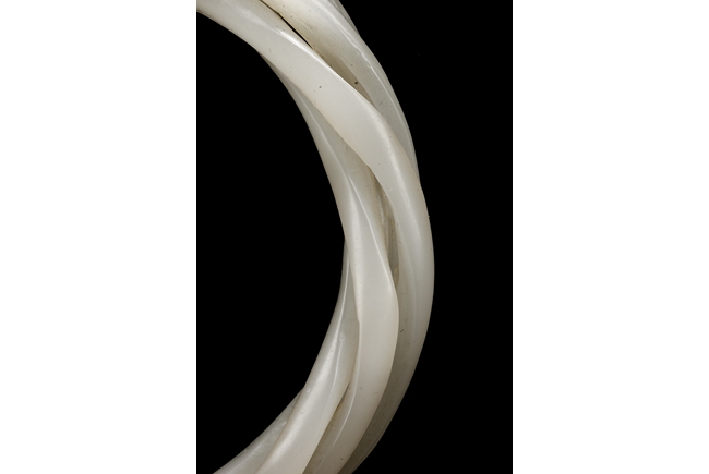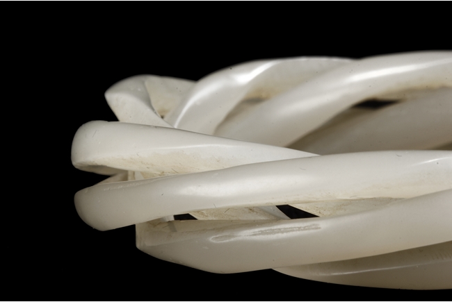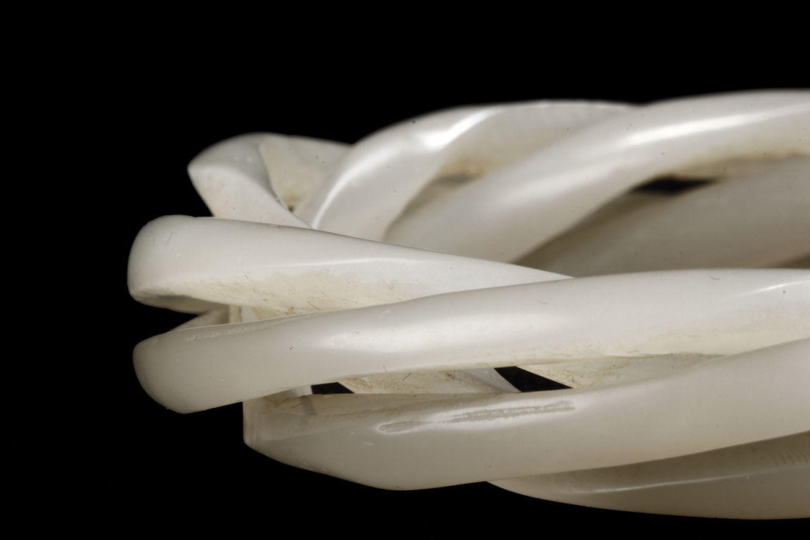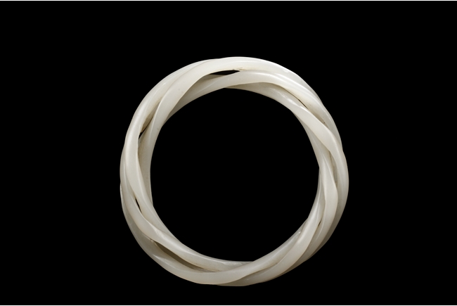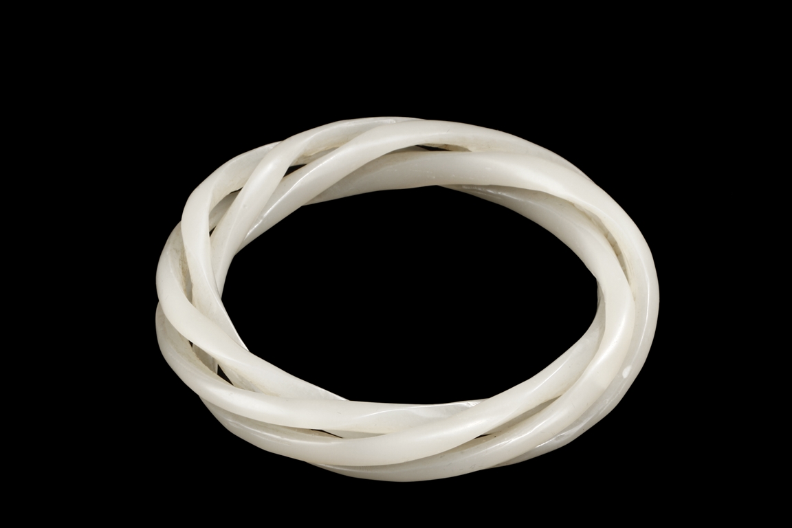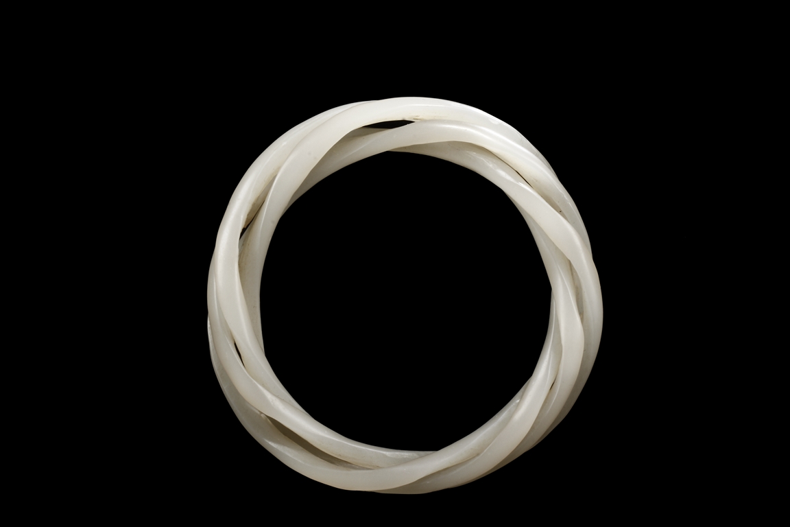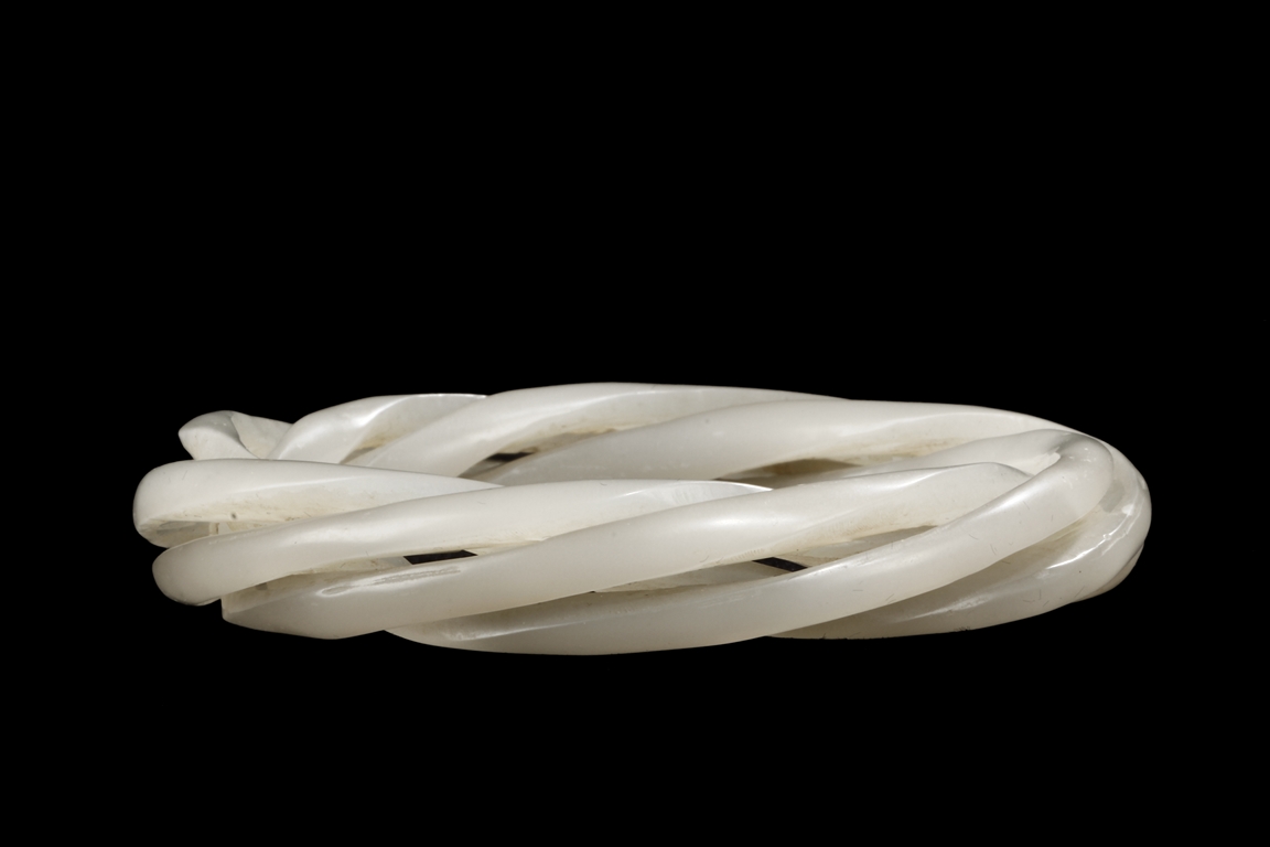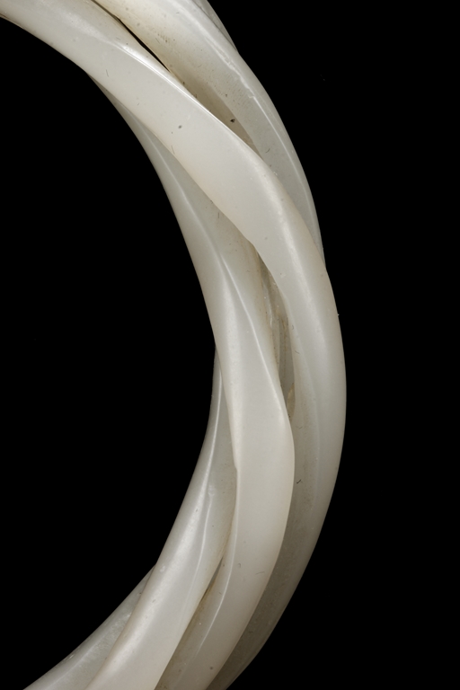 Cleverly designed and crafted, the white jade bangle was made with three movable smaller bangles, intertwined together in orderly fashion, the Hetian jade of smooth white. Qing Dynasty period.
