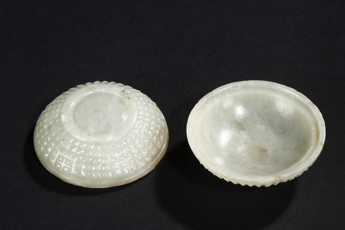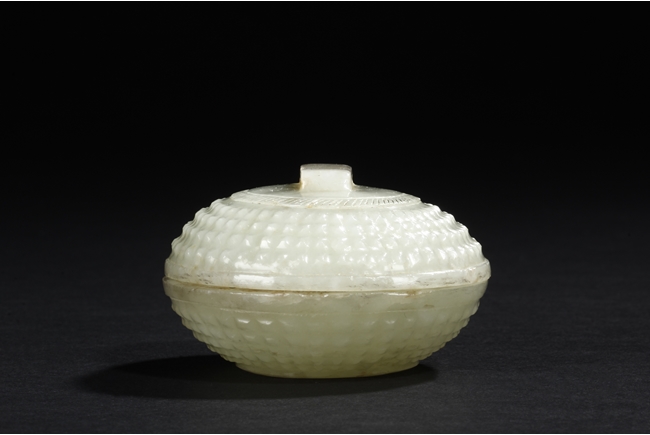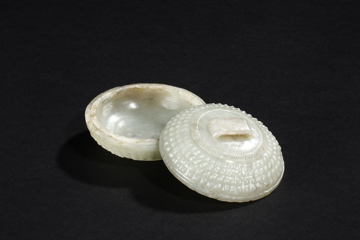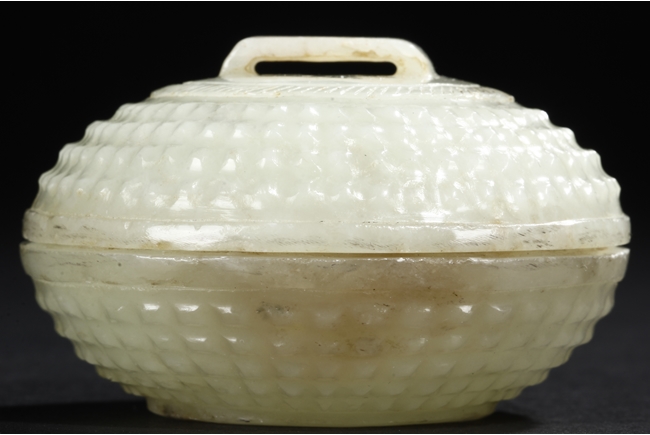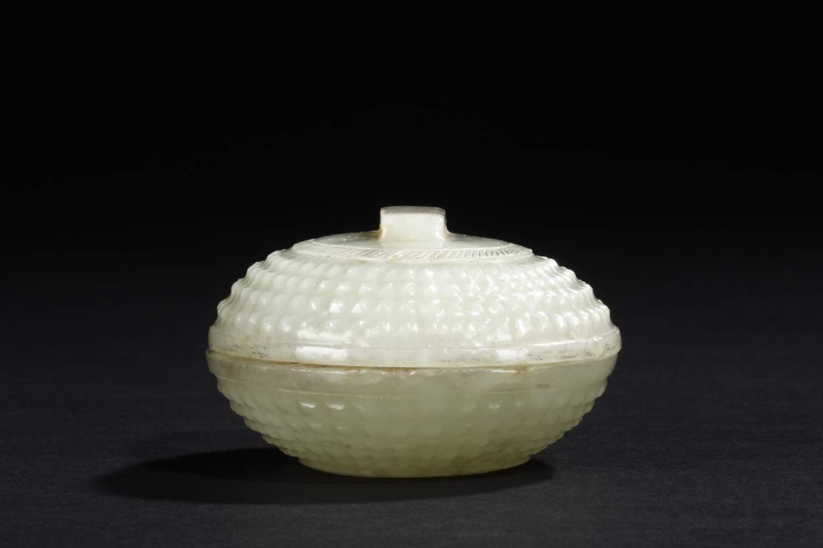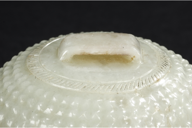 Of compressed globular form the exterior covered with bumped rectangular patterns, the finial in the form of a low and wide bridge, the stone of celadon color with slight russet. Qing Dynasty period.
