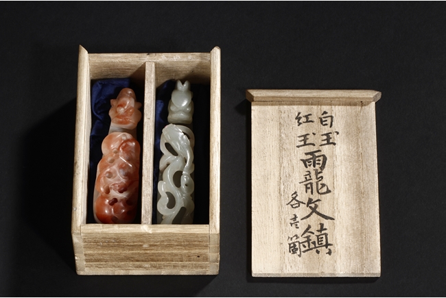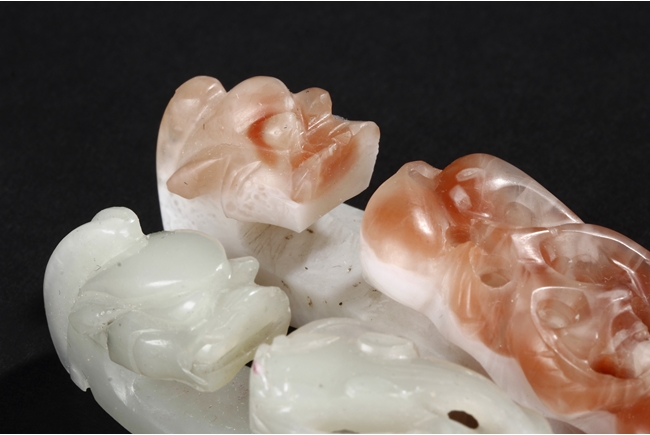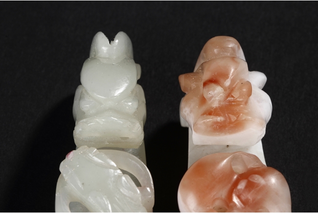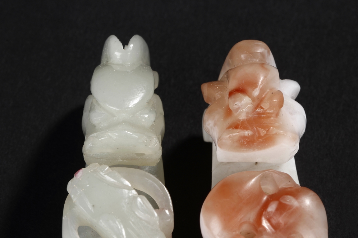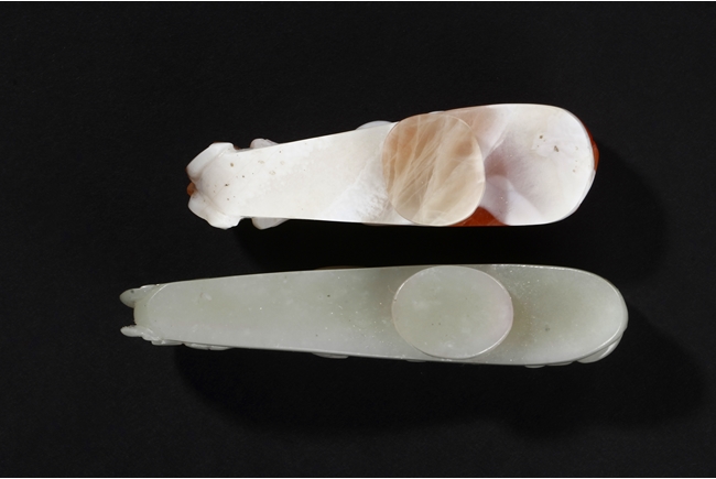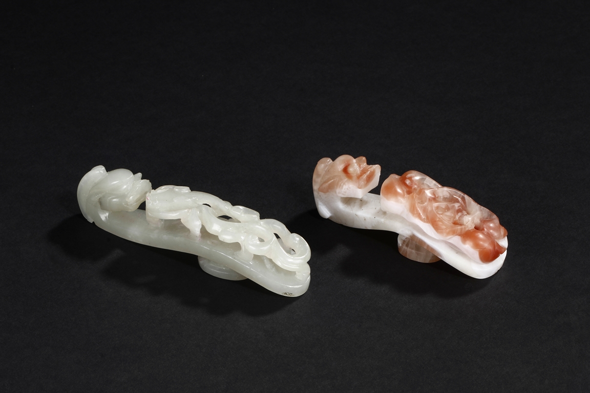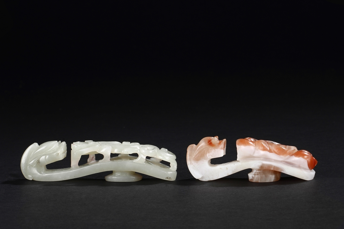 Both belt hooks depict similar motif, with a young dragon confronting with an elder dragon on the surface, and a round knob on the bottom. One belt hook made from white jade, with slight translucency and cloudy patterns within. The other belt hook made from white and light brown agate, smaller in size relative to the jade hook. Qing Dynasty period.
