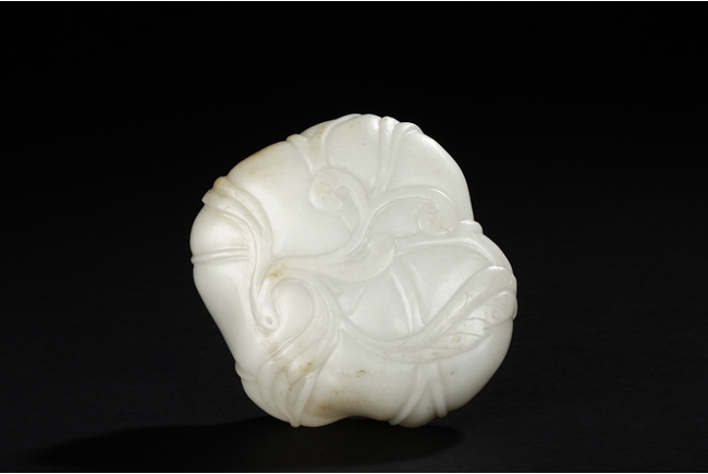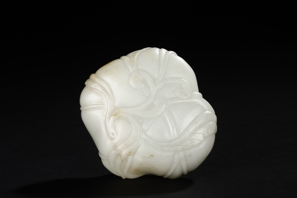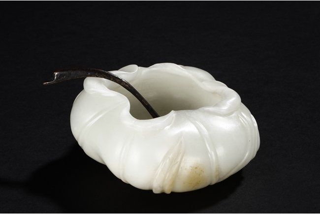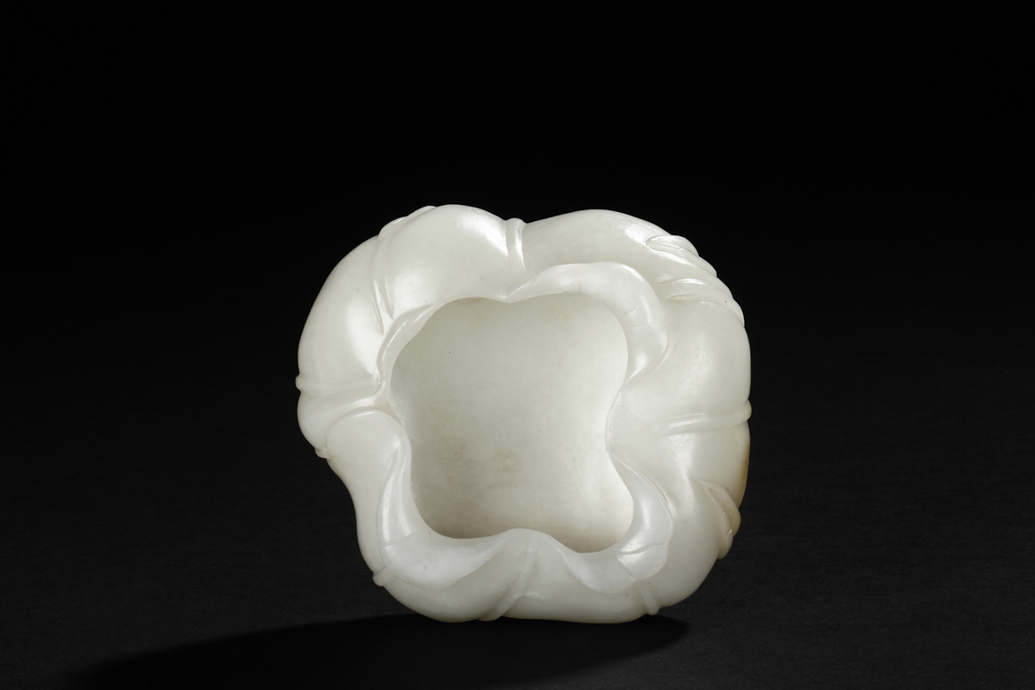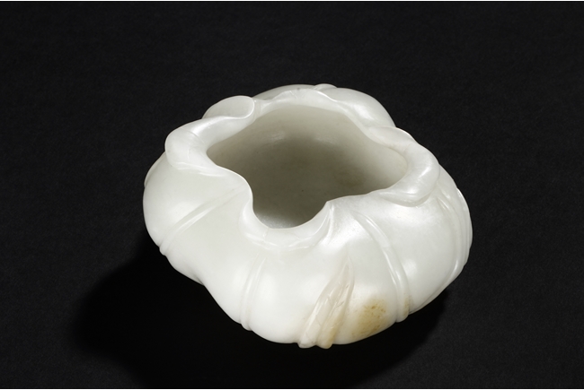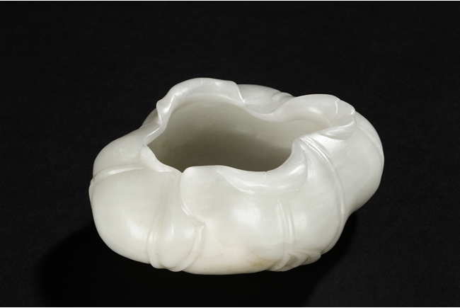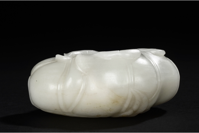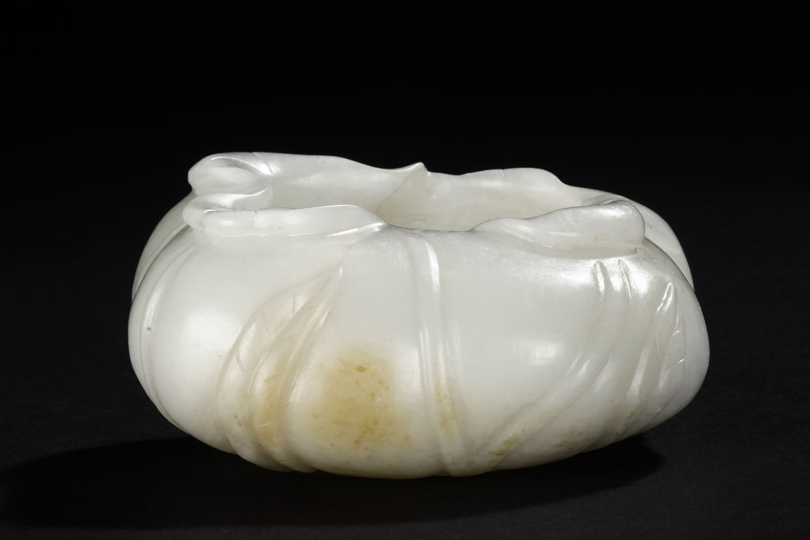 The washer with lotus leaf folding upwards design, the stems and root lightly carved, the white jade of smooth white with slight translucency and russet. Qing Dynasty period.