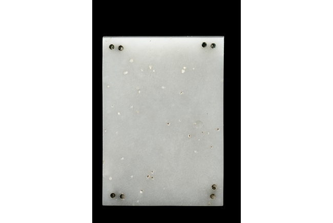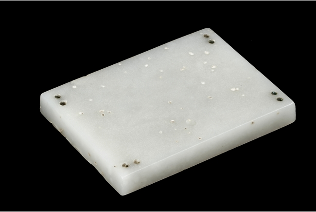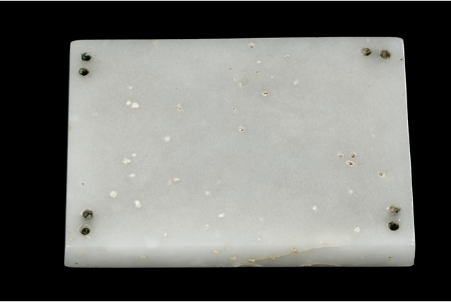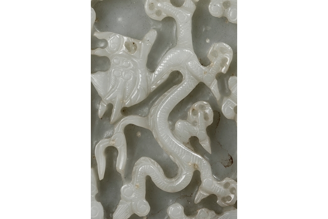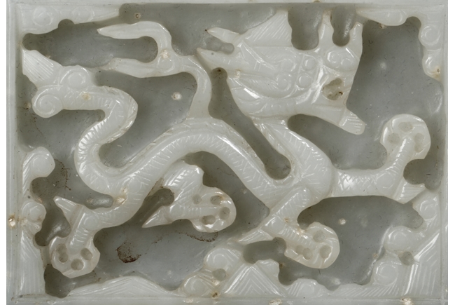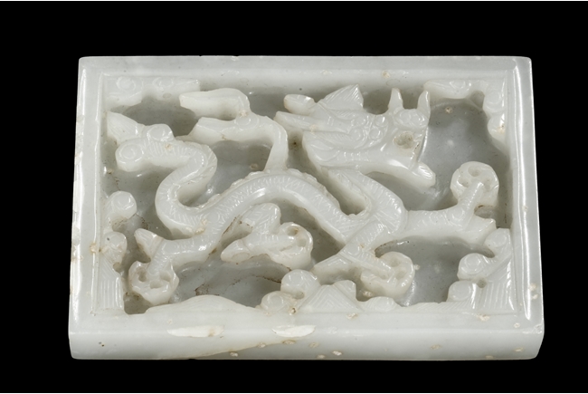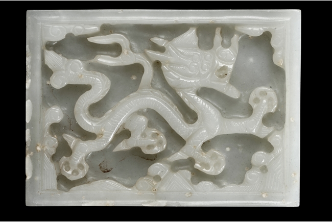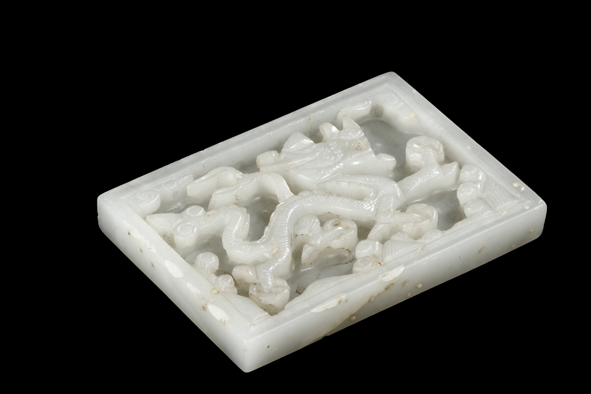 Of rectangular form, the white jade pendant relief carved with a dragon flying amidst clouds above ocean, the stone of slightly translucent white color, with slight inclusions, the back with eight small holes in pairs of two. Qing Dynasty Period.