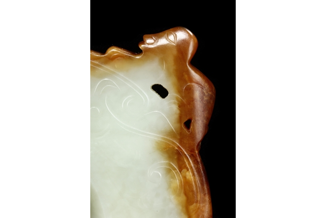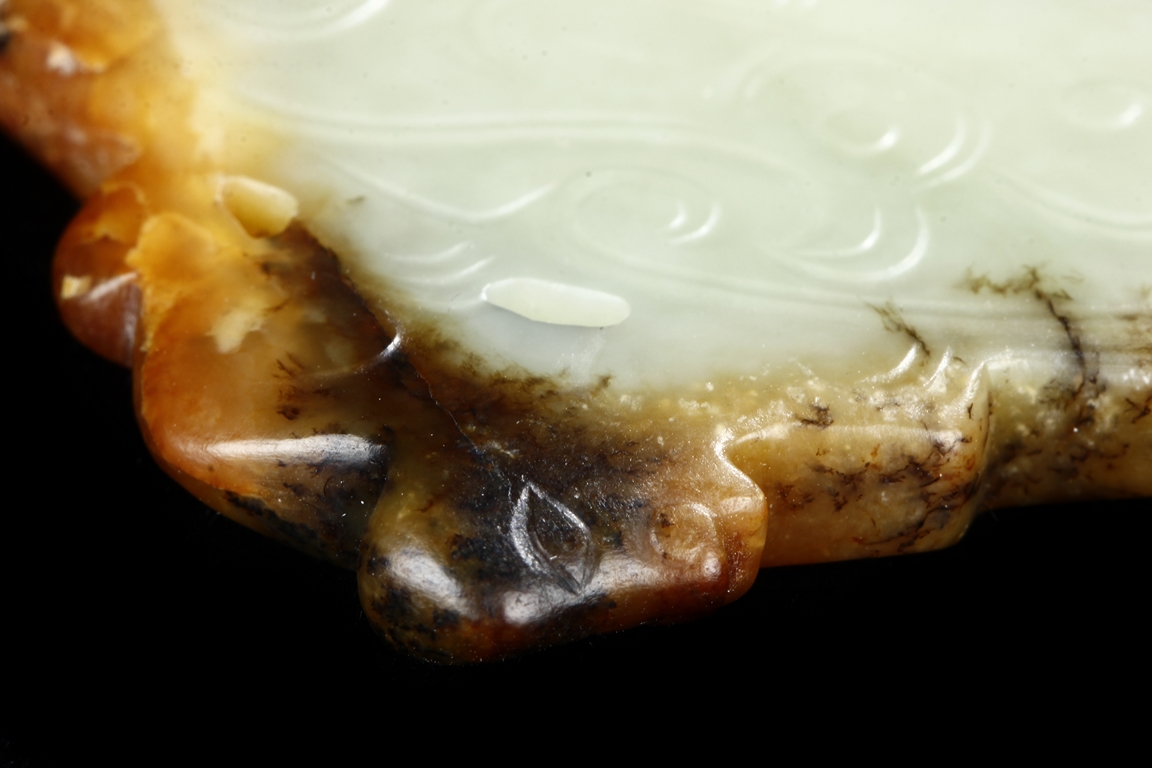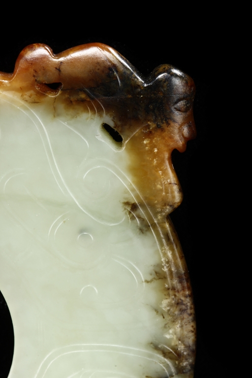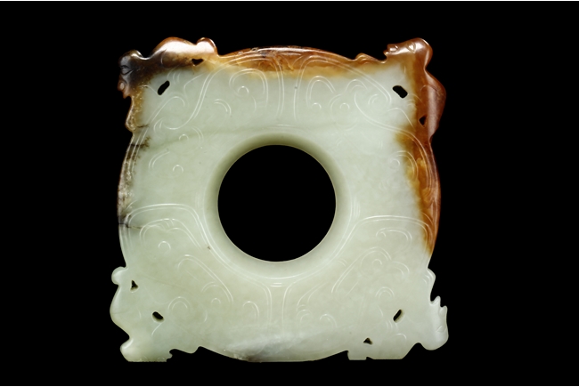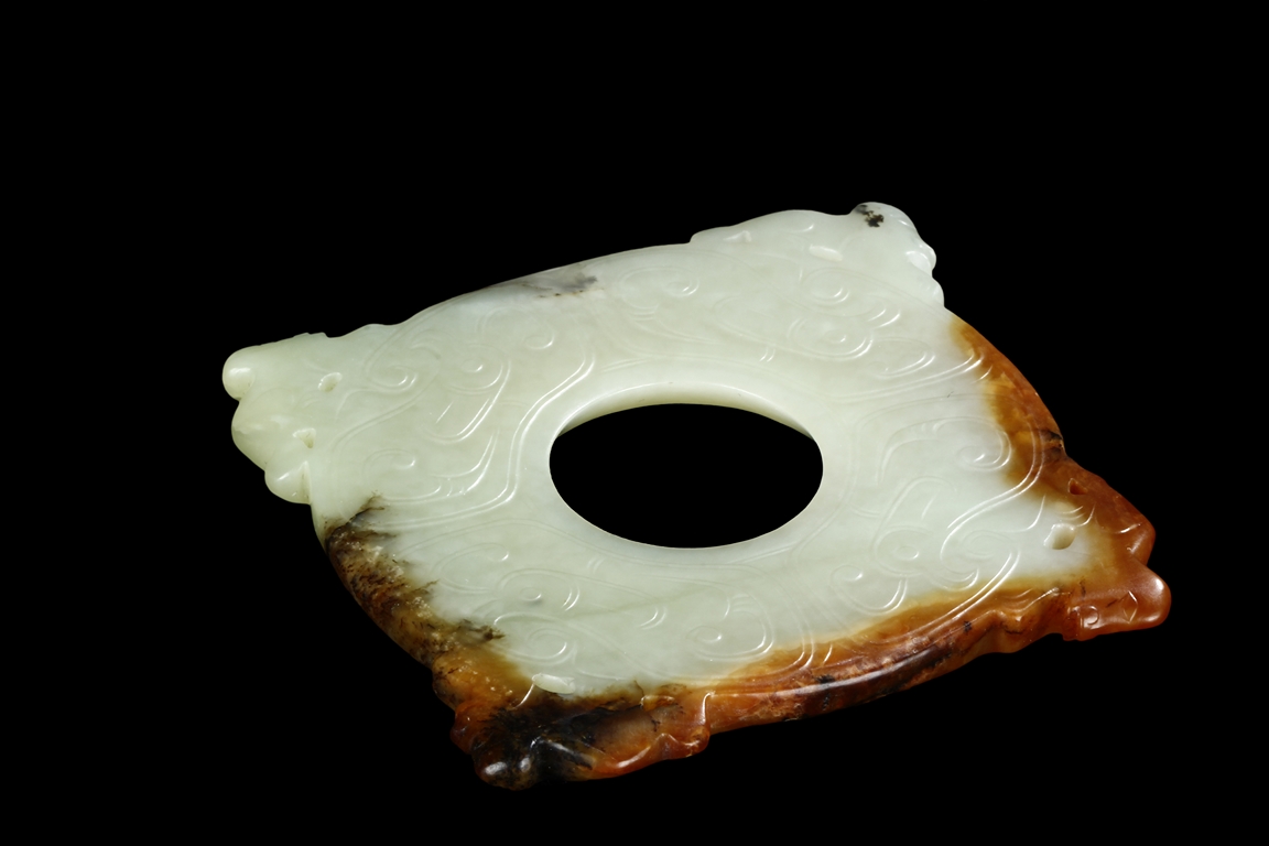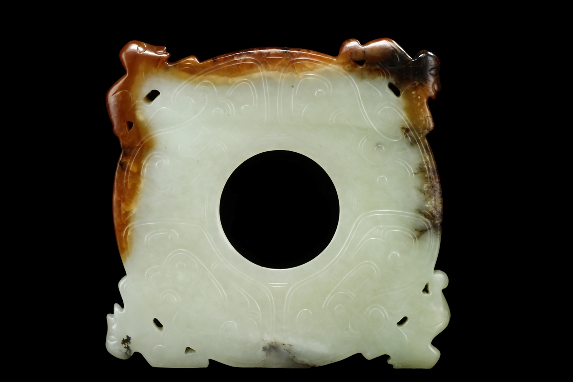This jade disc Bi has a central aperture drilled from one side, lightly carved on both sides with patterns near each edge, the jade is of mottled celadon tone with russet inclusions and markings. Song Dynasty period in imitation of West Zhou Dynasty period.
