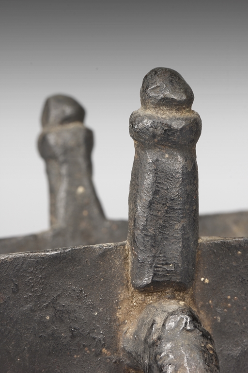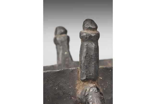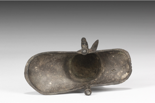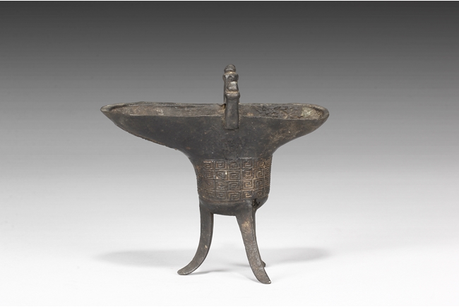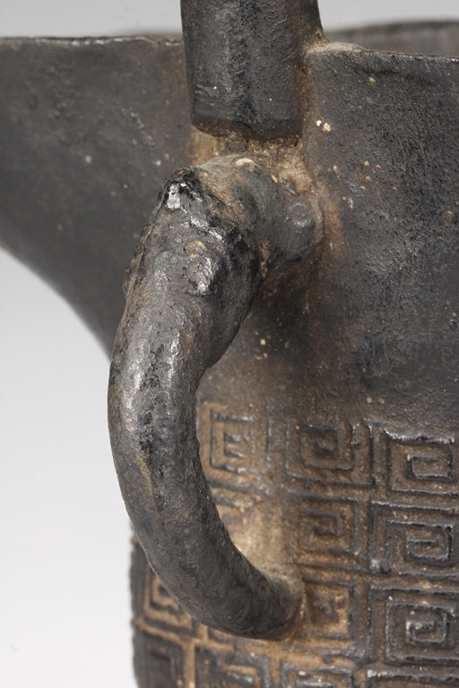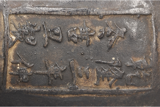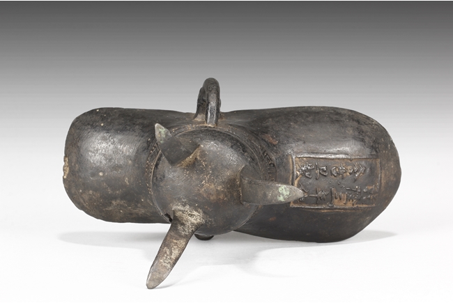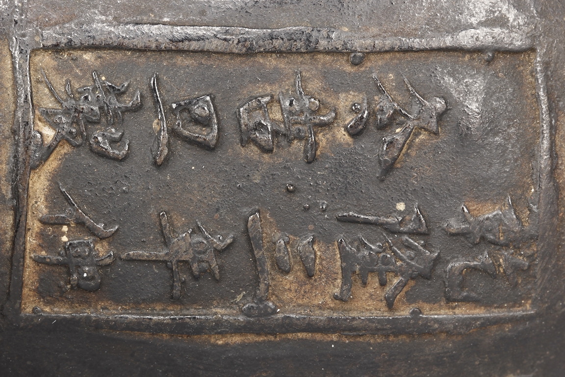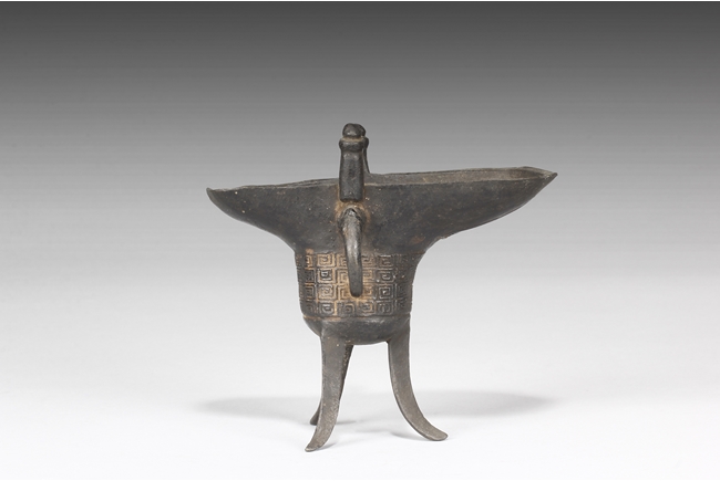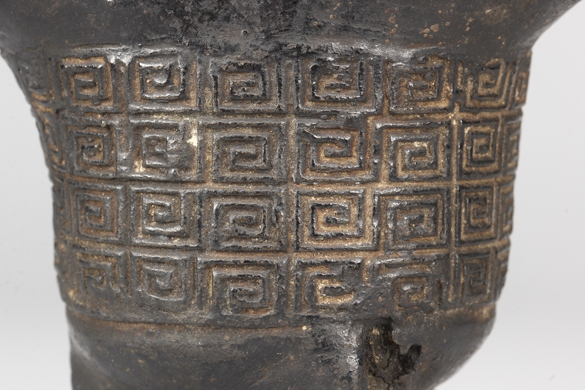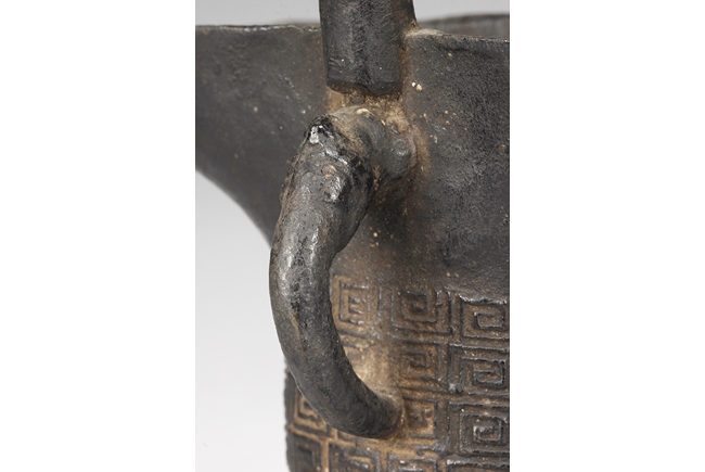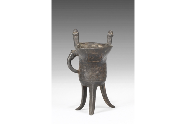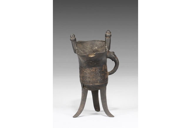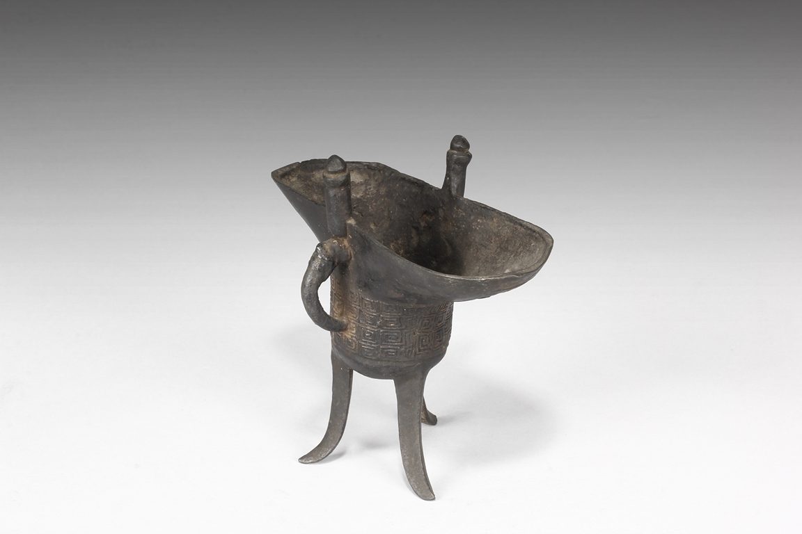 Raised on three splayed legs, this vessel is cast around the sides with a band of archaic key-fret designs below a pair of upright posts that rise from the rim. The underside of the rim includes a nine character inscription 'Qian Long San Nian Zhong Dong Ji Dan Zhi', or made in Qianlong reign third year and the first day of November in Chinese calender. Qing Qianlong Dynasty Period.