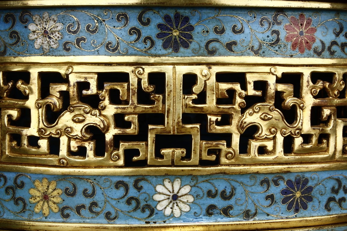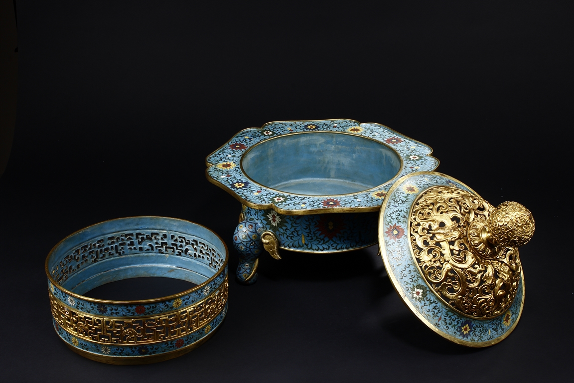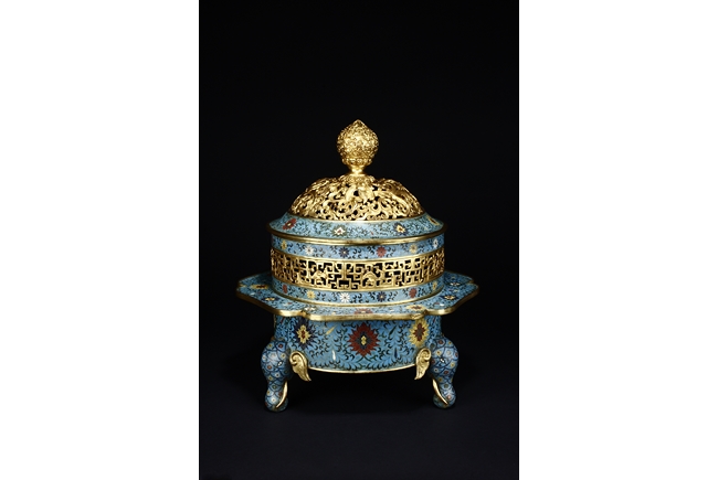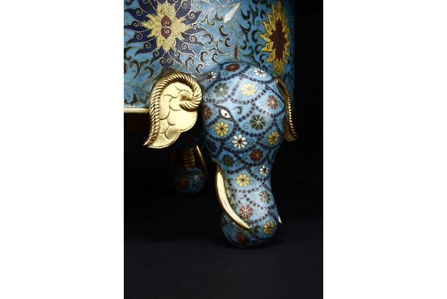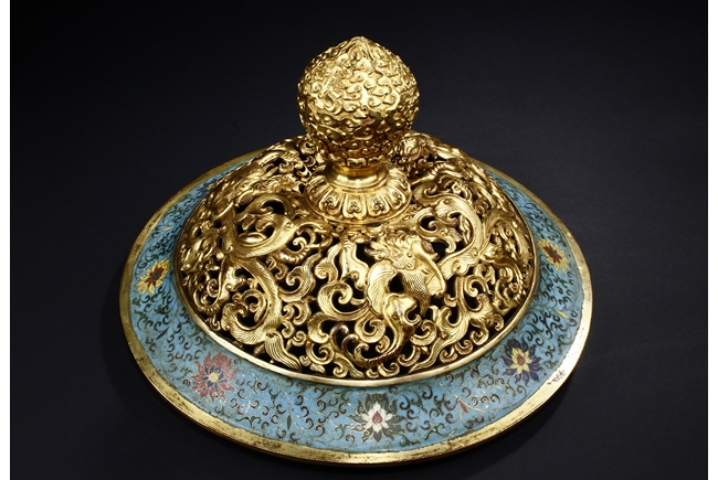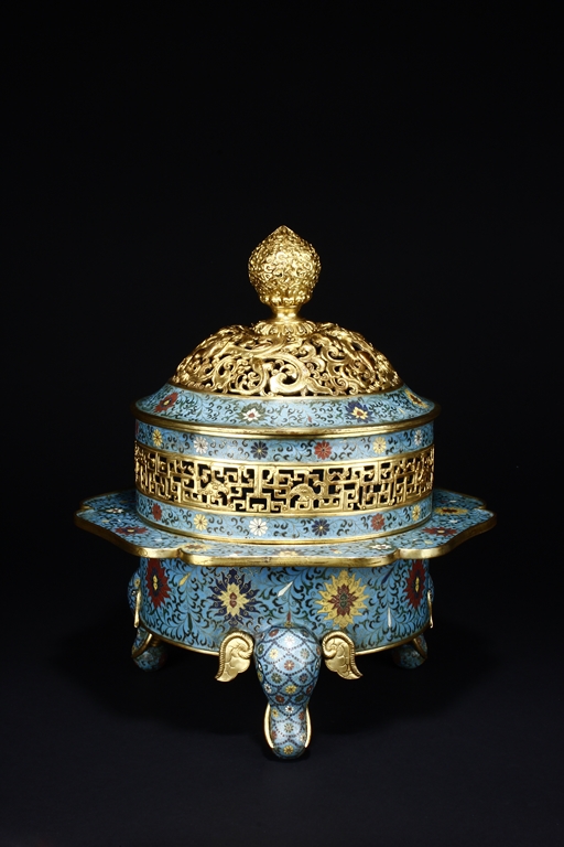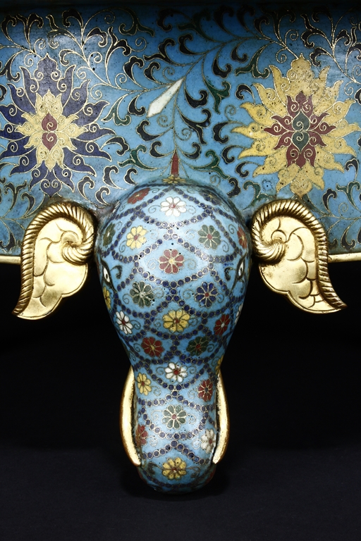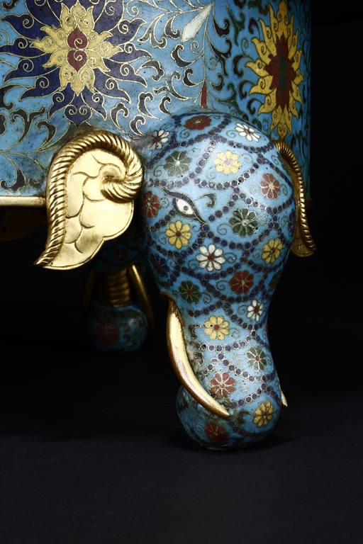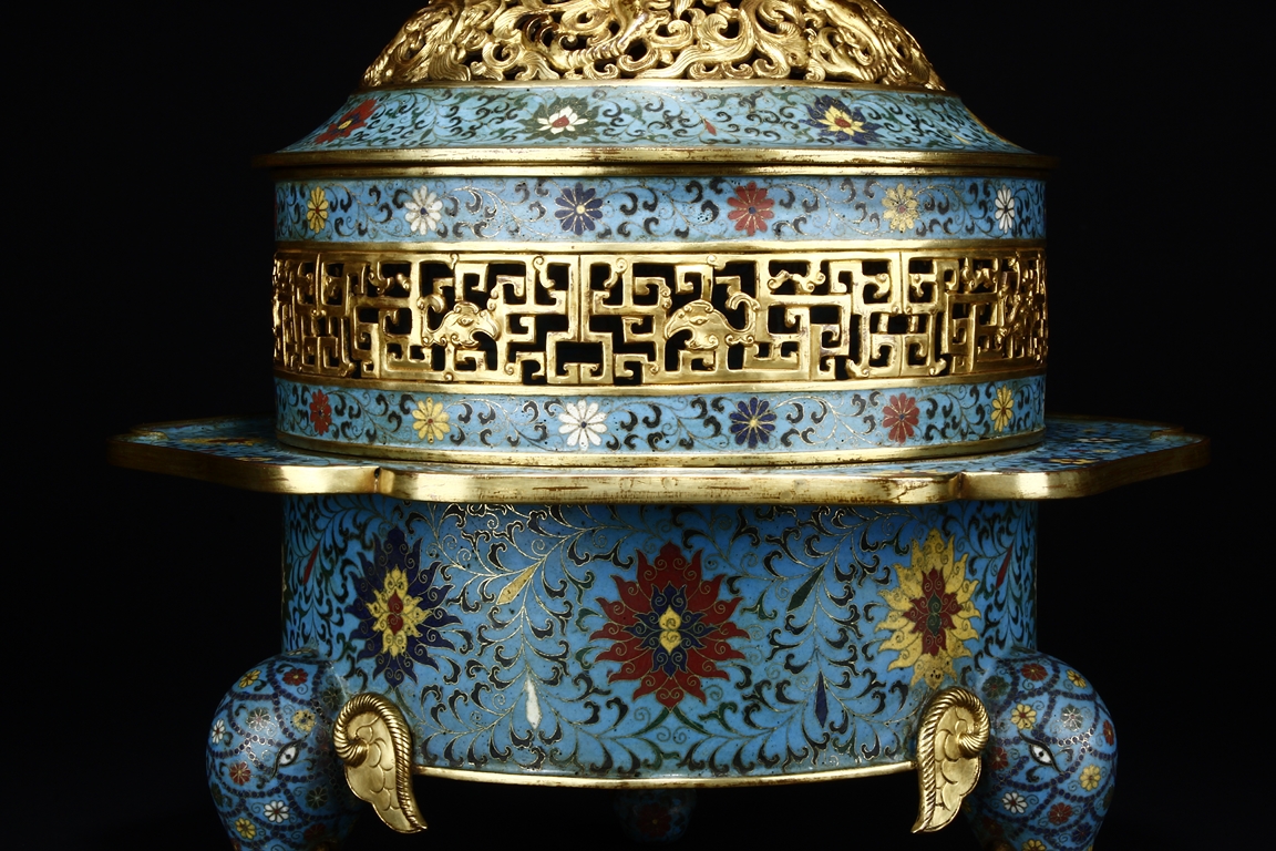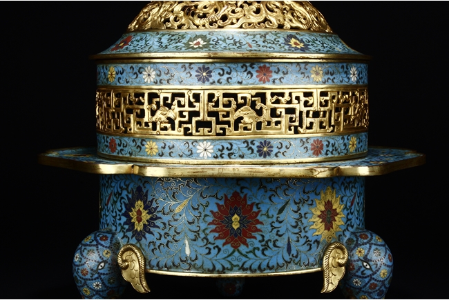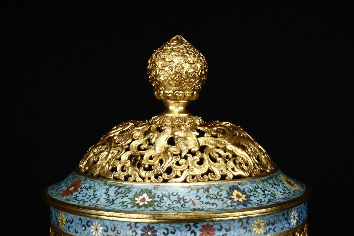 The censer is composed of three parts, including a base, mid section, and cover. The base supported by three elephant mask legs with gilt ears and ivory, the cylindrical body enameled with roundels of flowers amidst vines, leaves, and tendrils, below a floriform extruding rim with similar motif. The mid section of cylindrical form, with gilt band of stylized dragons amidst clouds in the center, between bands of flowers and vines. The cover is of domed form, the center gilt with dragons flying amidst clouds and ocean waves, with a gilt beaded finial depicting ruyi clouds on top. Bottom bears four apocryphal character "XUANDE" mark. Qing Dynasty period.