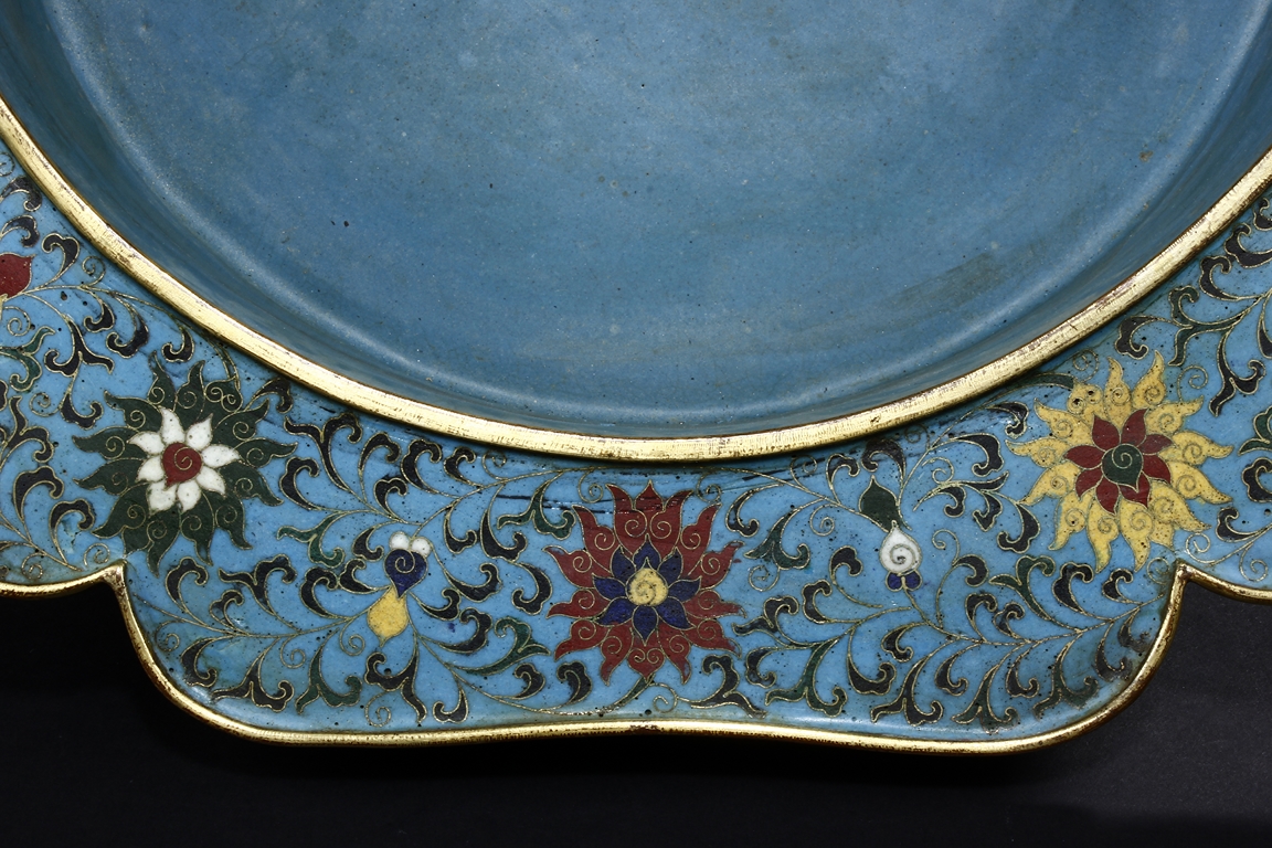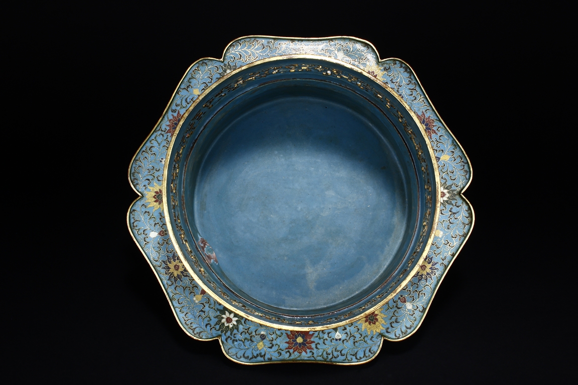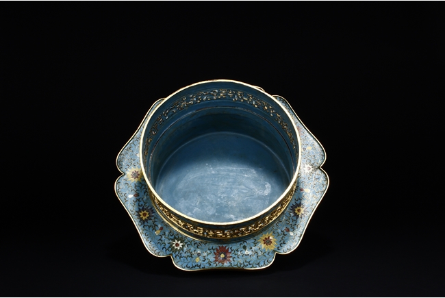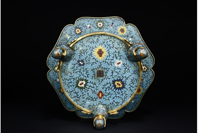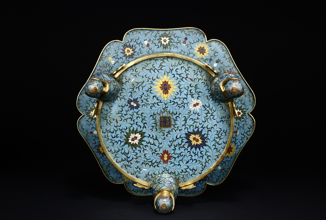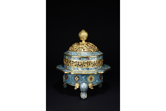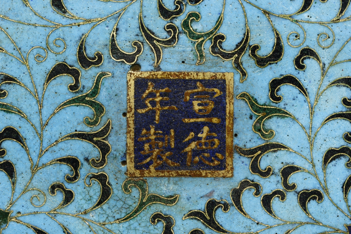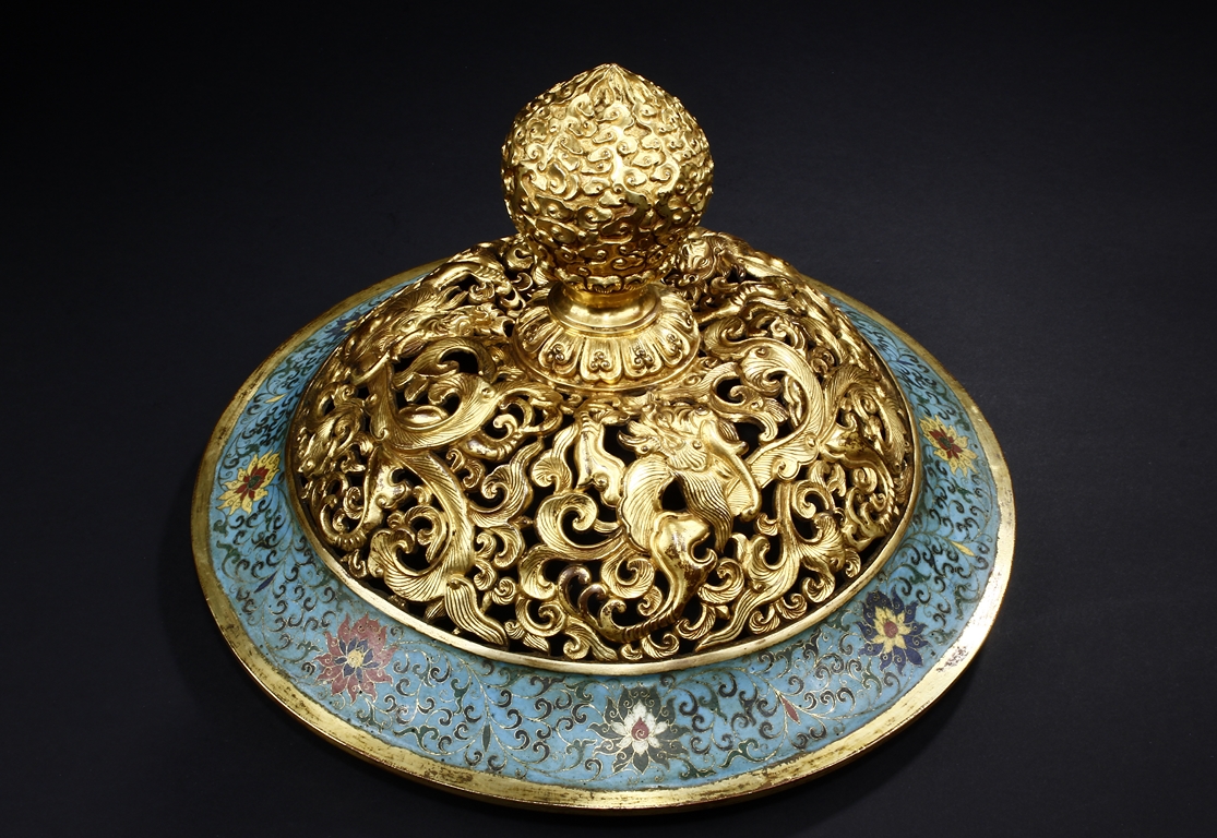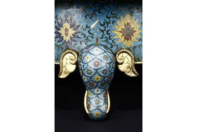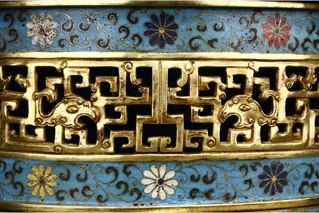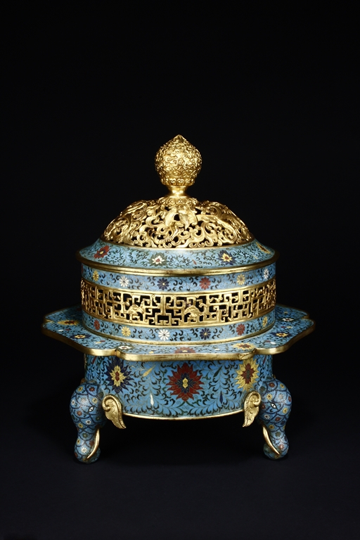 The censer is composed of three parts, including a base, mid section, and cover. The base supported by three elephant mask legs with gilt ears and ivory, the cylindrical body enameled with roundels of flowers amidst vines, leaves, and tendrils, below a floriform extruding rim with similar motif. The mid section of cylindrical form, with gilt band of stylized dragons amidst clouds in the center, between bands of flowers and vines. The cover is of domed form, the center gilt with dragons flying amidst clouds and ocean waves, with a gilt beaded finial depicting ruyi clouds on top. Bottom bears four apocryphal character "XUANDE" mark. Qing Dynasty period.