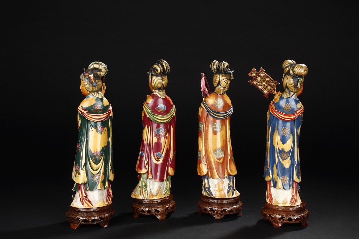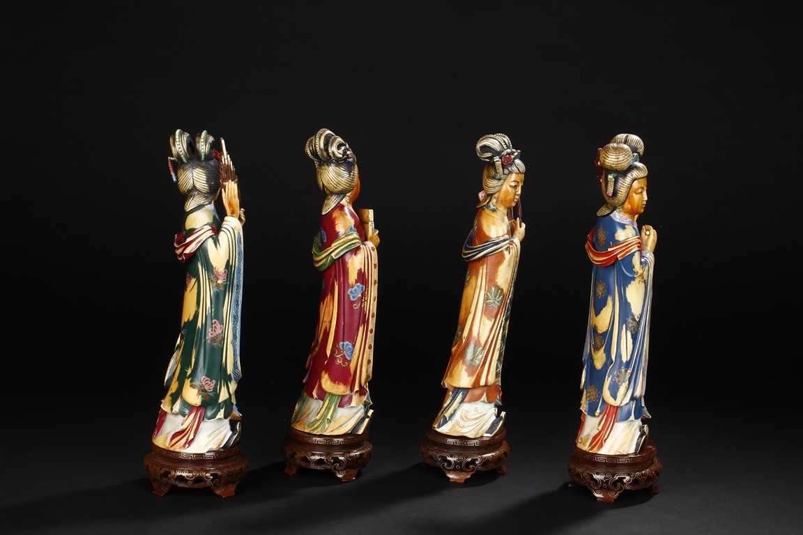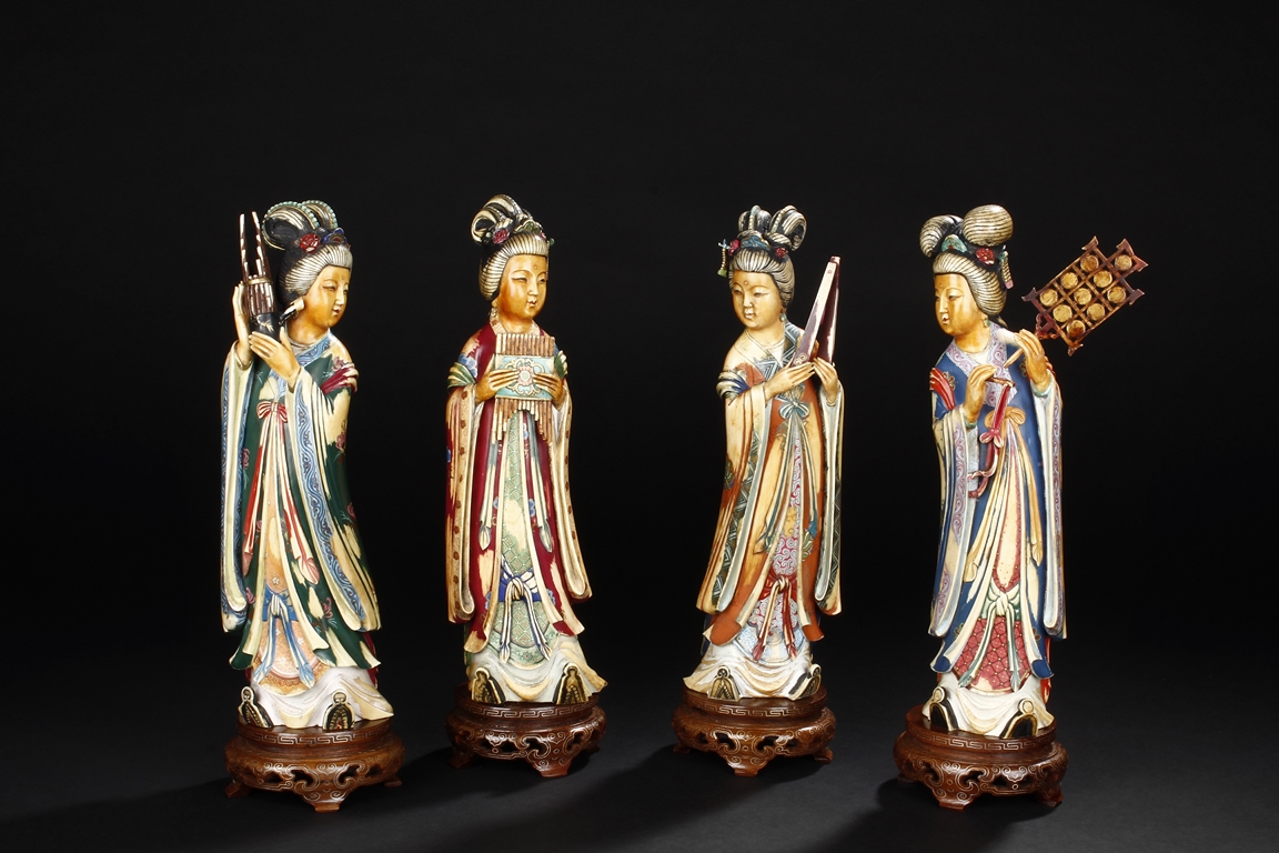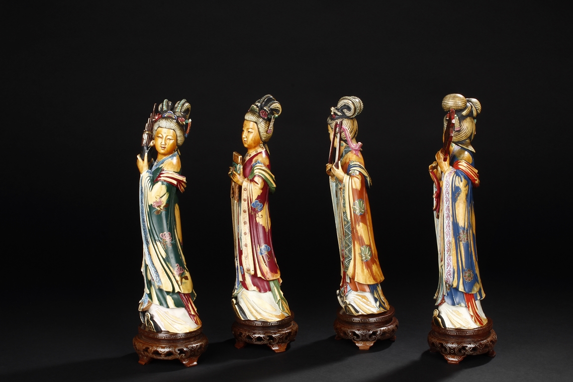 This set includes four ivory figures. Each standing figure is carved wearing long flowing robes and holding different musical instrument including Sheng, Xiao, Gu. Each face is delicately carved with benevolent expression and hair is tied in two topknots. Each supported figure is painted in various colors and supported on a three-leg wood stand.Republic period.