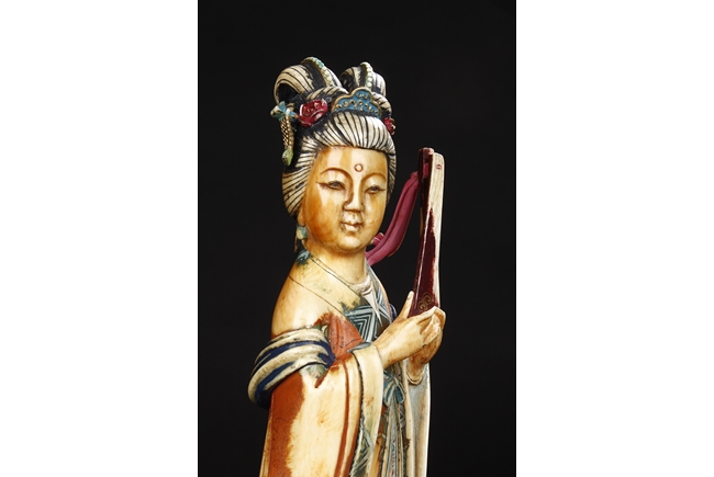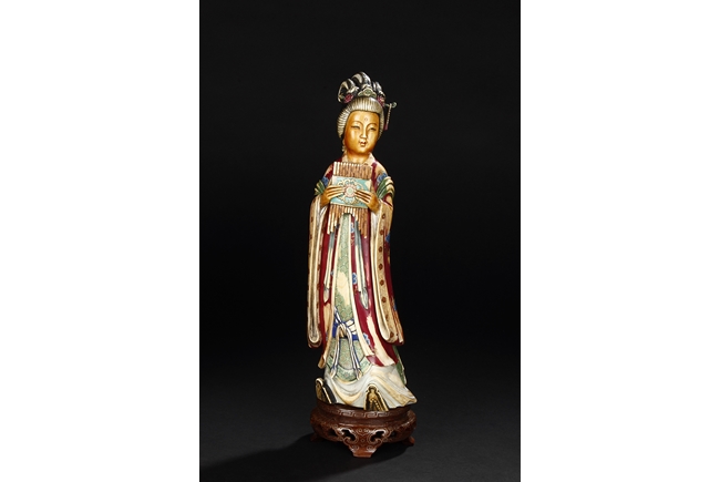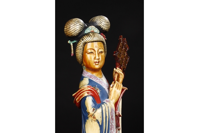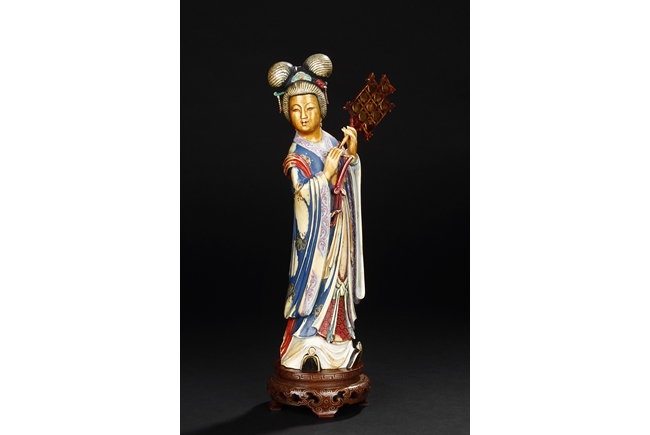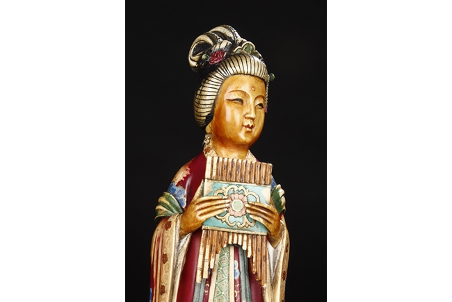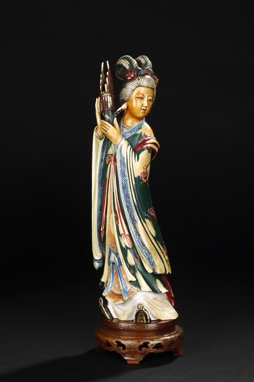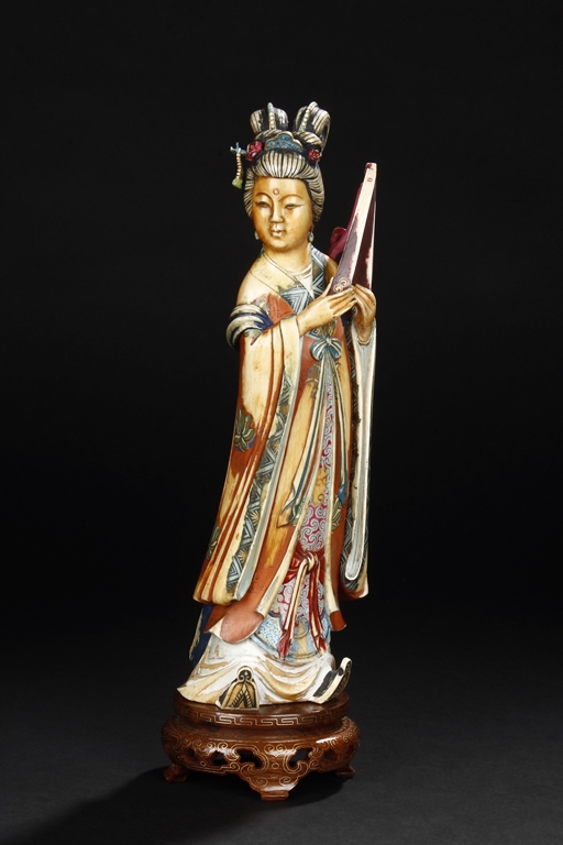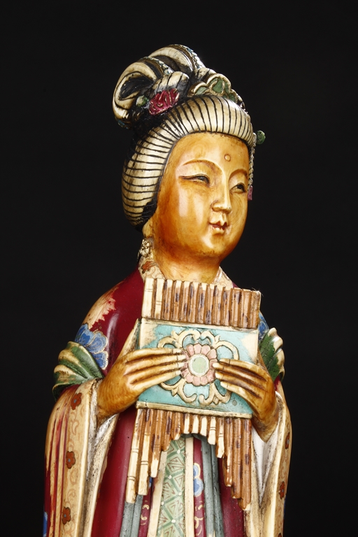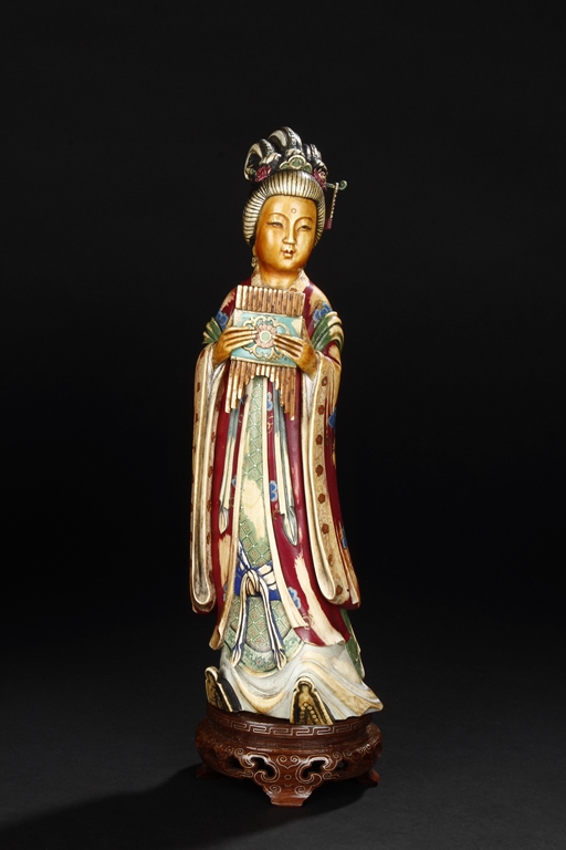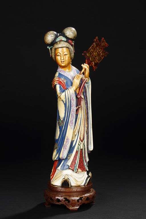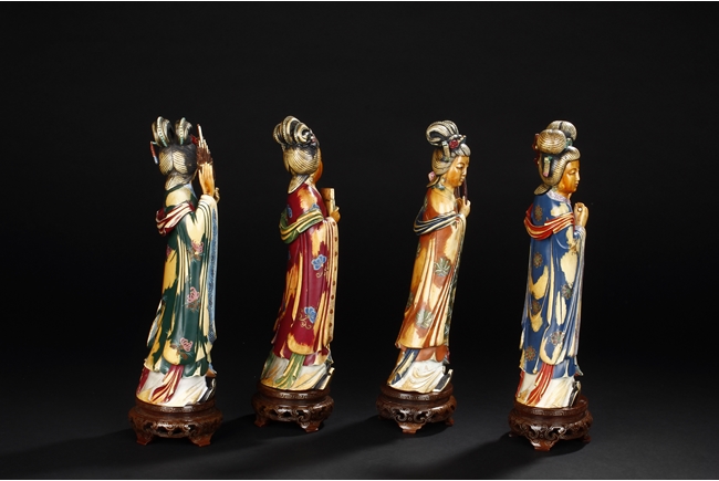 This set includes four ivory figures. Each standing figure is carved wearing long flowing robes and holding different musical instrument including Sheng, Xiao, Gu. Each face is delicately carved with benevolent expression and hair is tied in two topknots. Each supported figure is painted in various colors and supported on a three-leg wood stand.Republic period.