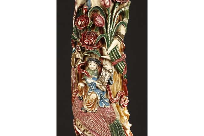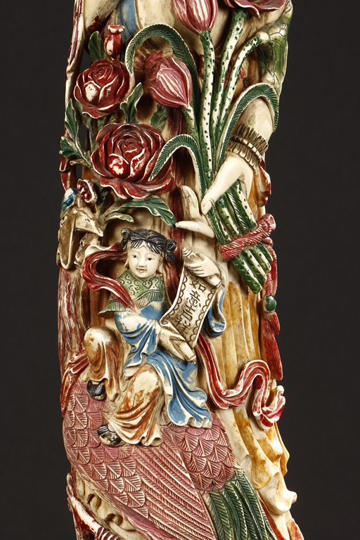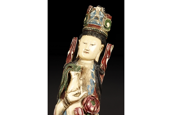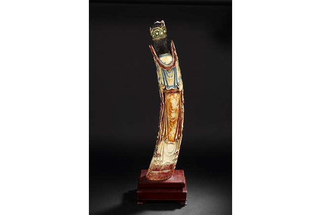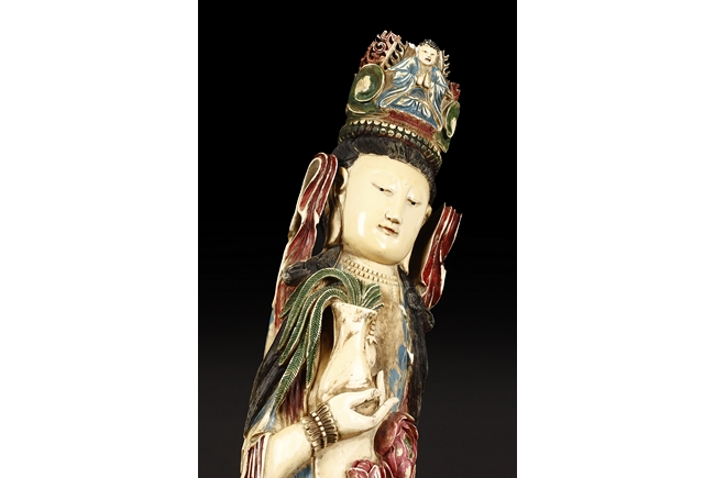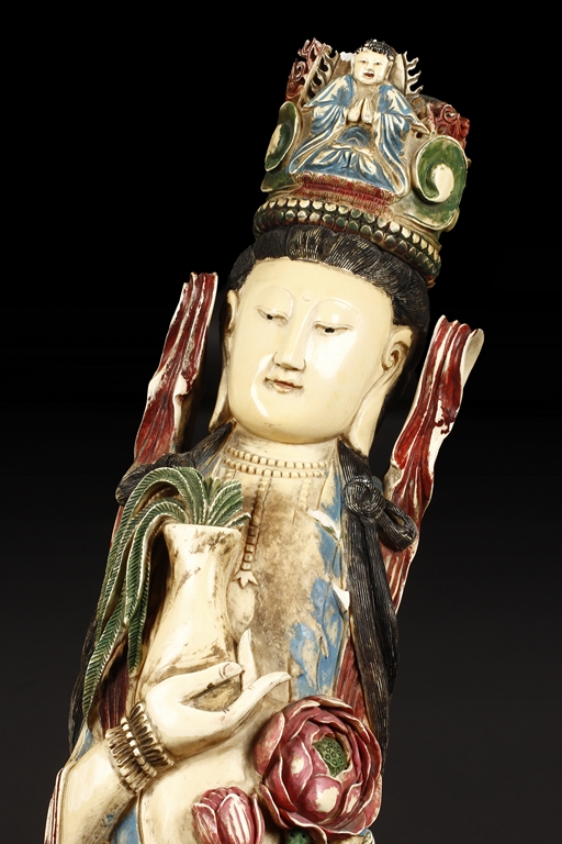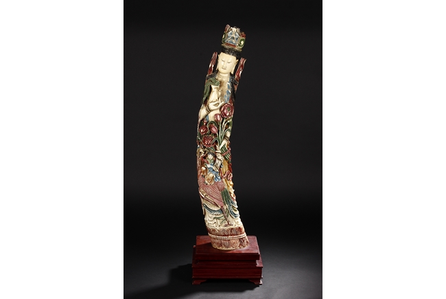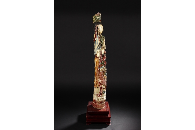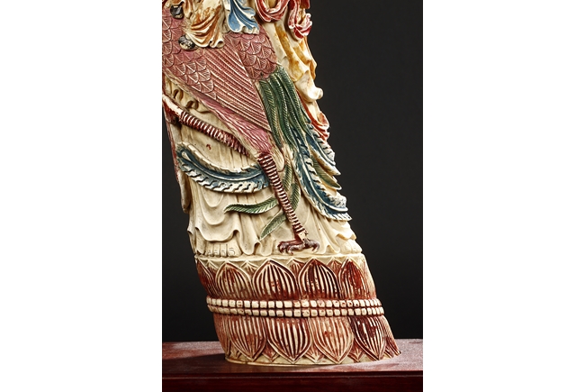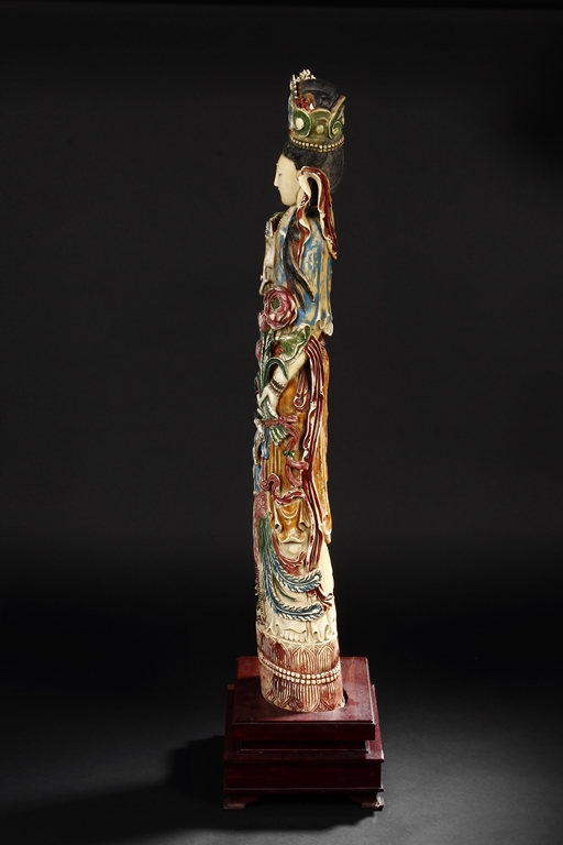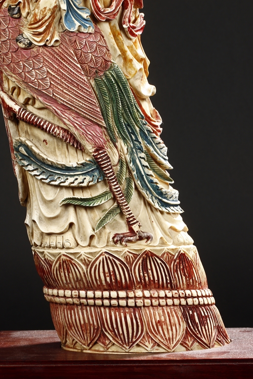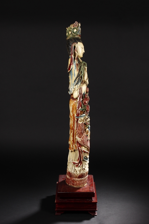 Of unusually large size, this Guanyin figure is modelled swaying to one side, carved wearing a long robe and holding a vase containing a plant and flower sprays on the other hand behind a phoenix and a child. Her face is carved with a serene downcast expression and hair is tied in a topknot hidden by a crown. The Guanyin figure is carved standing a double lotus base and supported by a wood stand. Republic Period.