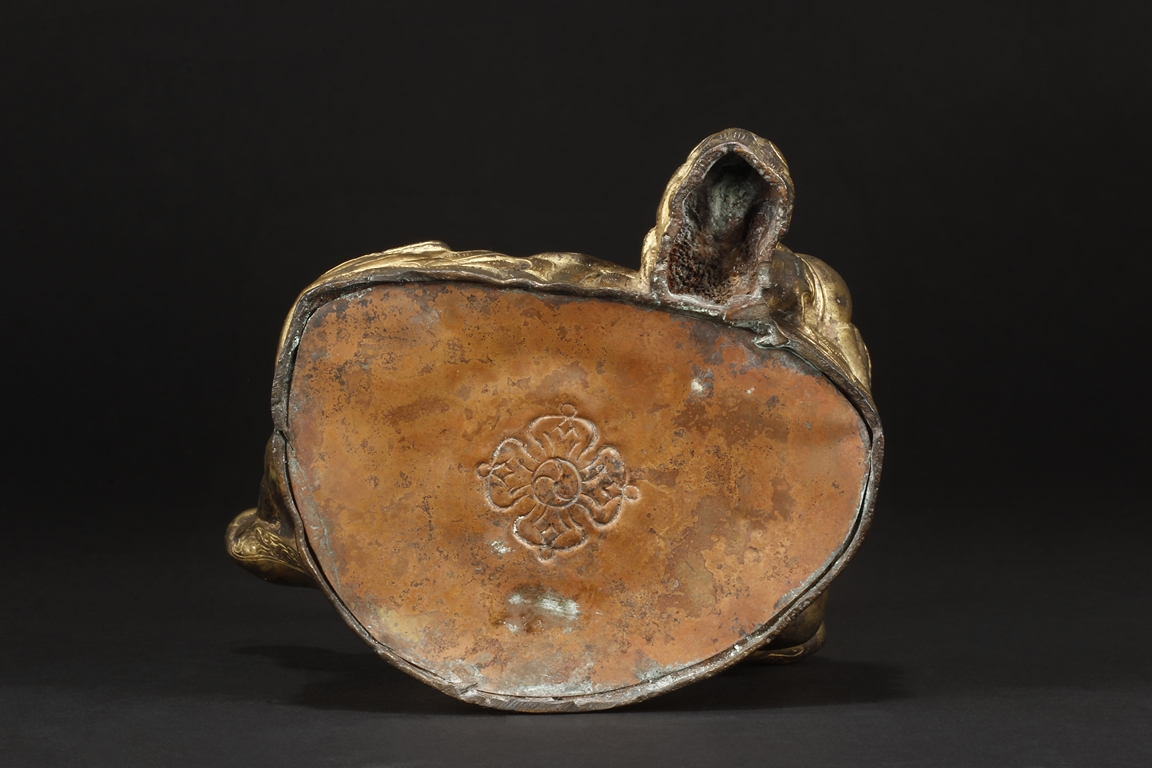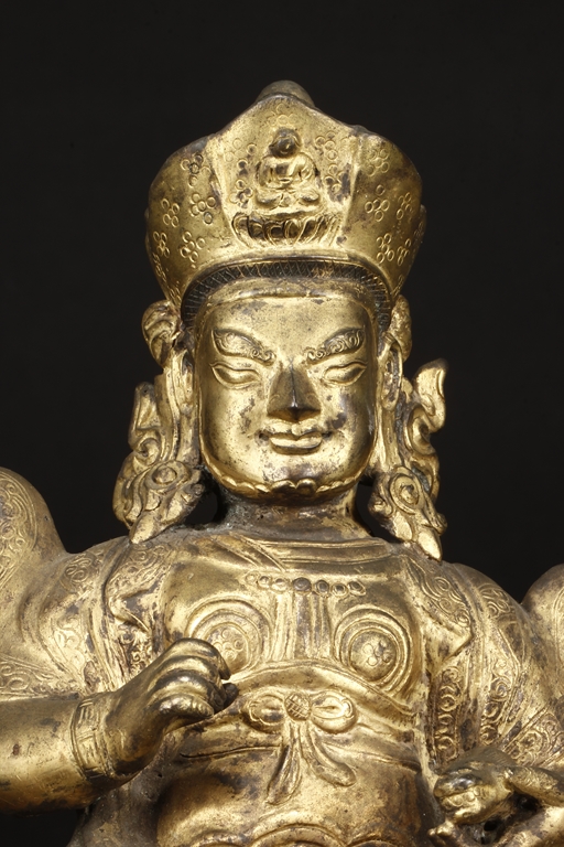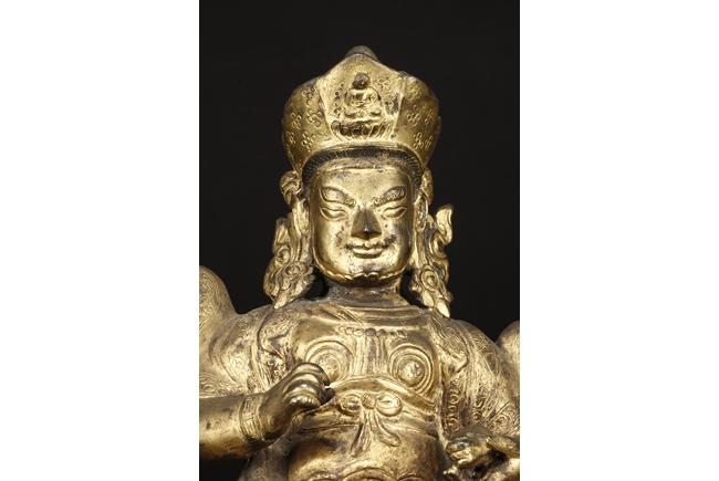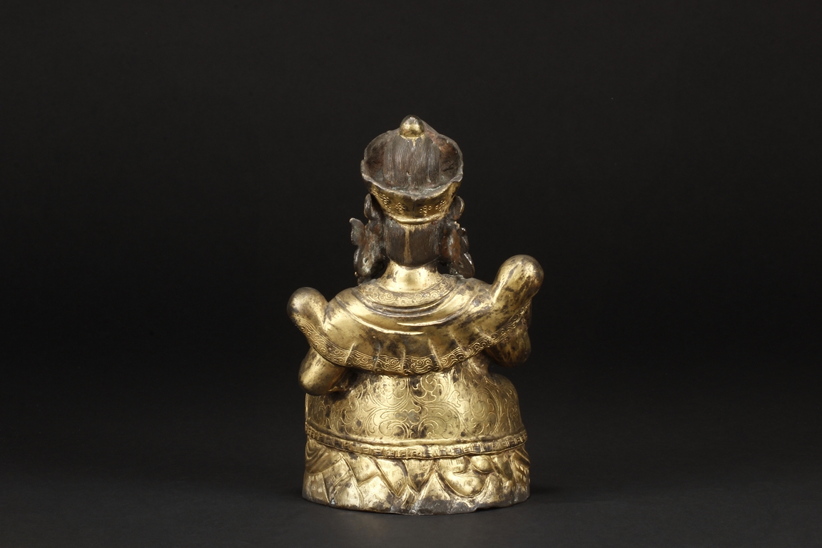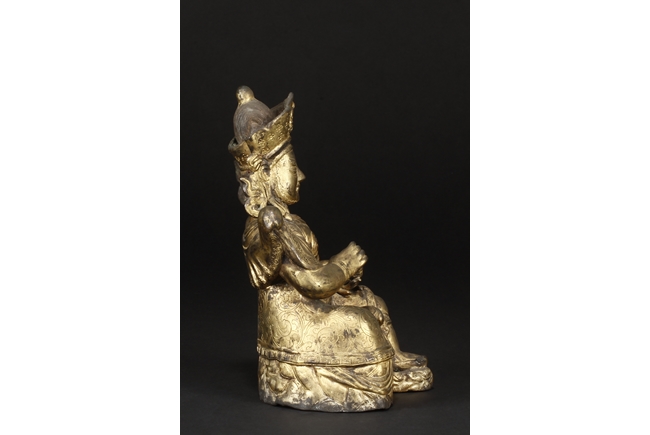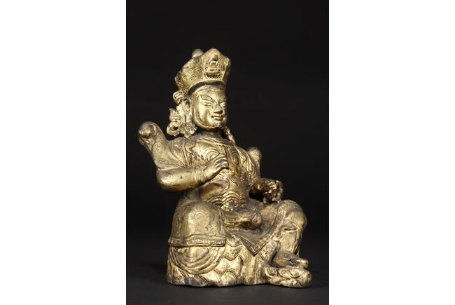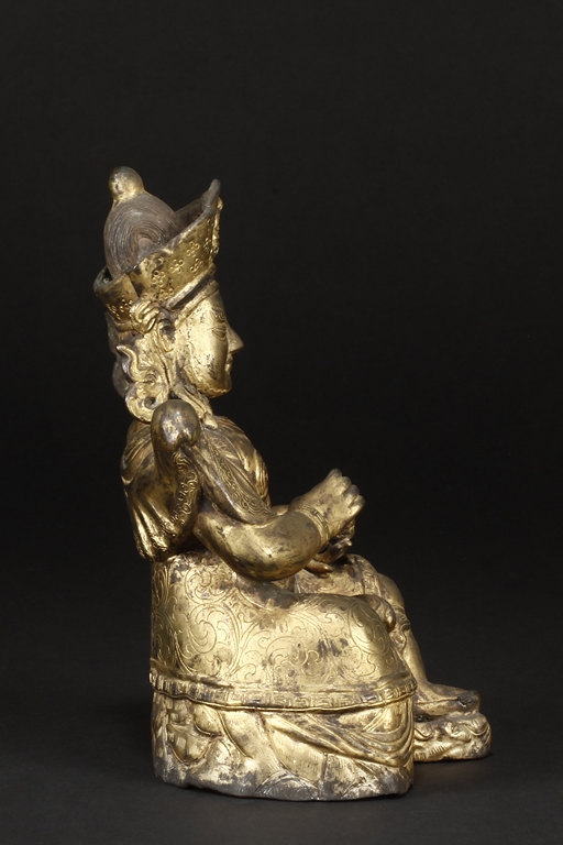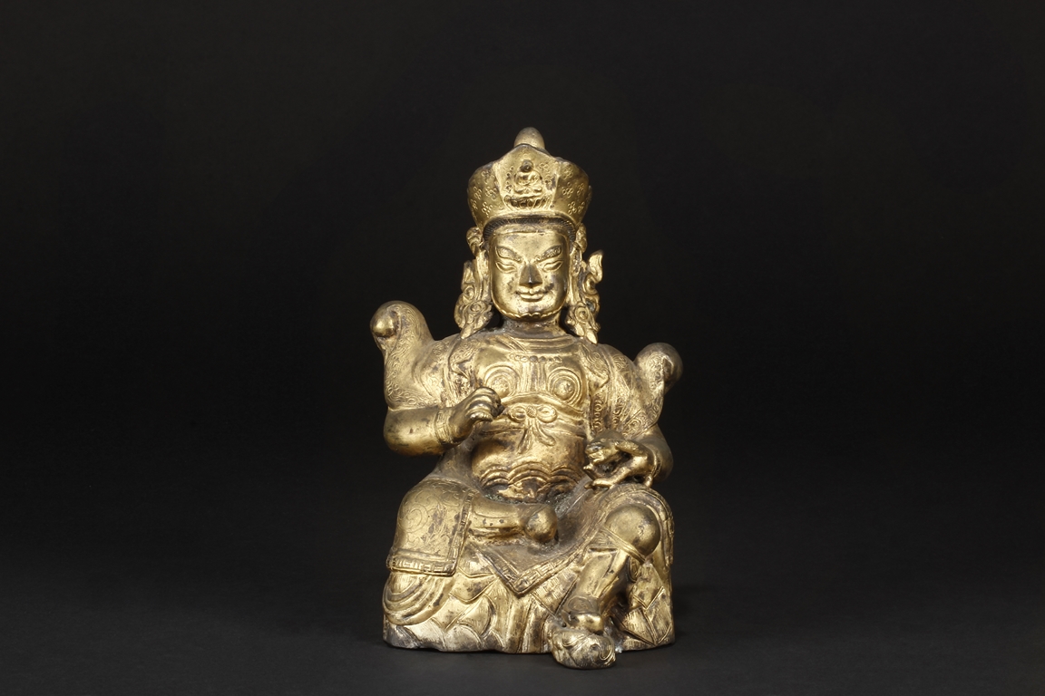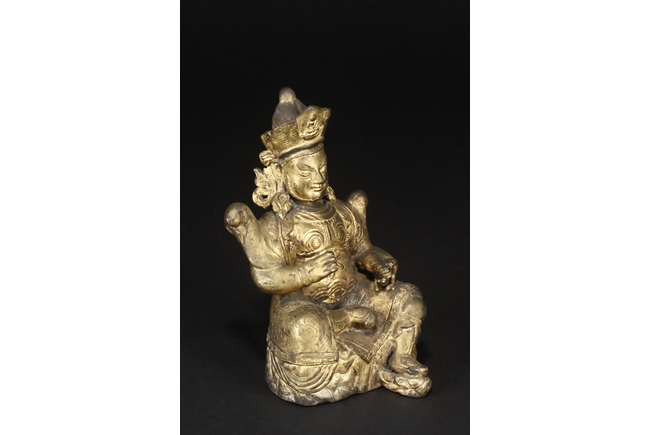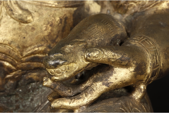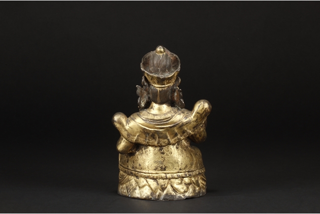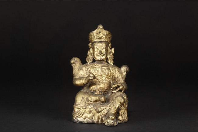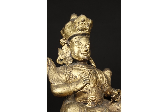 Seated in royal ease on a stand with left foot resting on a base, the Bodhisattva holds a mongoose on left hand, the right hand raises slightly in vitarka mutra, and wearing a loose robe incised with scroll patterns exposing adorned chest. The face is depicted with a sharply arched brows, and the hair tied into a high chignon and topped with a knop.