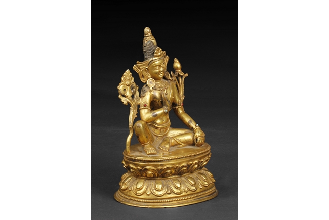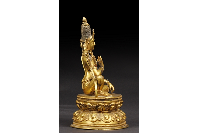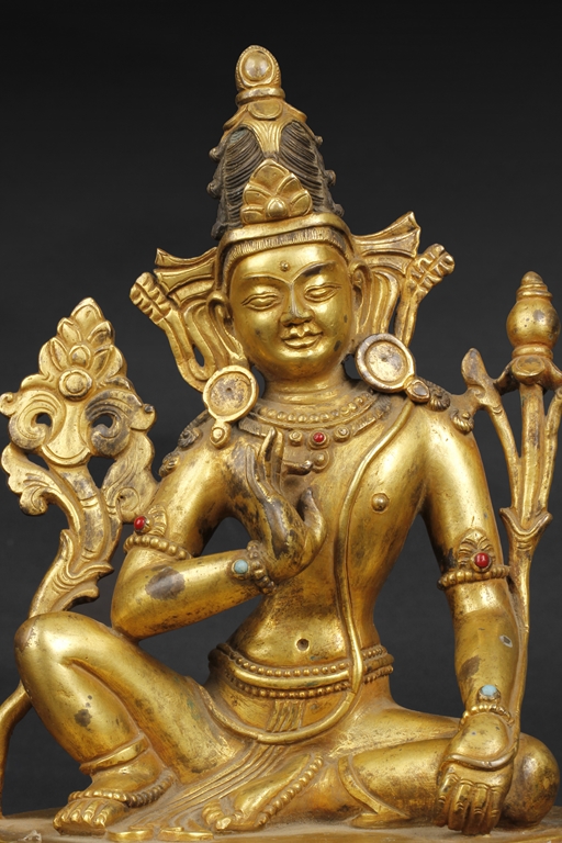 Seated in royal ease on a double lotus throne, his right hand in Vitarka mudra, left hand in Bhumisparsa mudra. The Bodhisattva wears ornate bead strands around neck, arms, and feet, along with a blossoming flower on his right, and a ritual rod on his left side. Qing Dynasty Period.