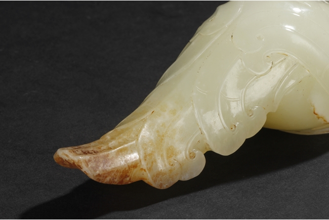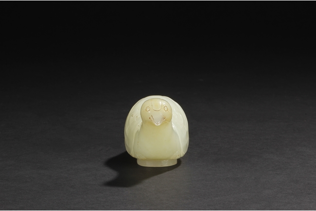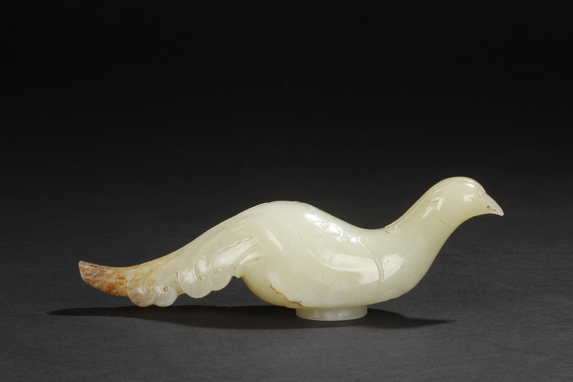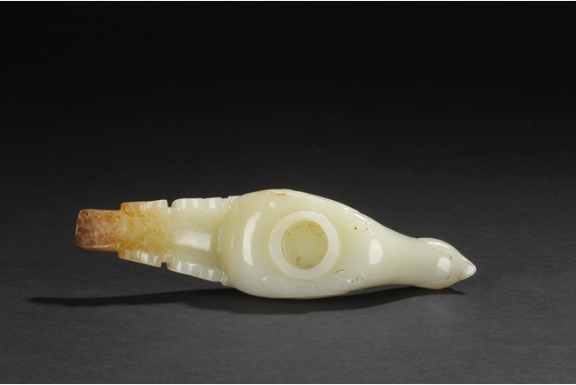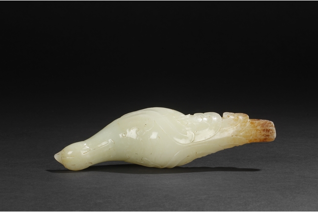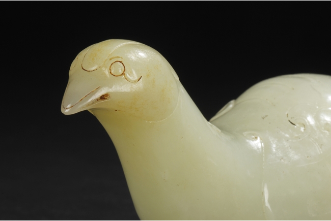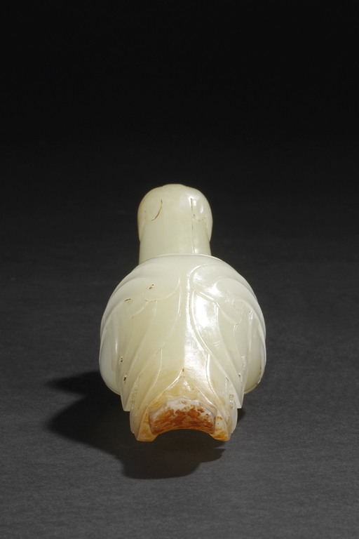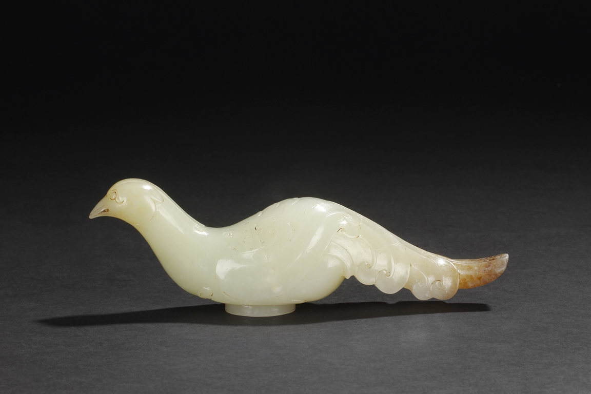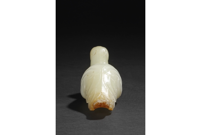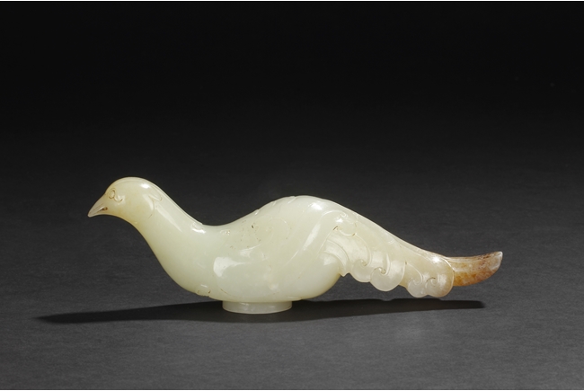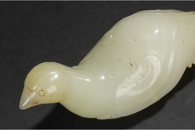 This jade staff-head dove is of overall white tone with russet inclusions on the tail and slight russet marking on the head. The body is gracefully carved with incised lines depicting feathers. Qing Dynasty Period.