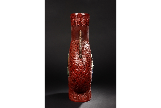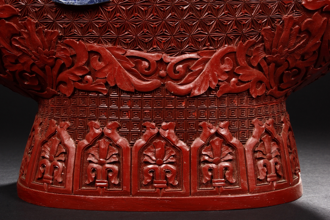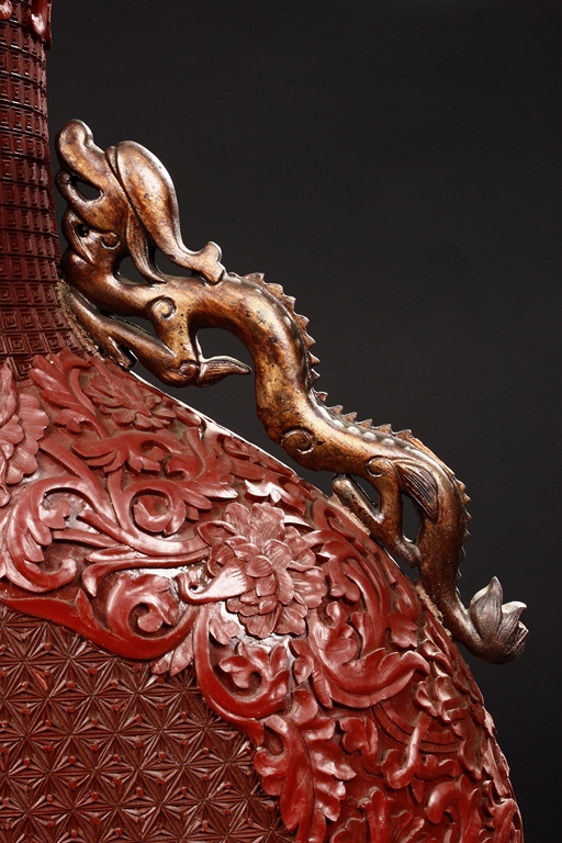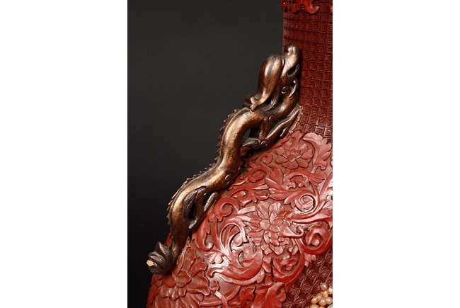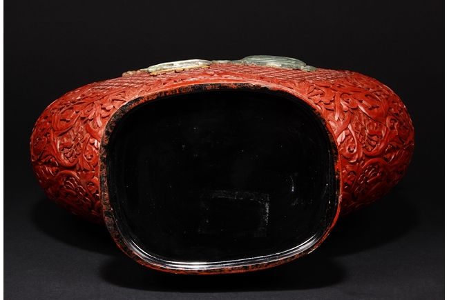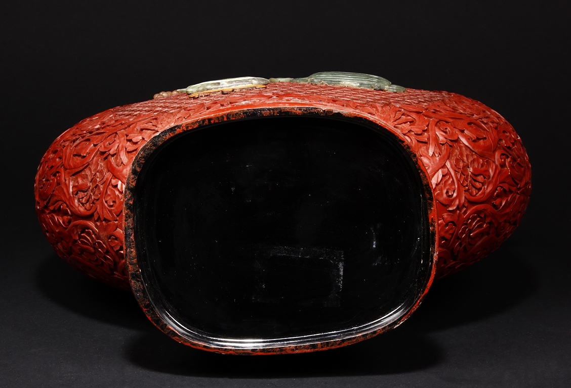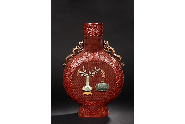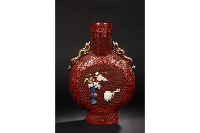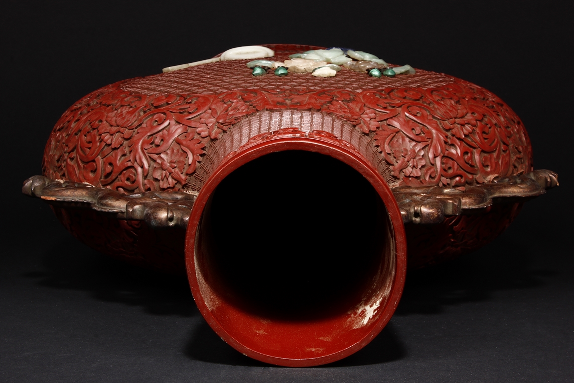 Of flattened ovoid form, the cinnabar lacquer moonflask supported by a splayed foot ovoid ring, decorated with sectioned flower band pattern against rectangular patterns, the body inset with semi-precious gems including jade, agate, jadeite, malachite, and lapis lazuli, decorated in formation of flower planters, jar, and censer on the front and back side, within floral patterns on the side and diamond triangular patterns on the background, two bronze dragons mounted on the shoulder, the straight cylindrical neck decorated with similar motif floral patterns and key-fret patterns.