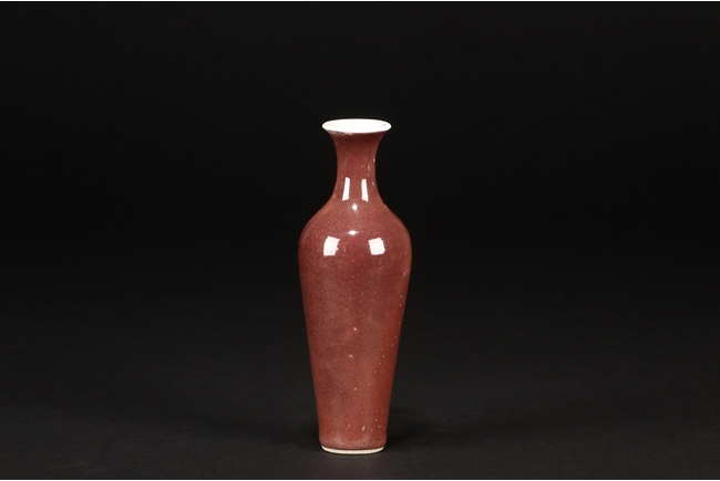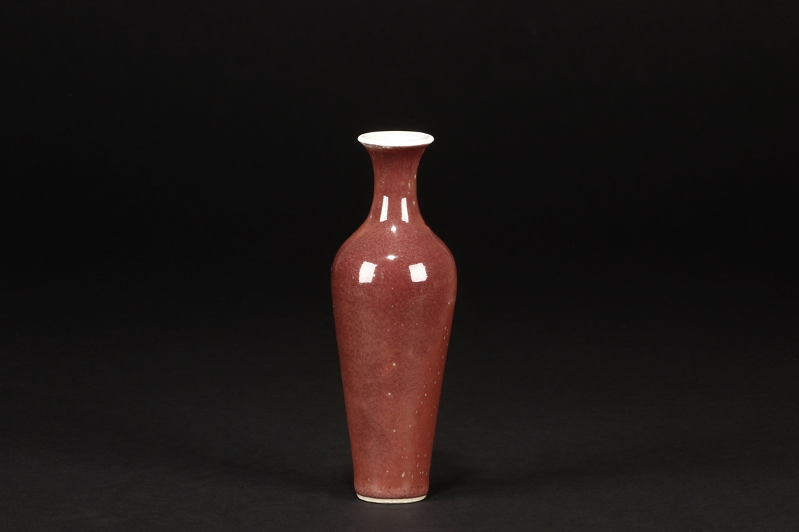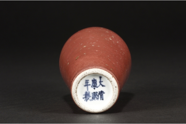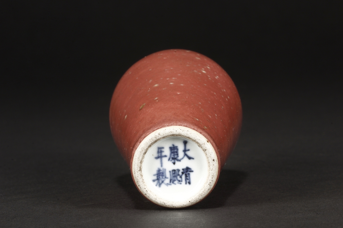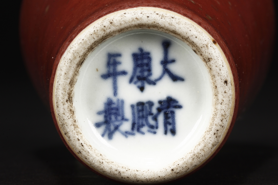 Of slender cylindrical shape, this vase has a high rounded shoulder tapers to a small foot and finely covered with copper red glazed ground. The bottom bears the six character mark "Kangxi". Qing Dynasty period.