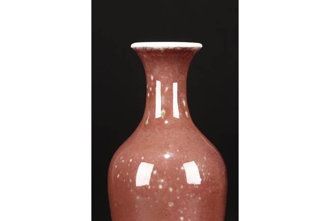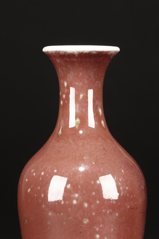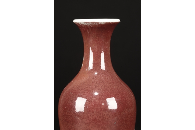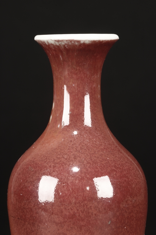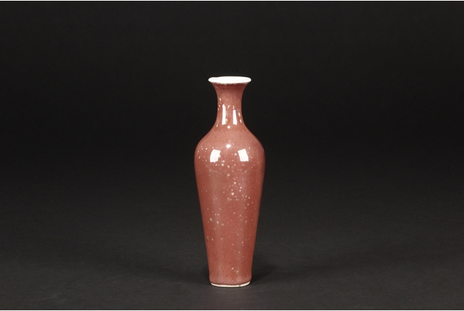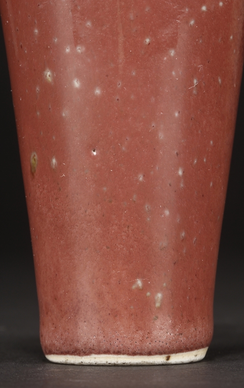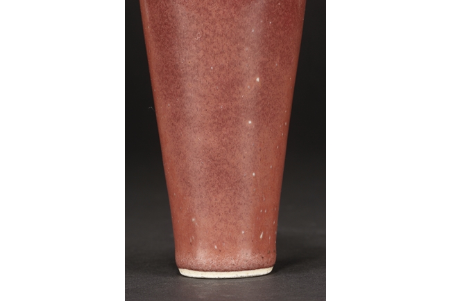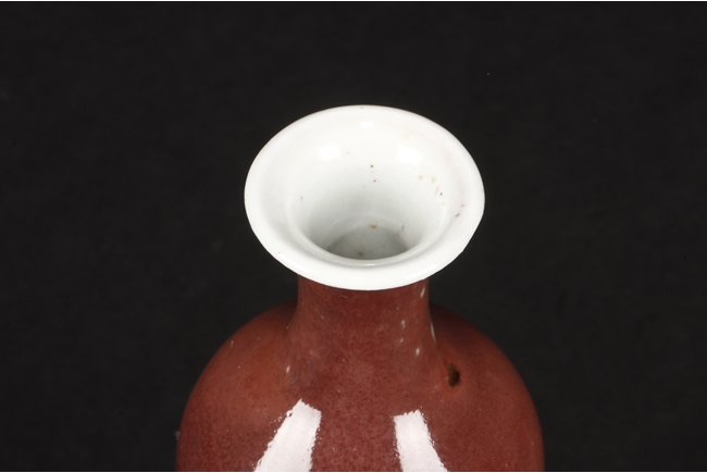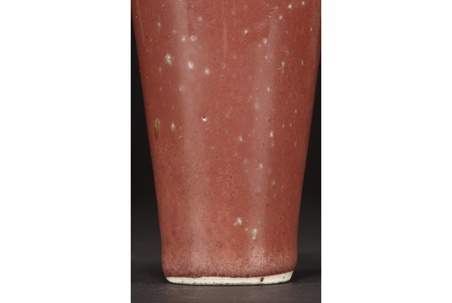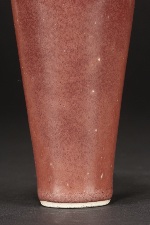 Of slender cylindrical shape, this vase has a high rounded shoulder tapers to a small foot and finely covered with copper red glazed ground. The bottom bears the six character mark "Kangxi". Qing Dynasty period.