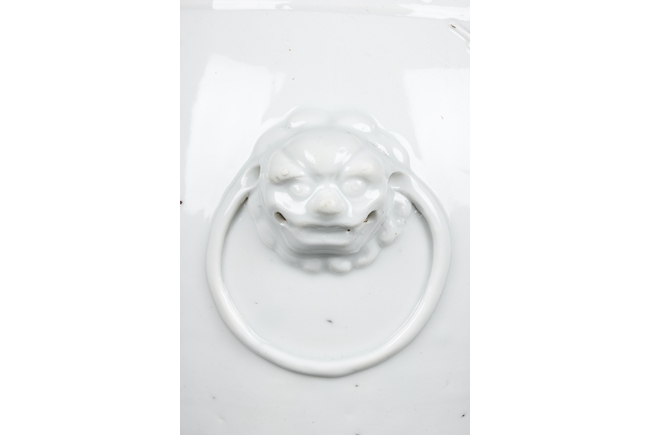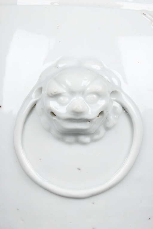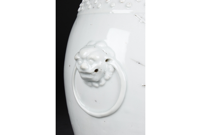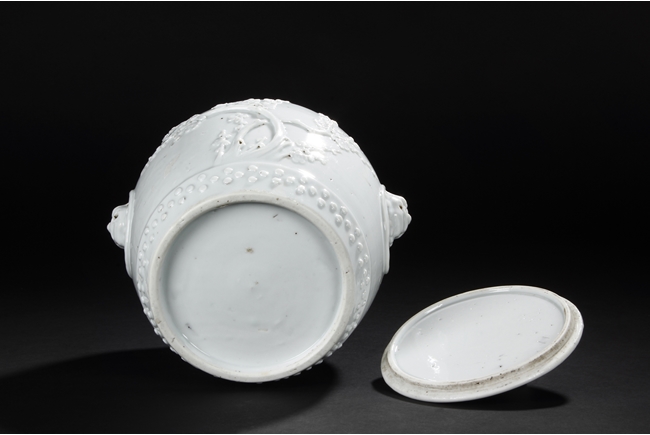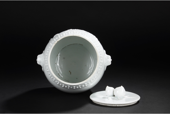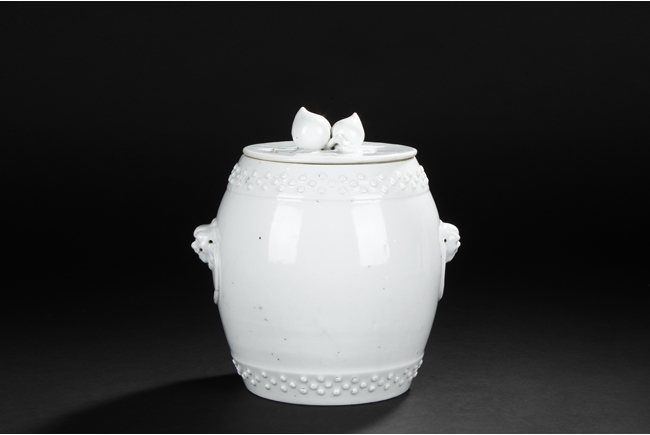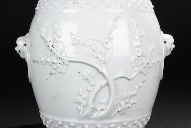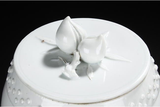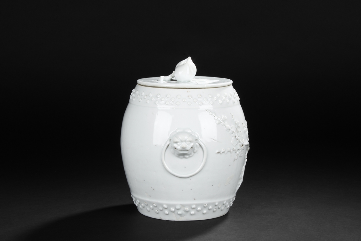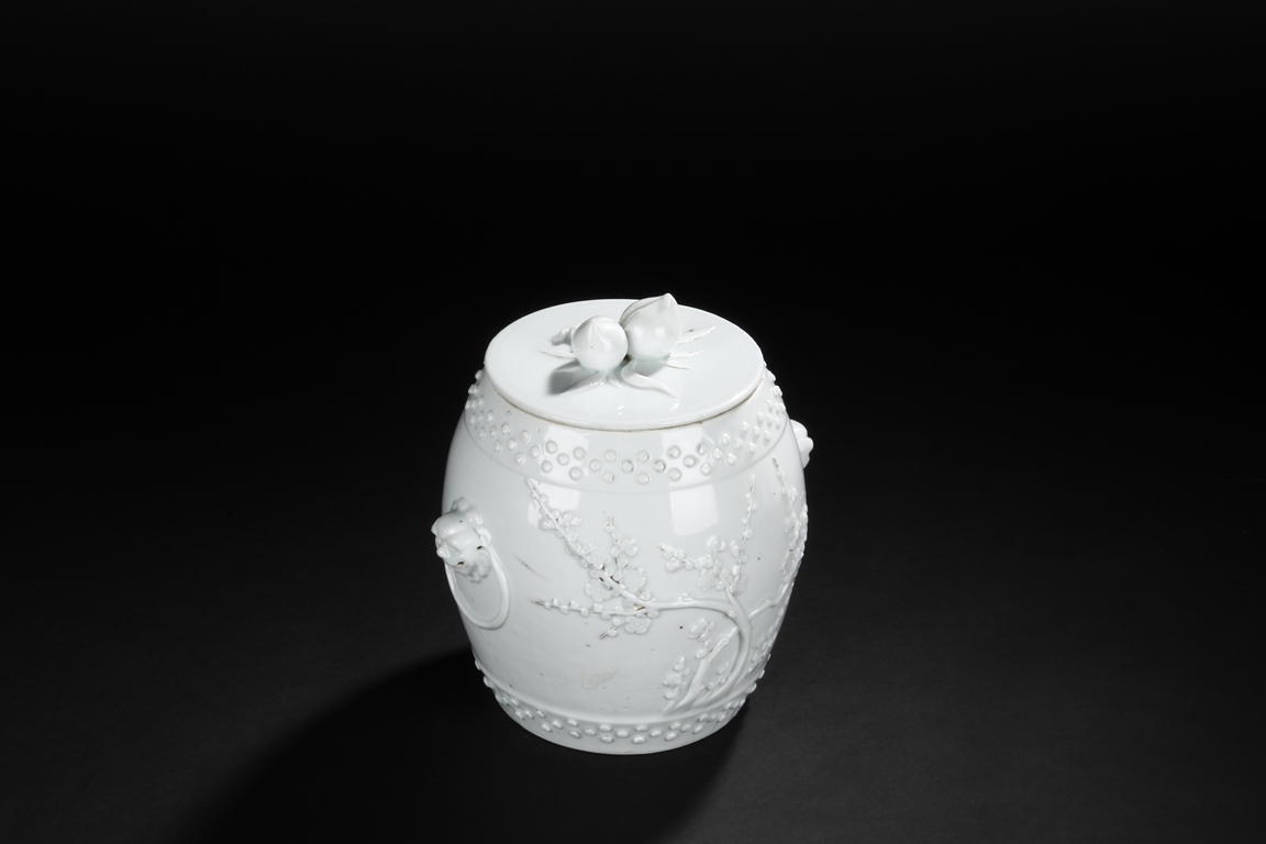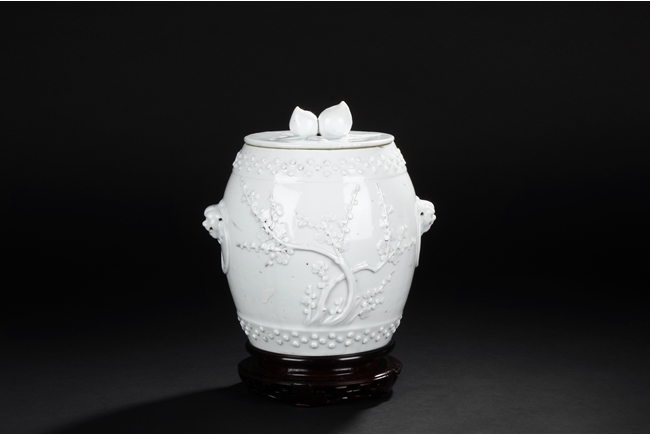 Of baluster form, the jar is applied with relief decoration of plum blossom flanked by two dotted bands surrounding base and rim. The sides are decorated with two high relief mythical beast ring handles and the cover is mounted with two peaches as finial. Qing Dynasty period.