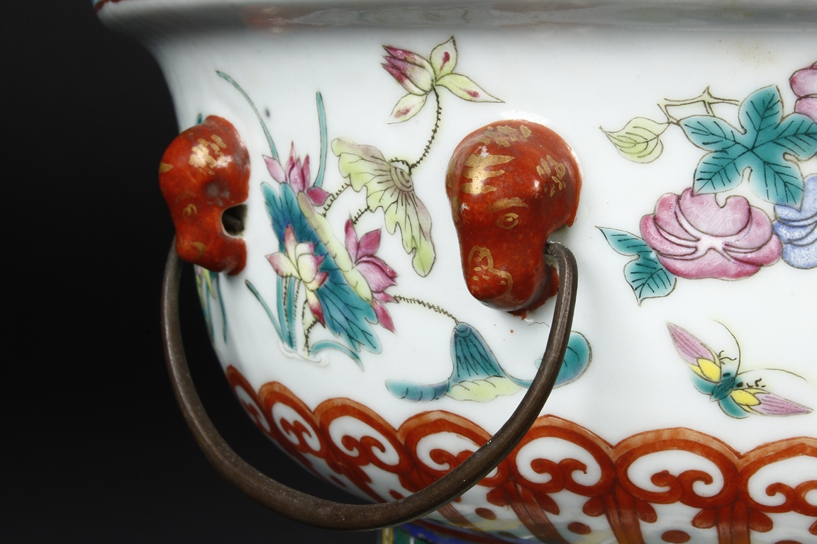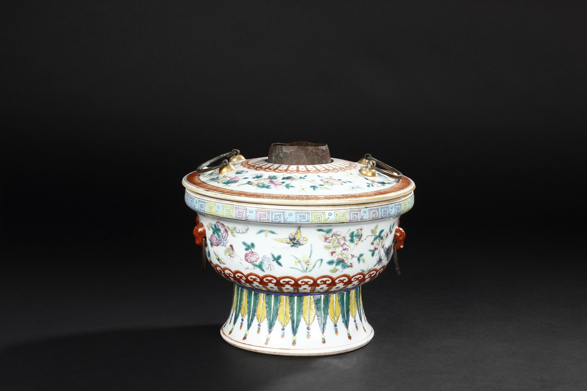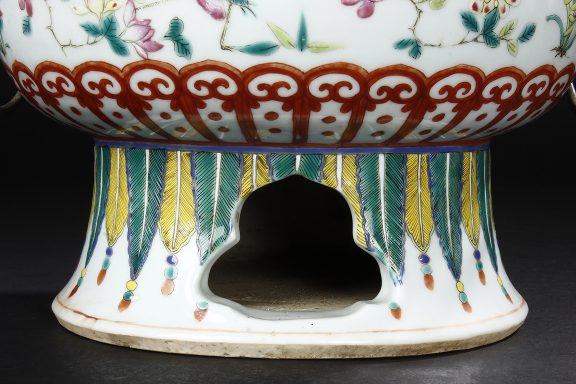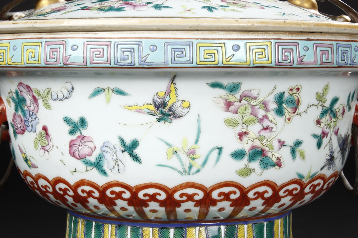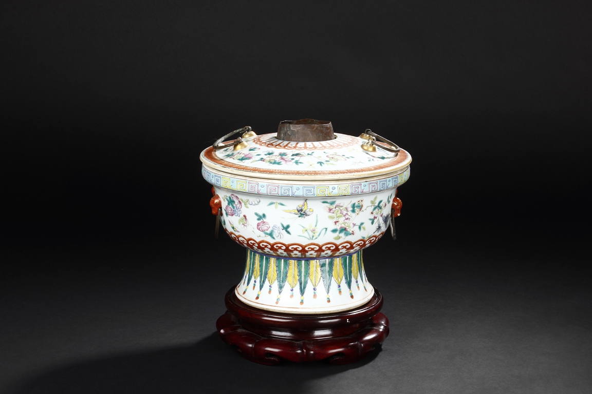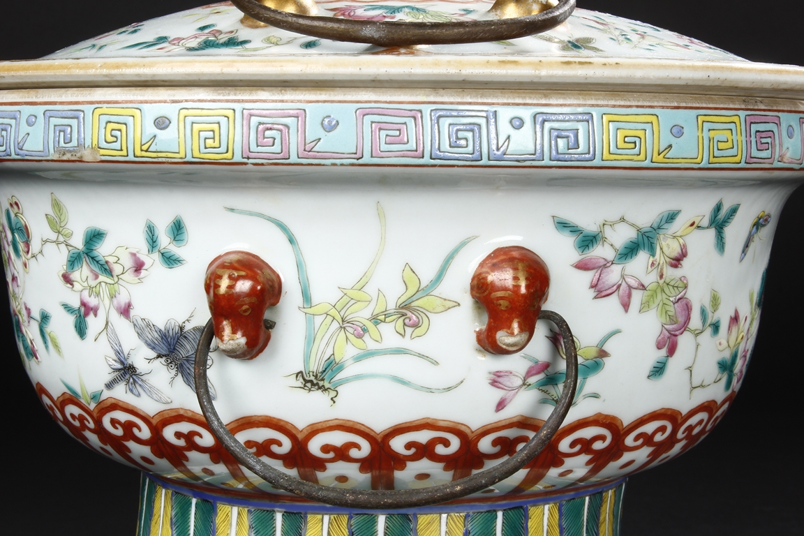 Supported by long splayed foot, the flaring body rises to an everted rim with a cover. The foot is decorated with leaves motif with a opening to the reverse and the body is painted with flower sprays and butterflies flanked by two high-relief mythical best ring handles. The everted rim is outlined with key-fret pattern. The cover is mounted with two ring handles and a bronze air opening as finial. Late Qing Dynasty period,