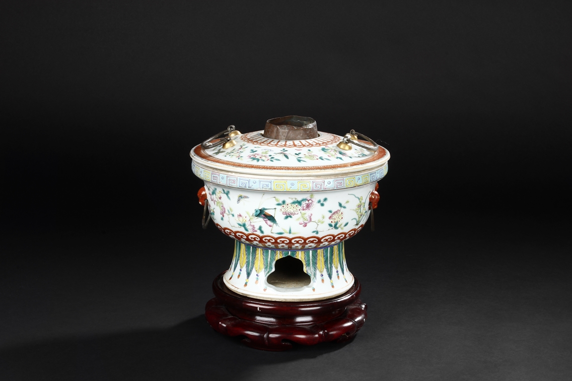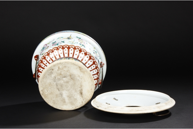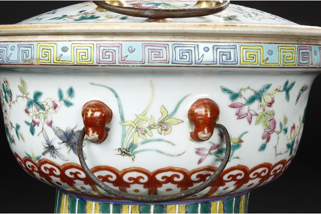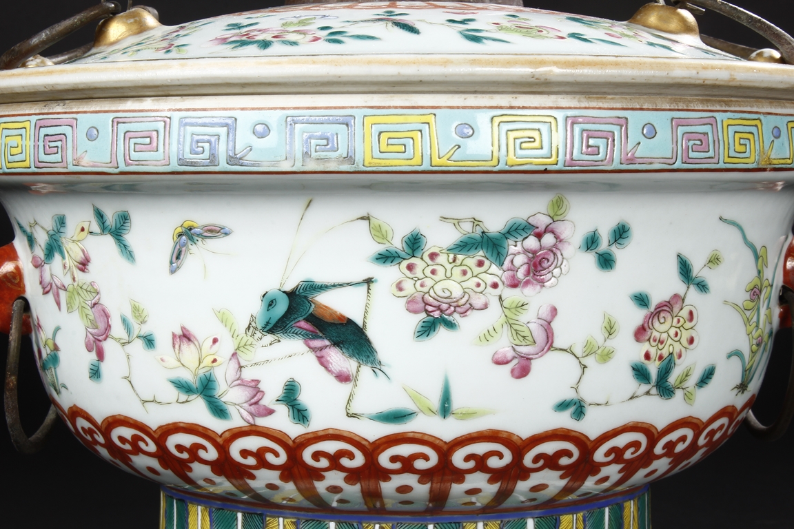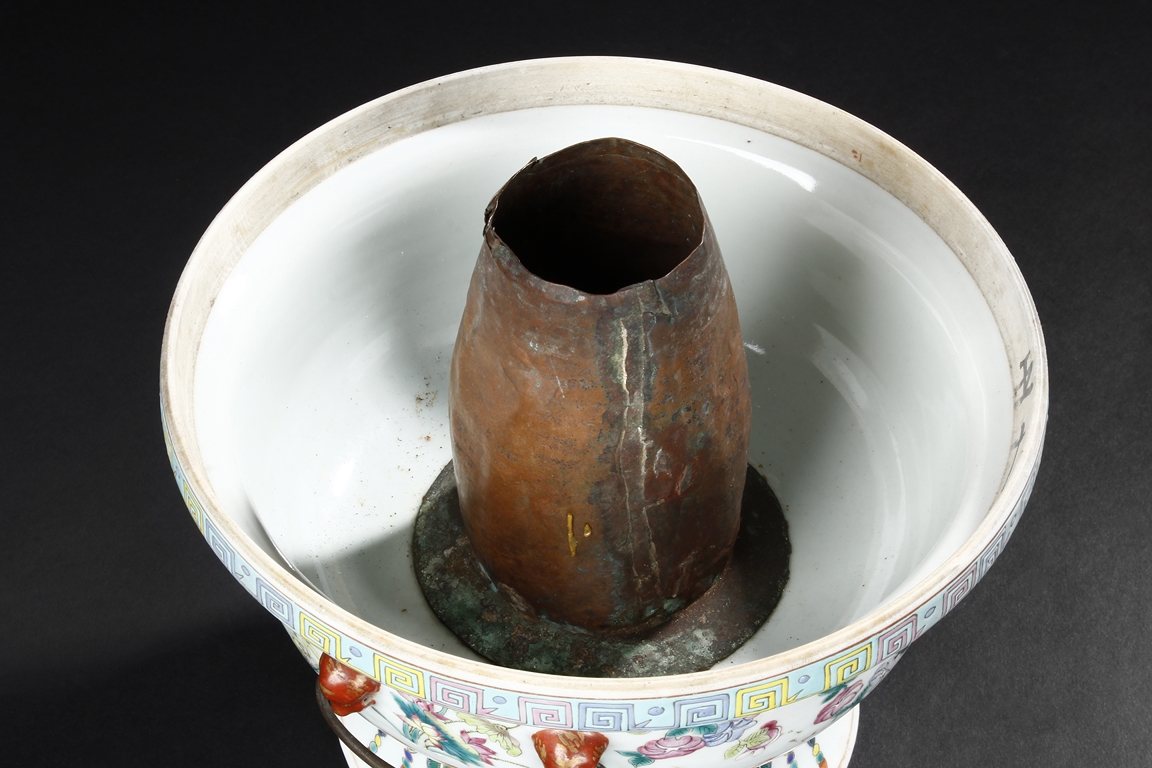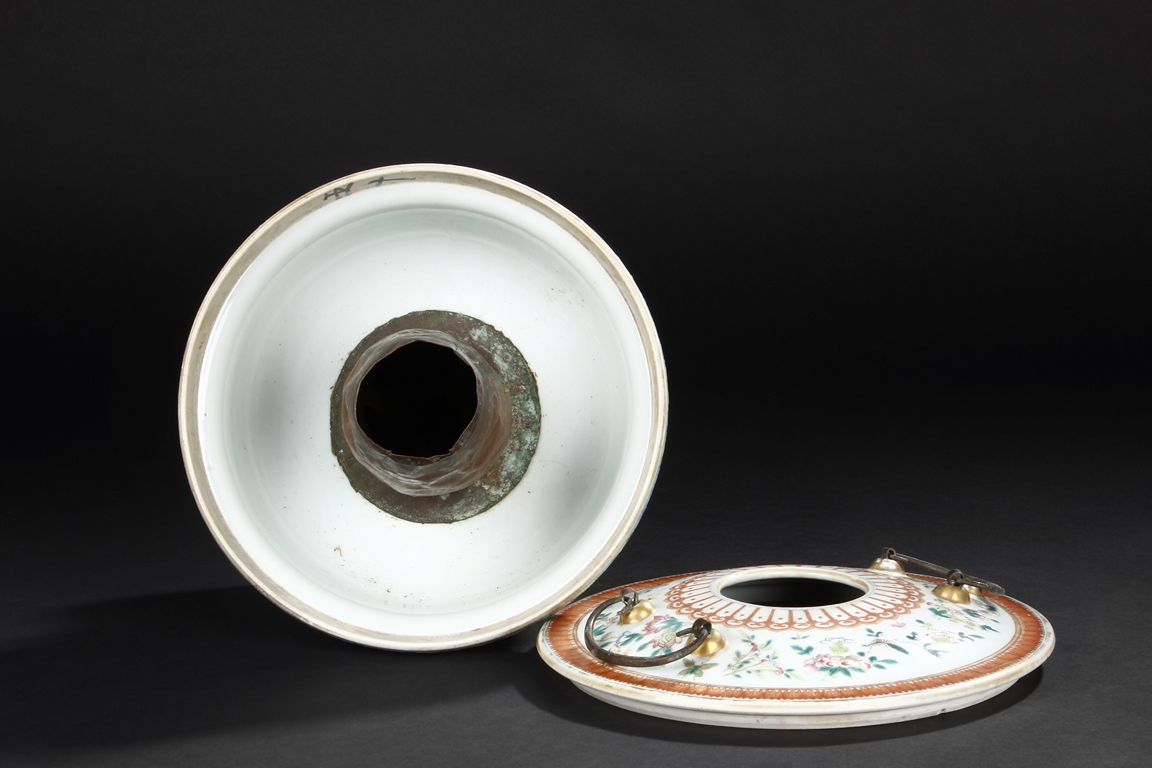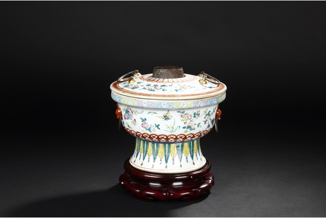 Supported by long splayed foot, the flaring body rises to an everted rim with a cover. The foot is decorated with leaves motif with a opening to the reverse and the body is painted with flower sprays and butterflies flanked by two high-relief mythical best ring handles. The everted rim is outlined with key-fret pattern. The cover is mounted with two ring handles and a bronze air opening as finial. Late Qing Dynasty period,