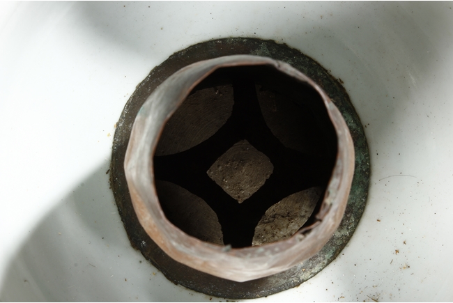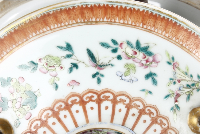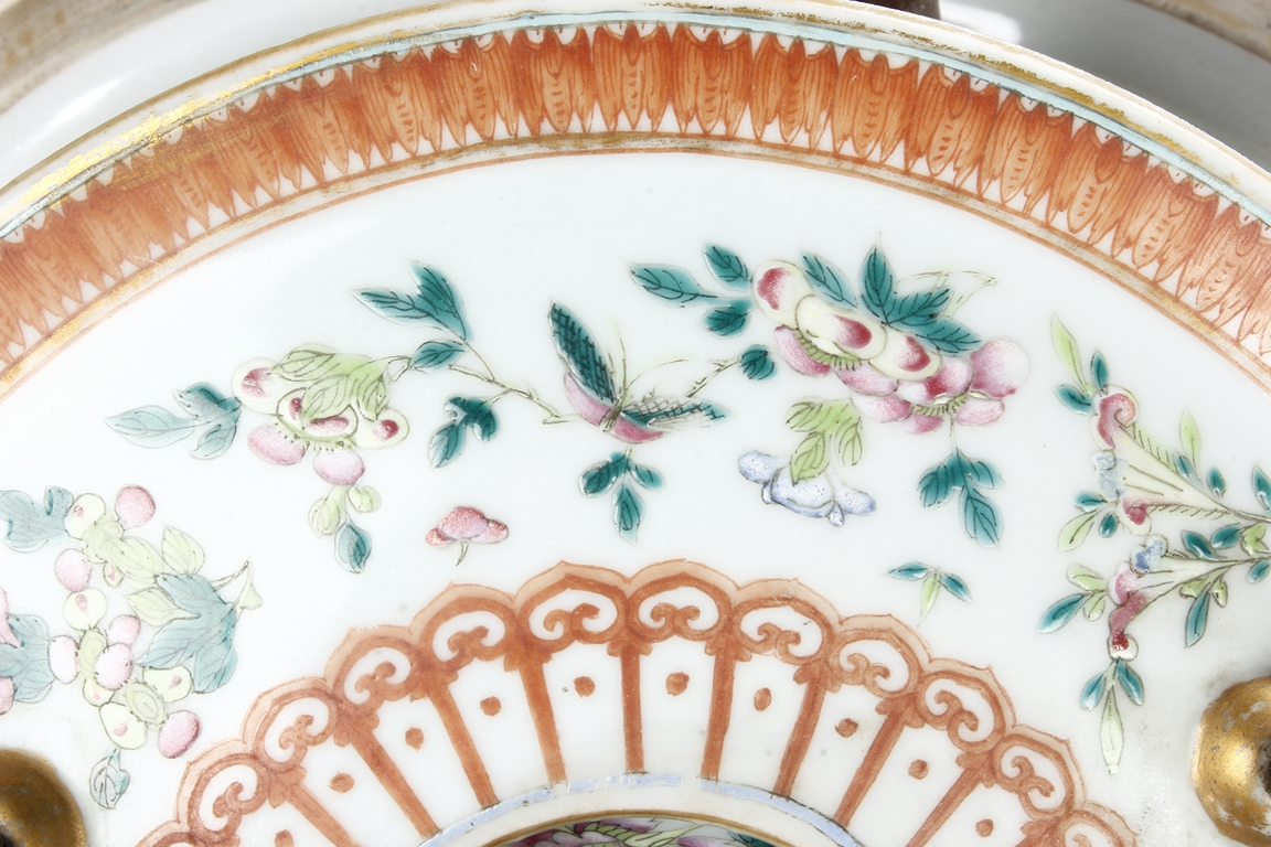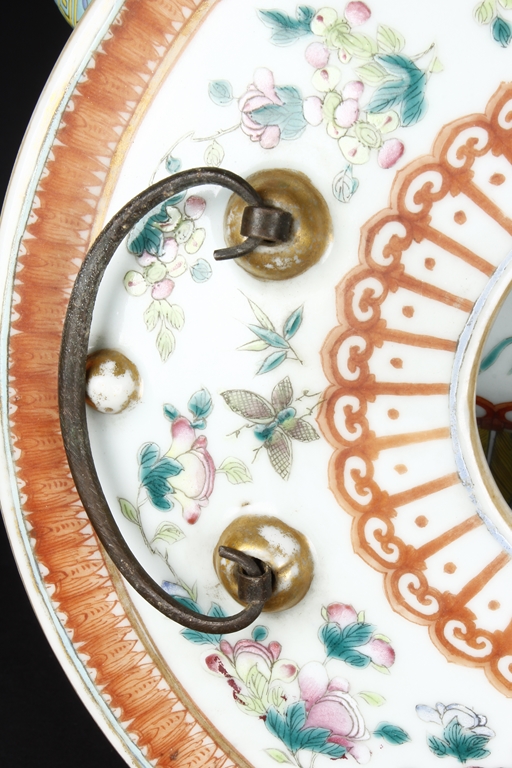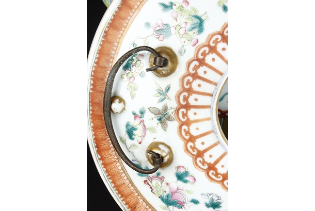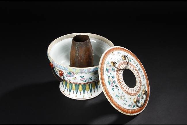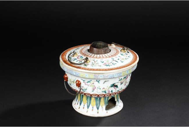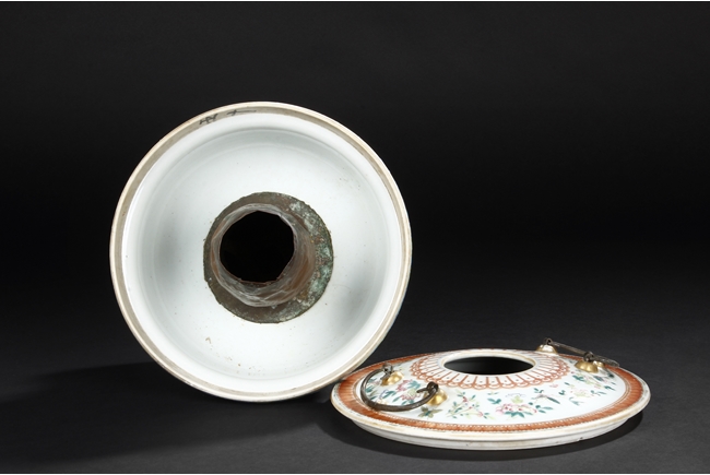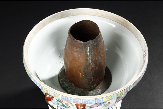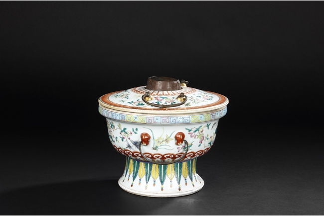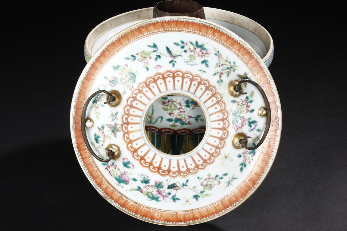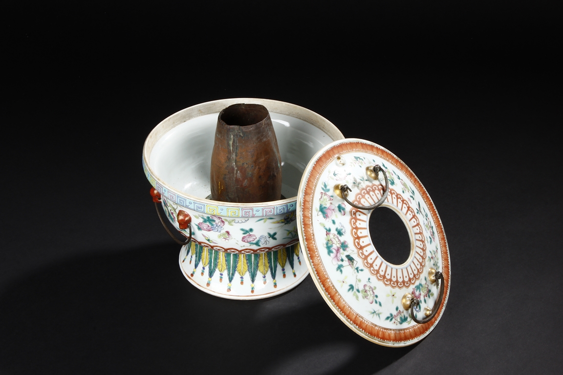 Supported by long splayed foot, the flaring body rises to an everted rim with a cover. The foot is decorated with leaves motif with a opening to the reverse and the body is painted with flower sprays and butterflies flanked by two high-relief mythical best ring handles. The everted rim is outlined with key-fret pattern. The cover is mounted with two ring handles and a bronze air opening as finial. Late Qing Dynasty period,