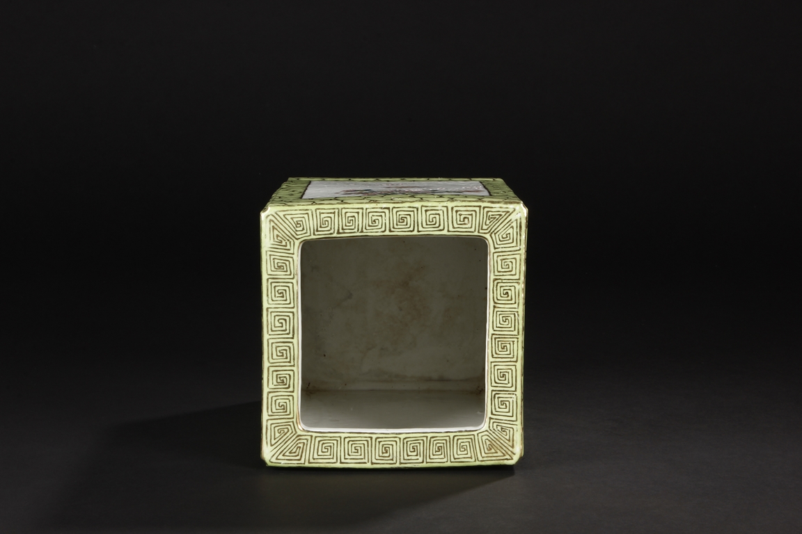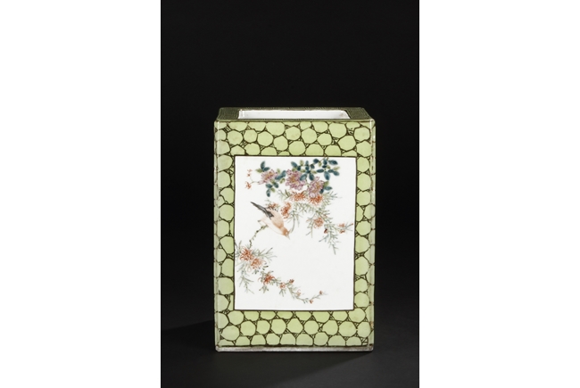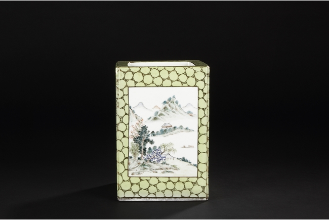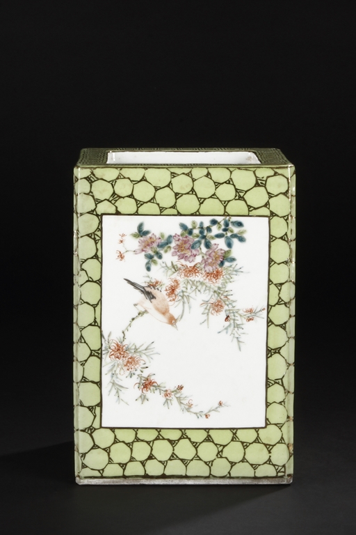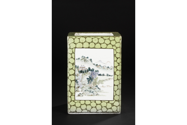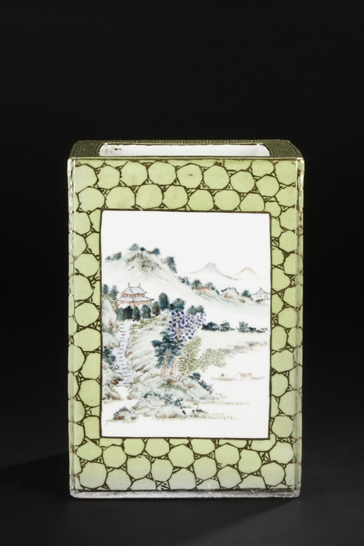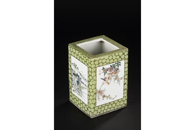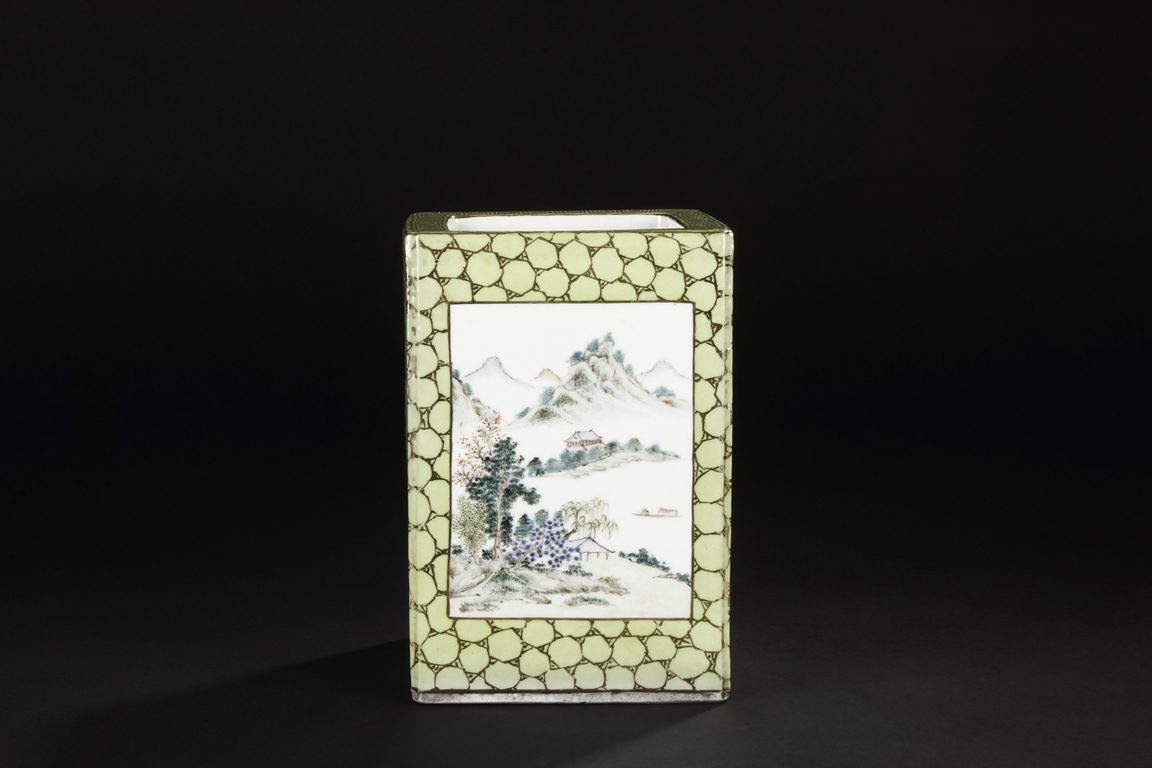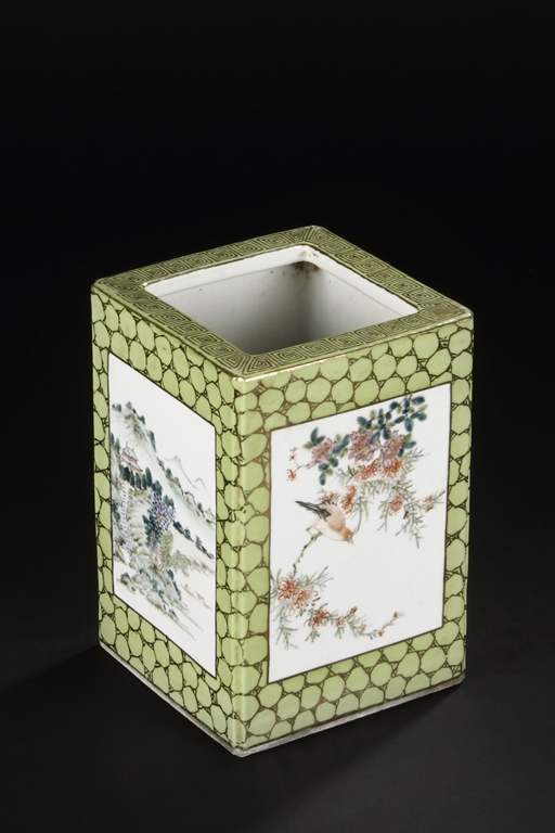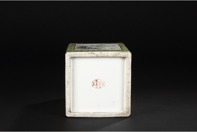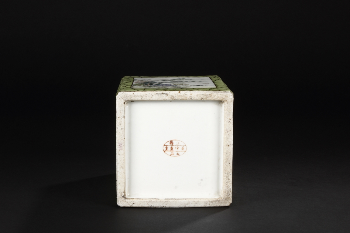 Of rectangular shape and square sectioned, each side of this brush pot is decorated in rectangular panels with alternating landscape and flowering scene, all on a green glazed ground. The bottom bears eight character mark "Jiang Xi Hua Zhen Hua Shi Chu Pin". Republic Period.