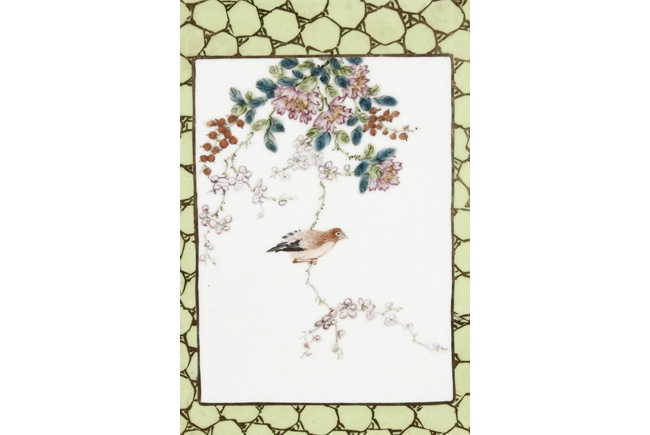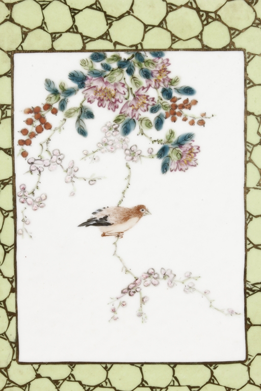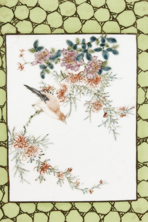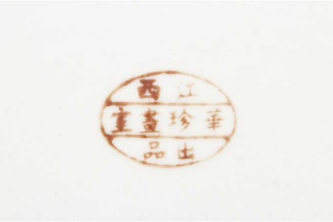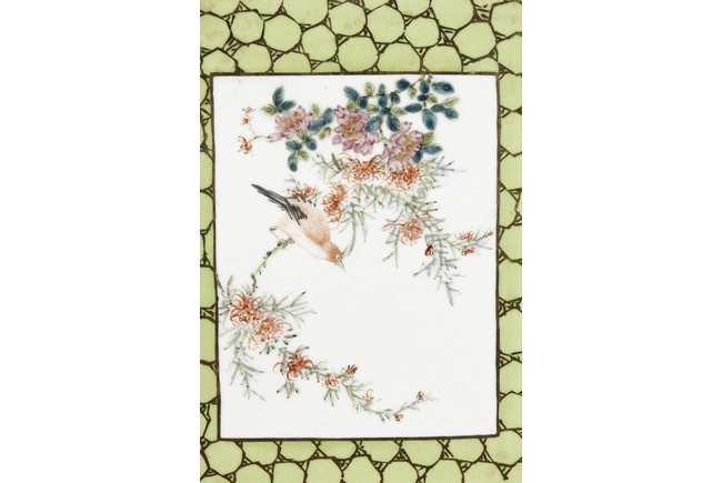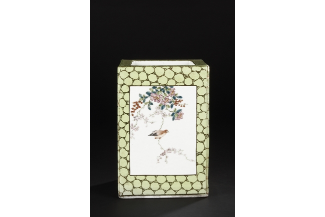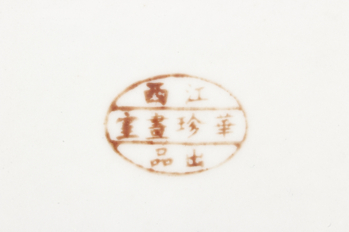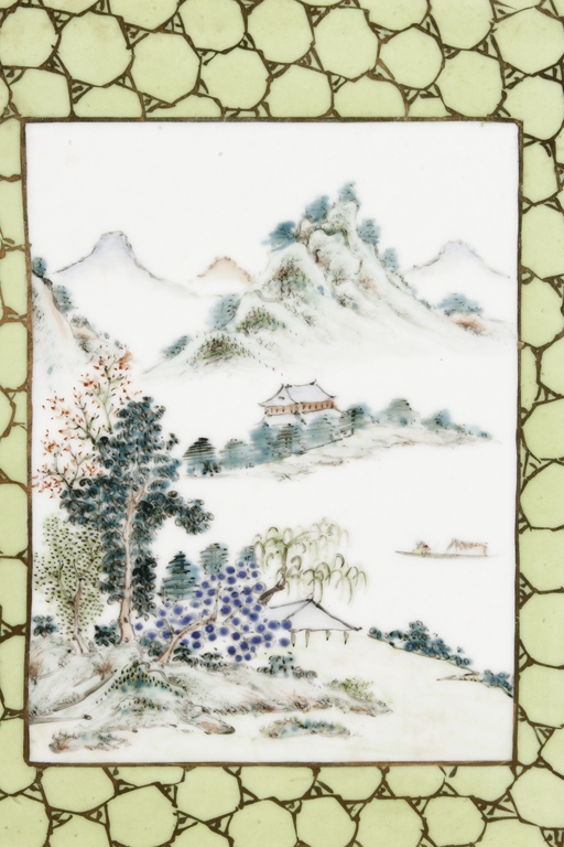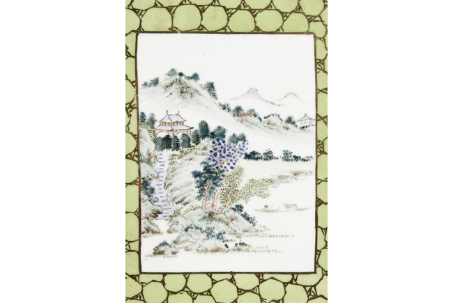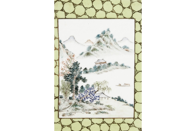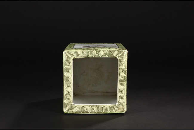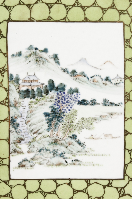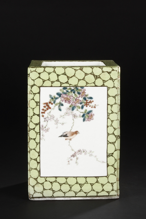 Of rectangular shape and square sectioned, each side of this brush pot is decorated in rectangular panels with alternating landscape and flowering scene, all on a green glazed ground. The bottom bears eight character mark "Jiang Xi Hua Zhen Hua Shi Chu Pin". Republic Period.