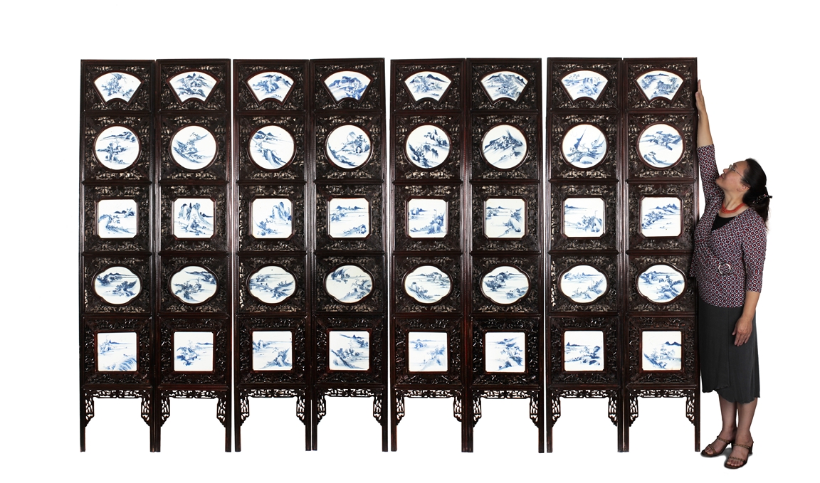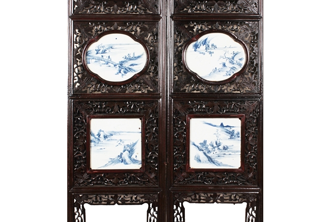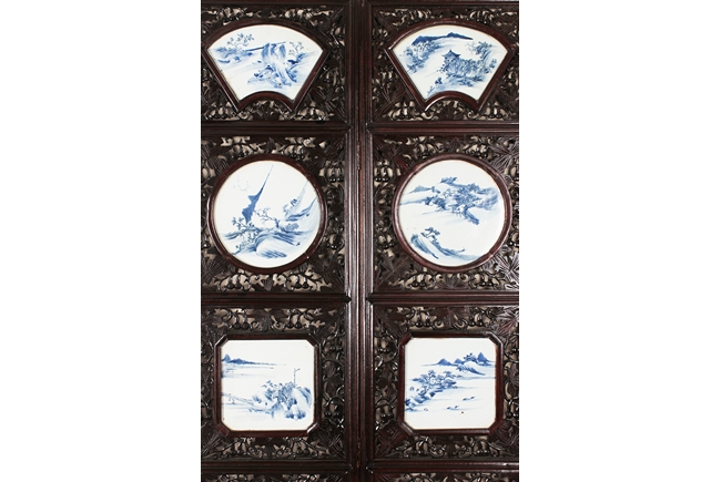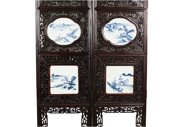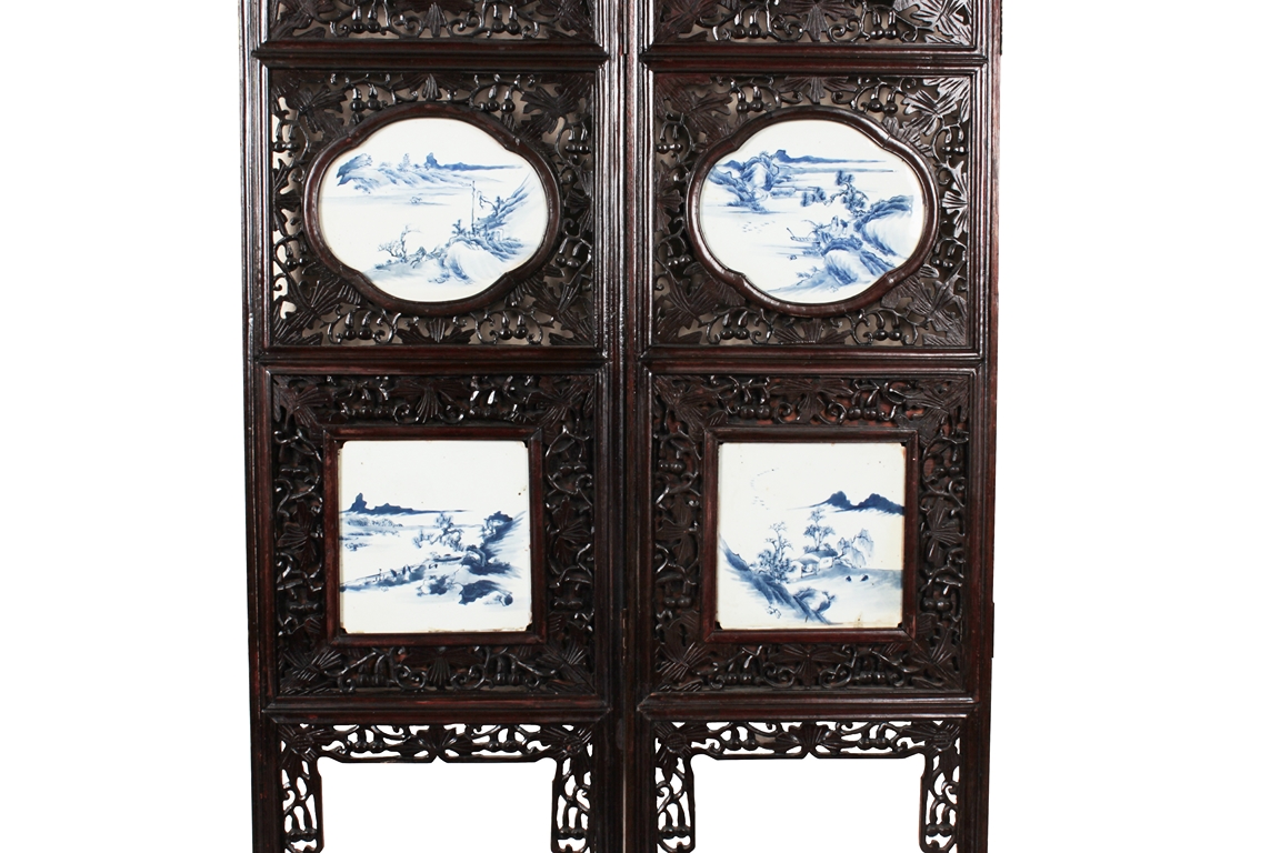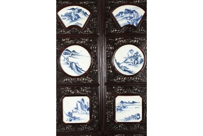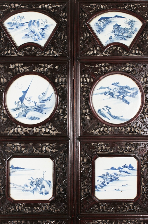 The frames exquisitely pierce carved with flower and vine patterns with gourds in between, each panel inset with four blue and white porcelain plaques, in order of fan, round, square, and concave oval shape, each depicting a different river side and mountain landscape scene. Qing Dynasty period. Provenance: Estate of Thomas Chang of United States