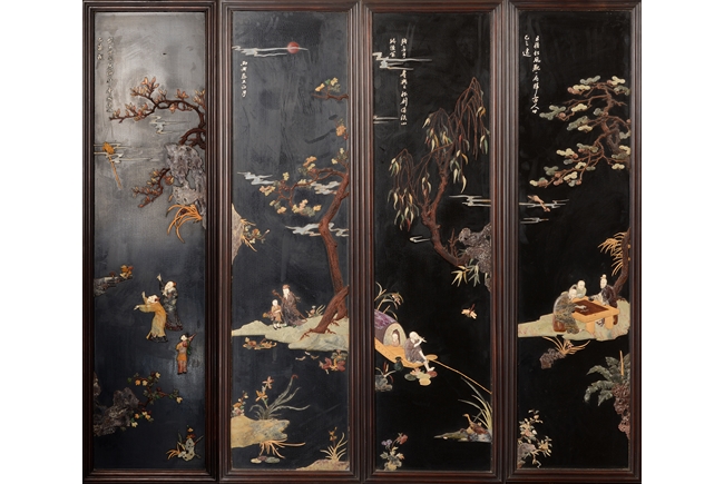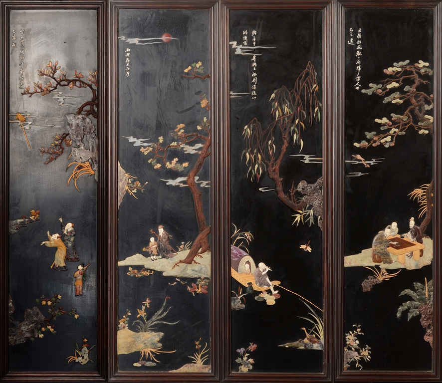 A set of four hanging panels with carved wood frame and inset with jade stones, bones, ivory, shoushan stones, huangyangmu boxwood, agate, jadeite, and qingtian stones, depicting the scholars in a garden, mountains, river, and forest settings. Each panel is embedded with Chinese colophon. Republic period.
