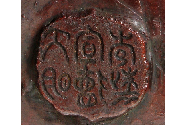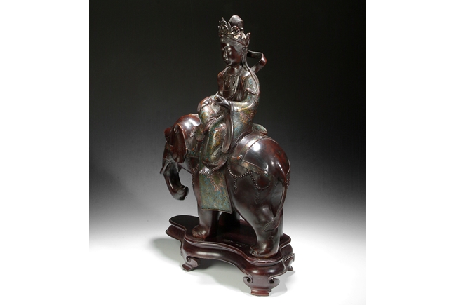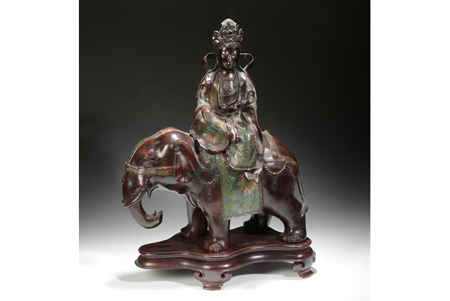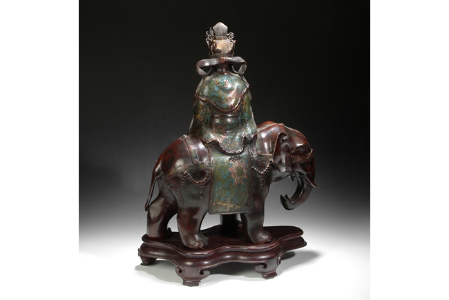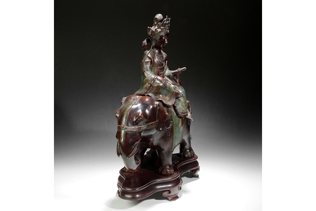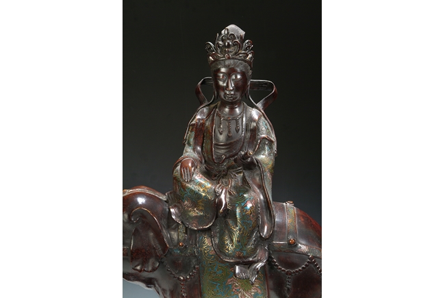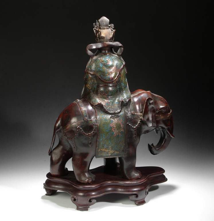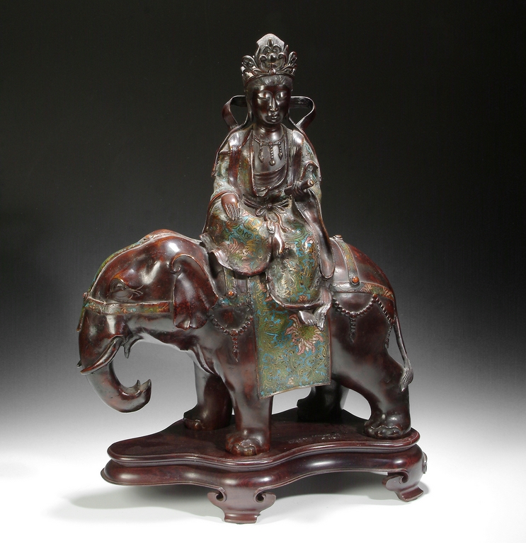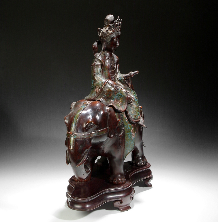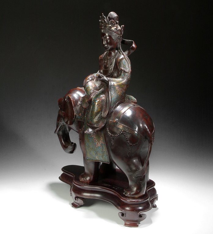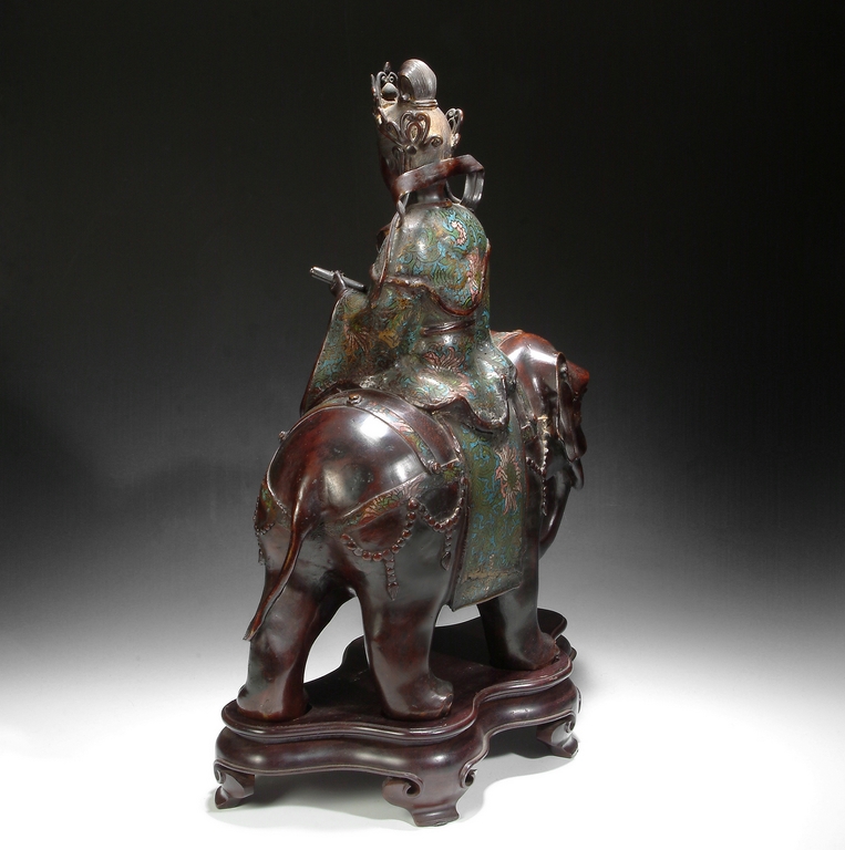 This elaborately bronze cast Puxian Bodhisattva is shown riding upon an elephant. Wearing a long and voluminous robe, her chest is exposed with adorned necklace. Her face is depicted with a serene expression, below a tall chignon under the adorned tiara. A ribbon emanating from back flanks her shoulder. The robes and the saddle cloth on elephant are delicately enamelled with stylized foliate scrolls and chrysanthemum. The piece is completed with an original hardwood base. Qing Dynasty period.