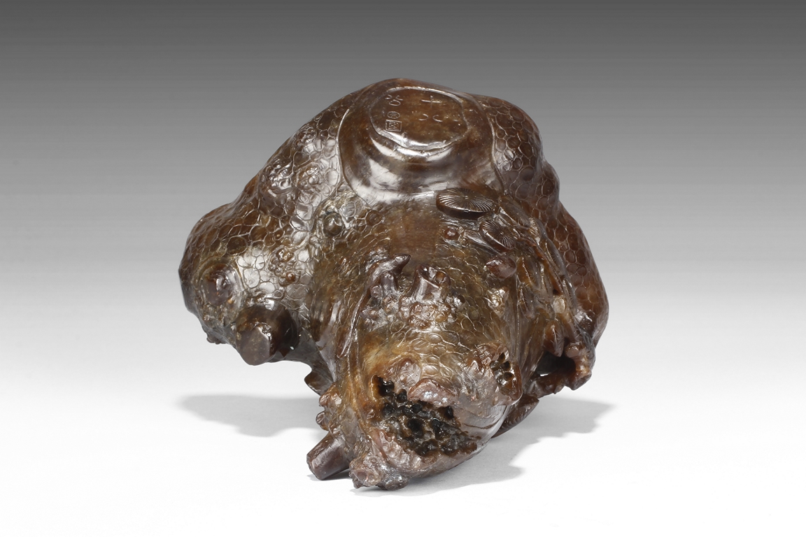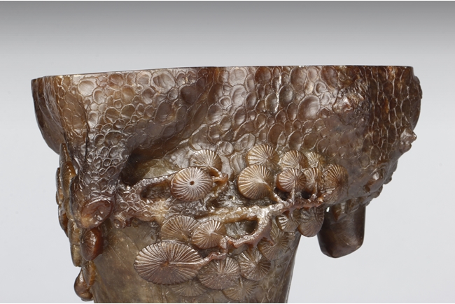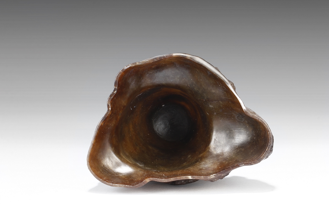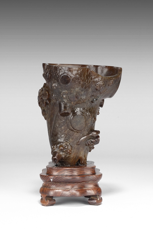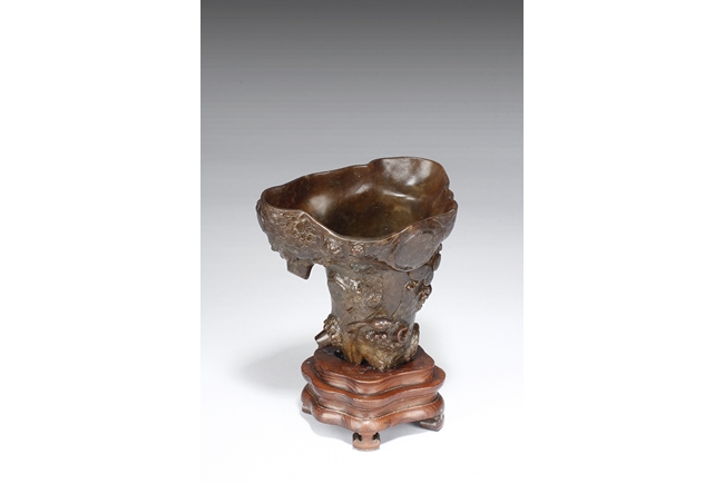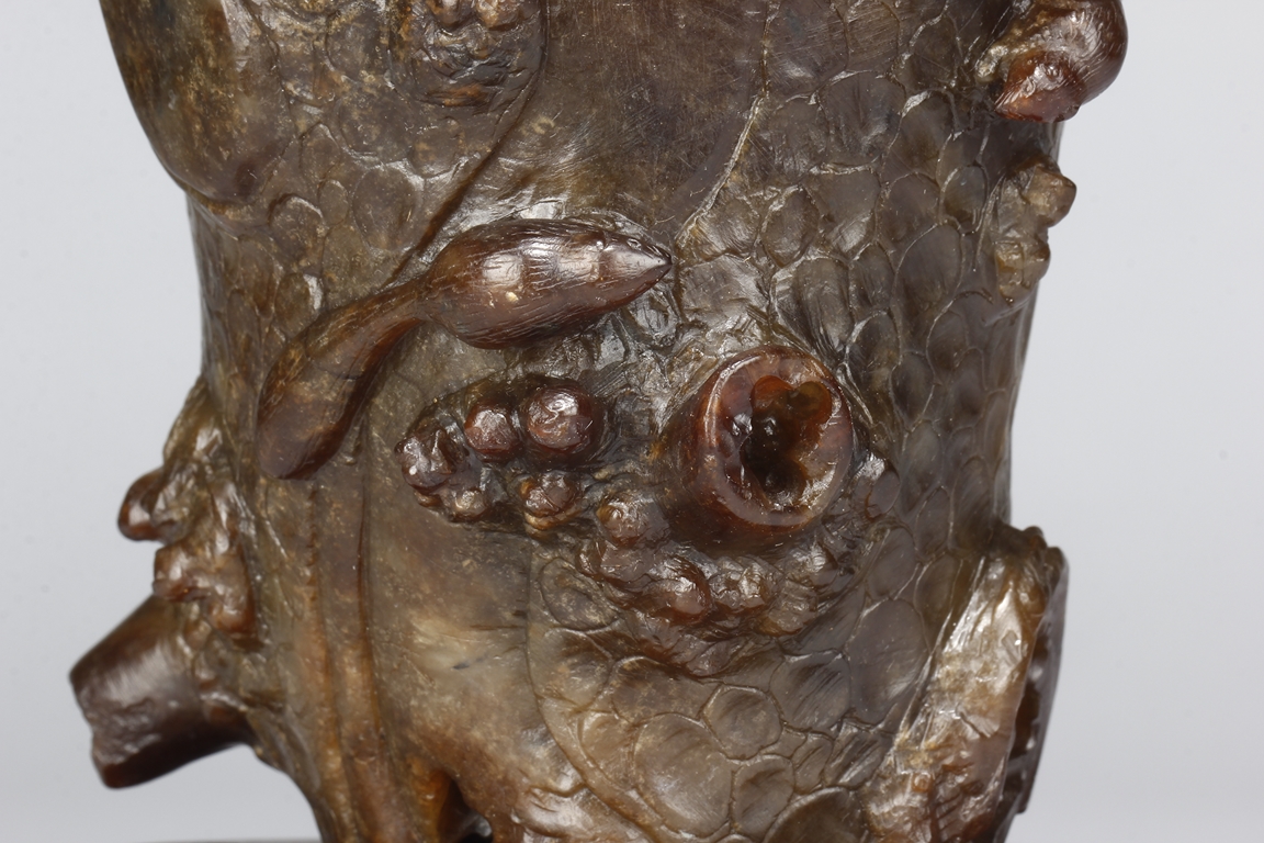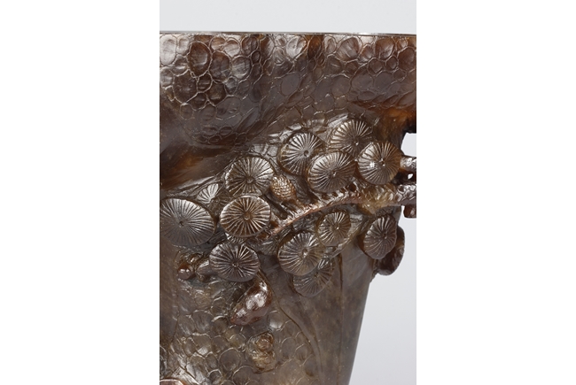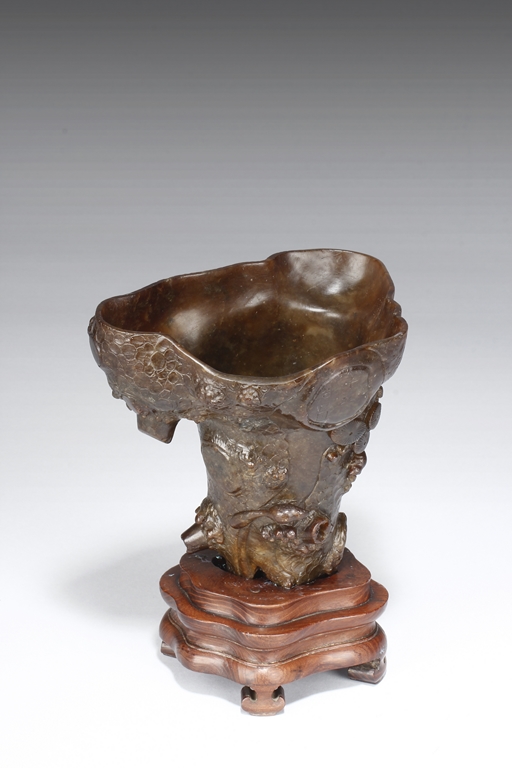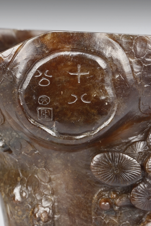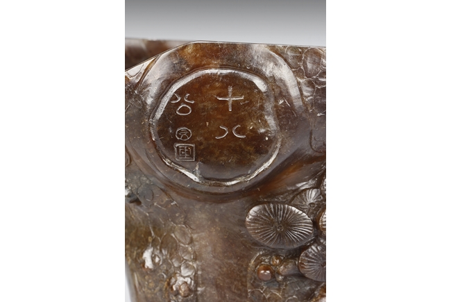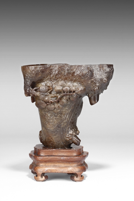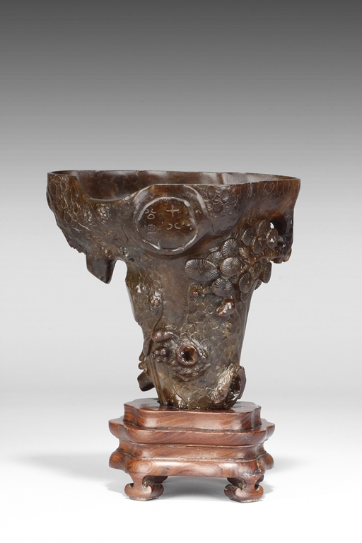 Of naturalistic design, the libation cup delicately carved in the shape of pine trees, with stumps, branches, pine cones, and squirrels mounted on the surface, signifying longevity, the jade stone of dark brownish color, artist signature on the side. Includes en-suite wooden stand. Qing Dynasty period.