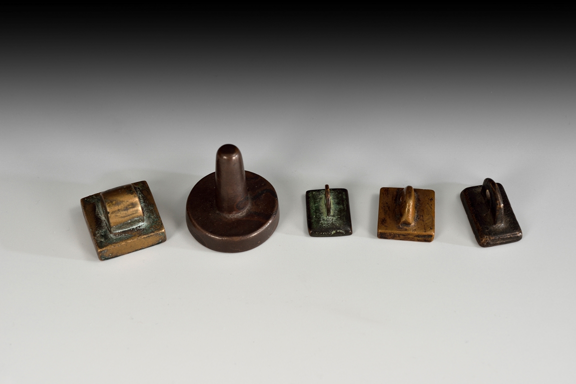 This set comprises of five antique bronze seals of various ages and forms, and each is carved with different Chinese characters on the base. Various dynasties.