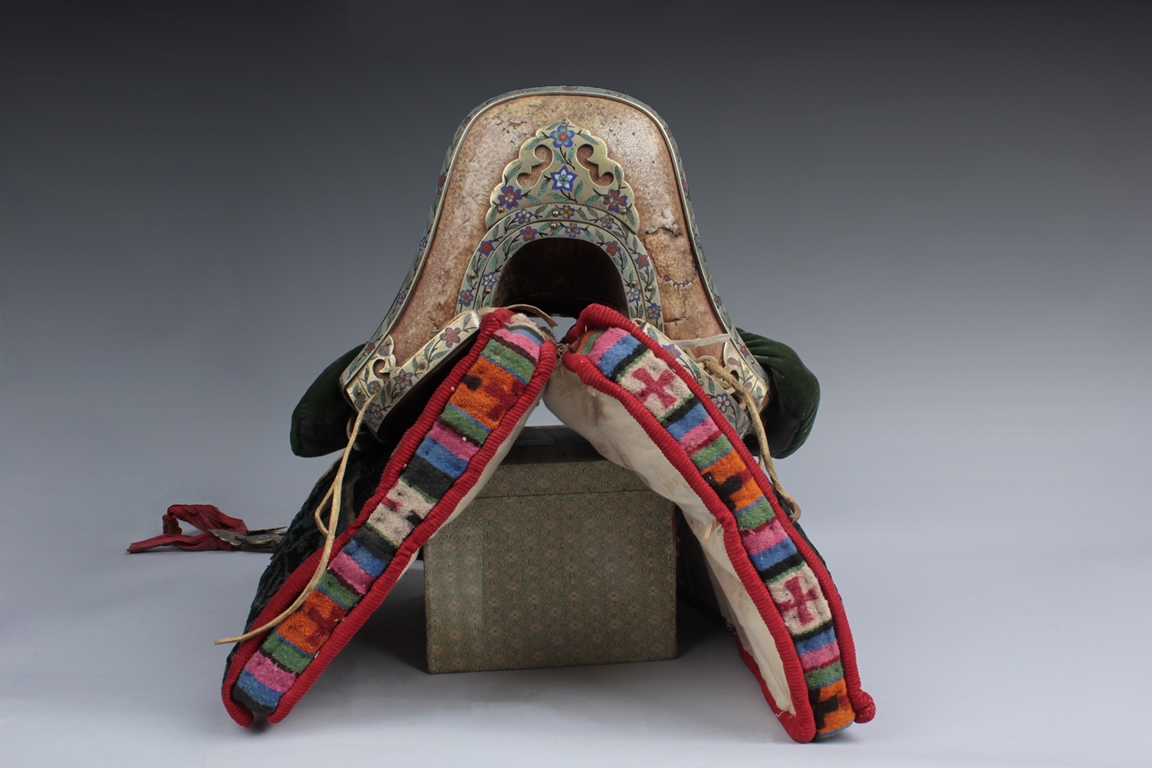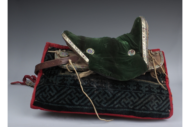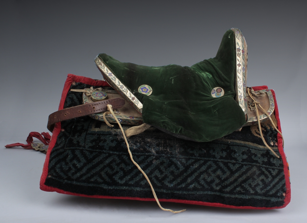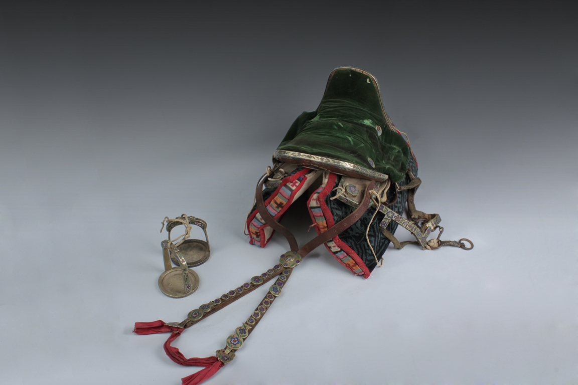 Of typical form with raised knop at the front, the curved wooden frame with padded mounts, bordered with raised strap-work bands, the seat of the saddle covered with green velvet embroidered with metal-thread floral decoration, cloth flaps on either side also with sewn with delicate patterns against red border and colored padding, one leather strap and two metal buckles, also with floral decorations. Republic period.