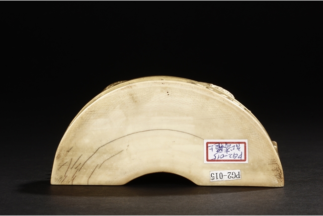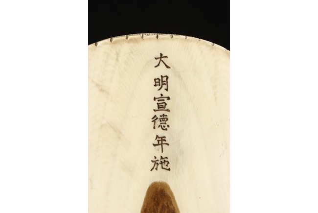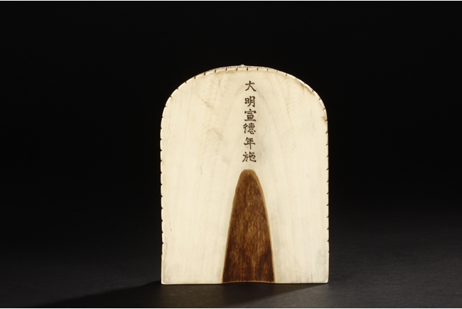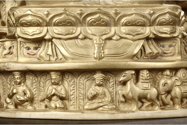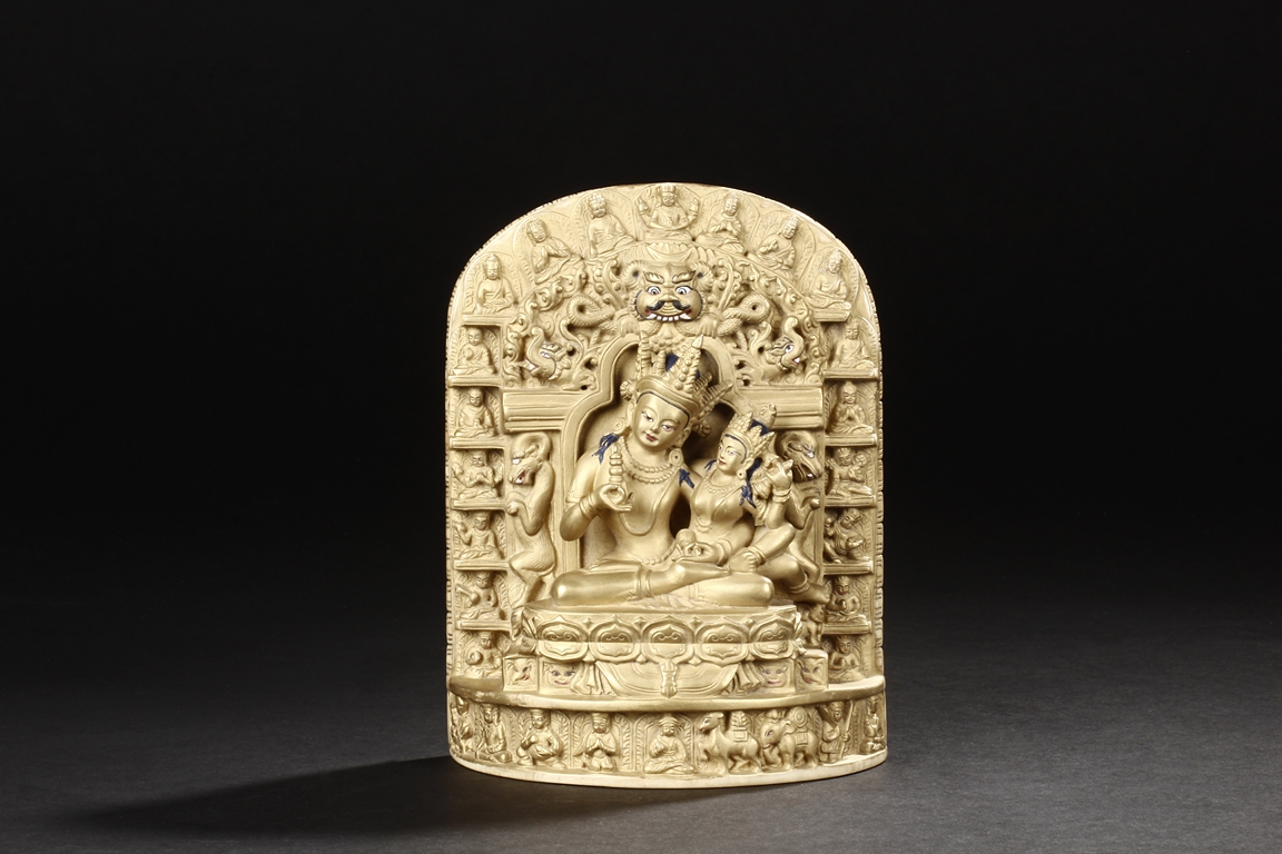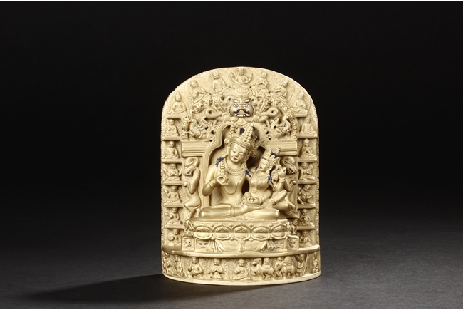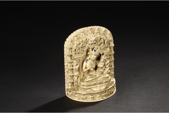 The panel depicts a Bodhisattva, seated in dhyanasana on top of a lotus pad, holds a ritual ornament in right hand, left hand in mudra while wrapped around a female attendant, both wearing crowns, necklace, and robes, the panel behind them depict elephants, dragons, and mythical beasts, surrounded by many Arhats on the side and bottom, the ivory painted gold in front, the back with six character "XUANDE" mark. Ming Dynasty period.