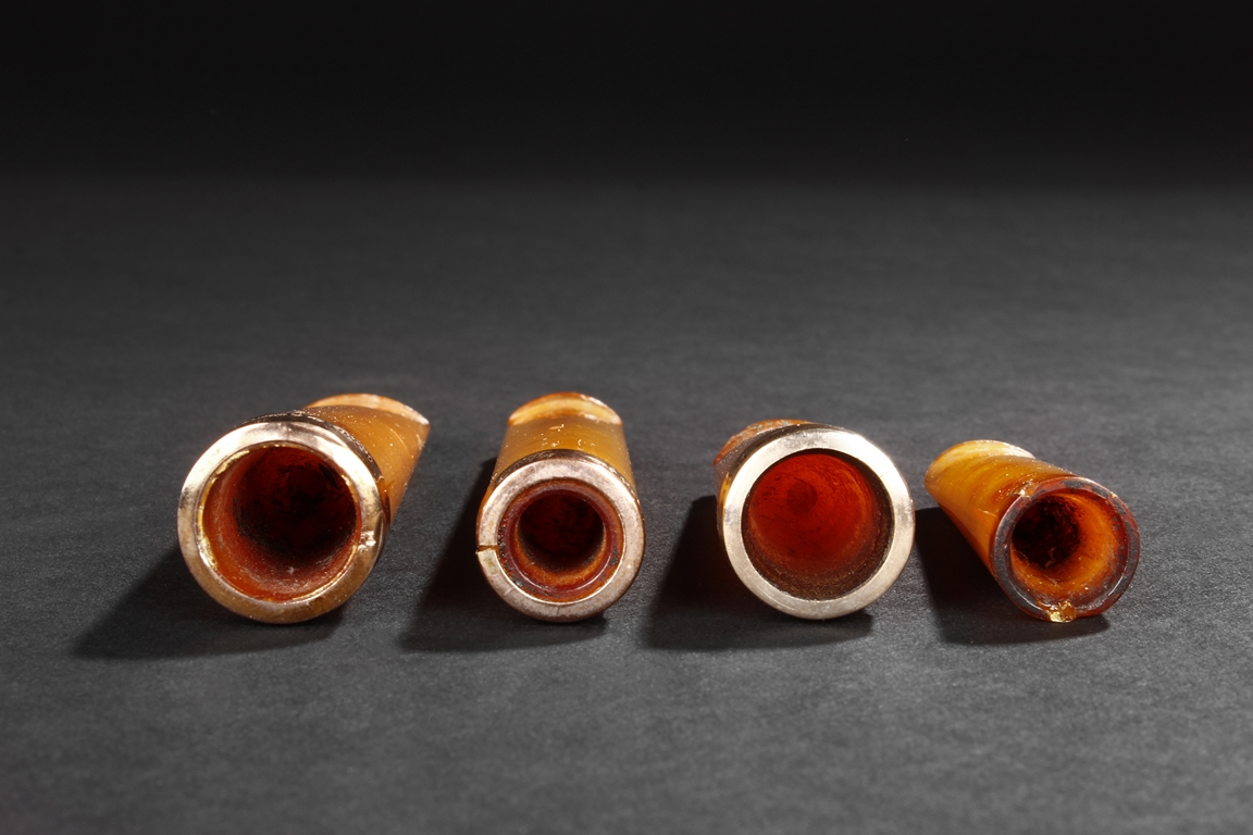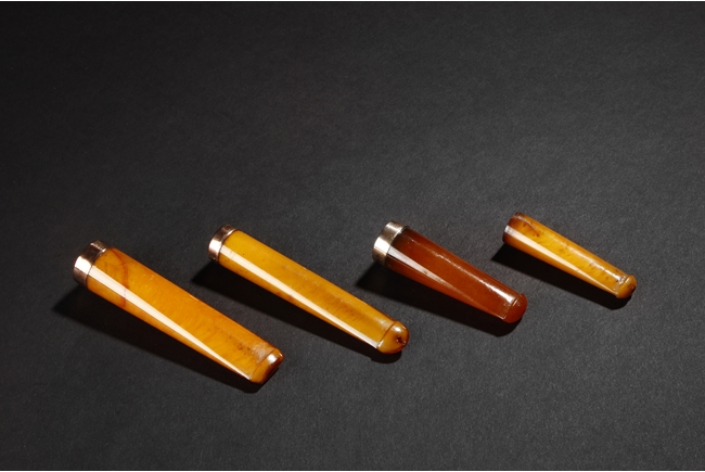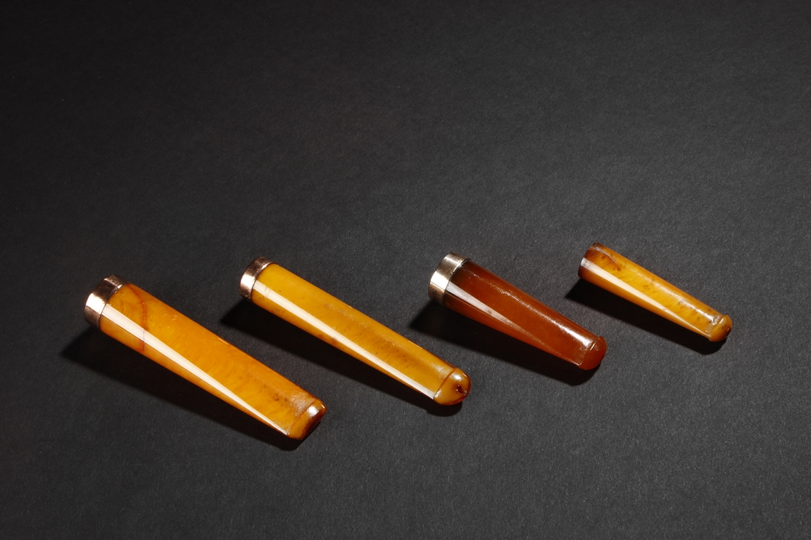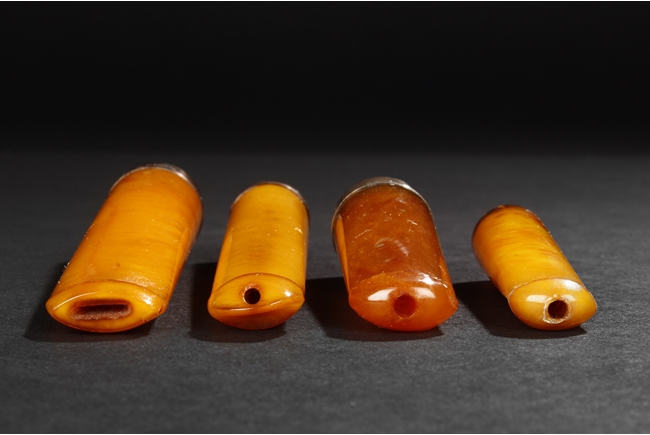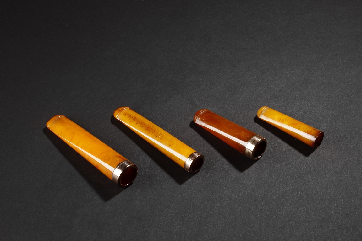 Of varying size and color, the amber pieces were used on smoking pipes as mouth pieces, three of them with their original container.