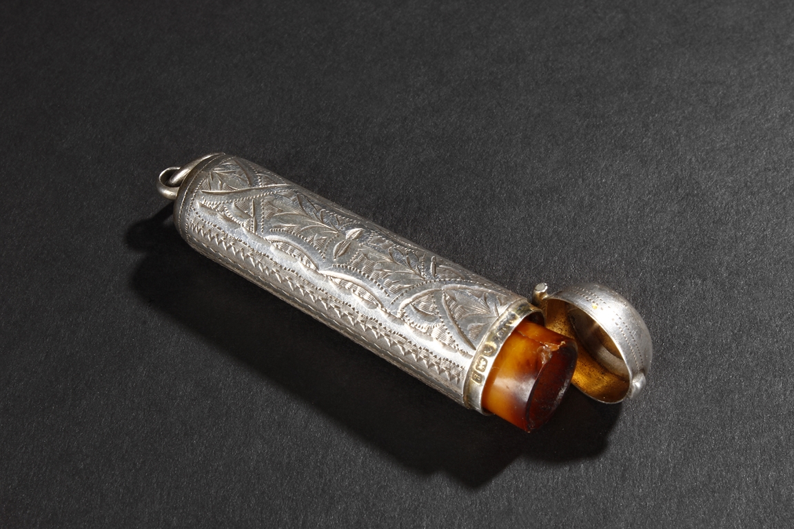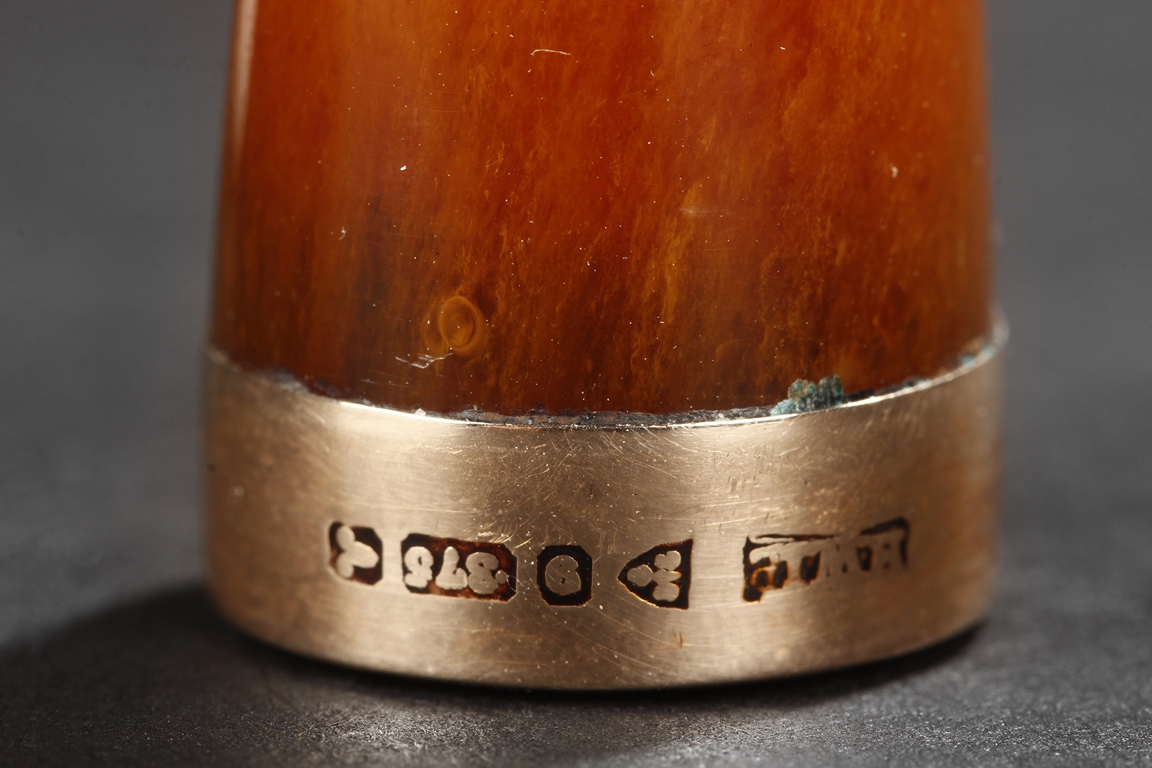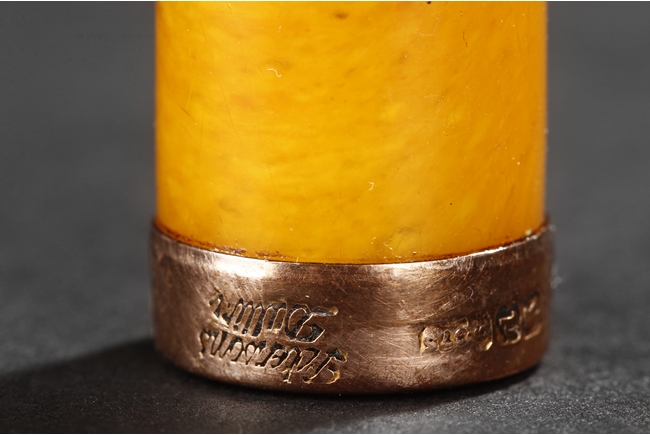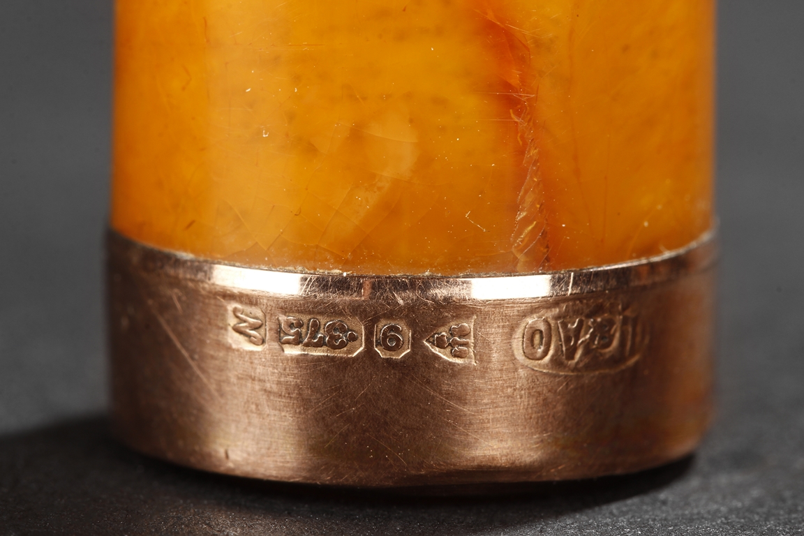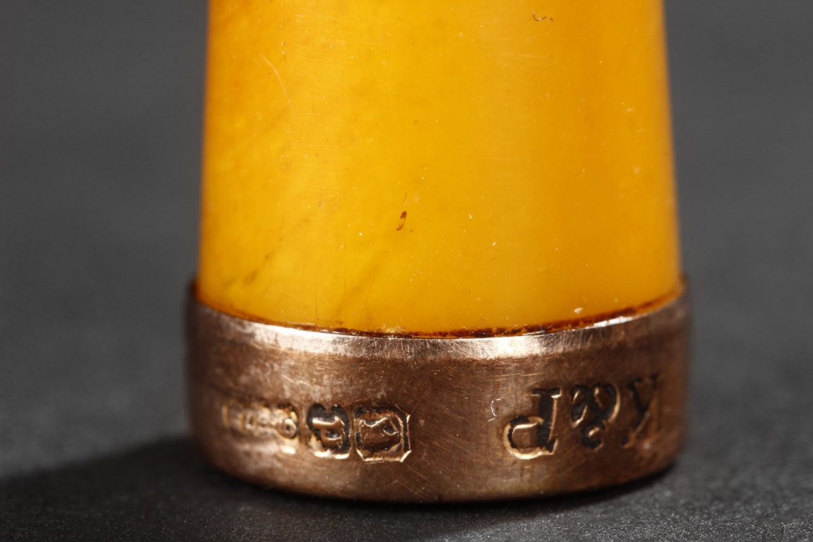 Of varying size and color, the amber pieces were used on smoking pipes as mouth pieces, three of them with their original container.